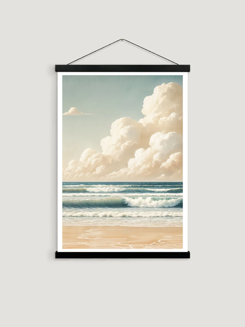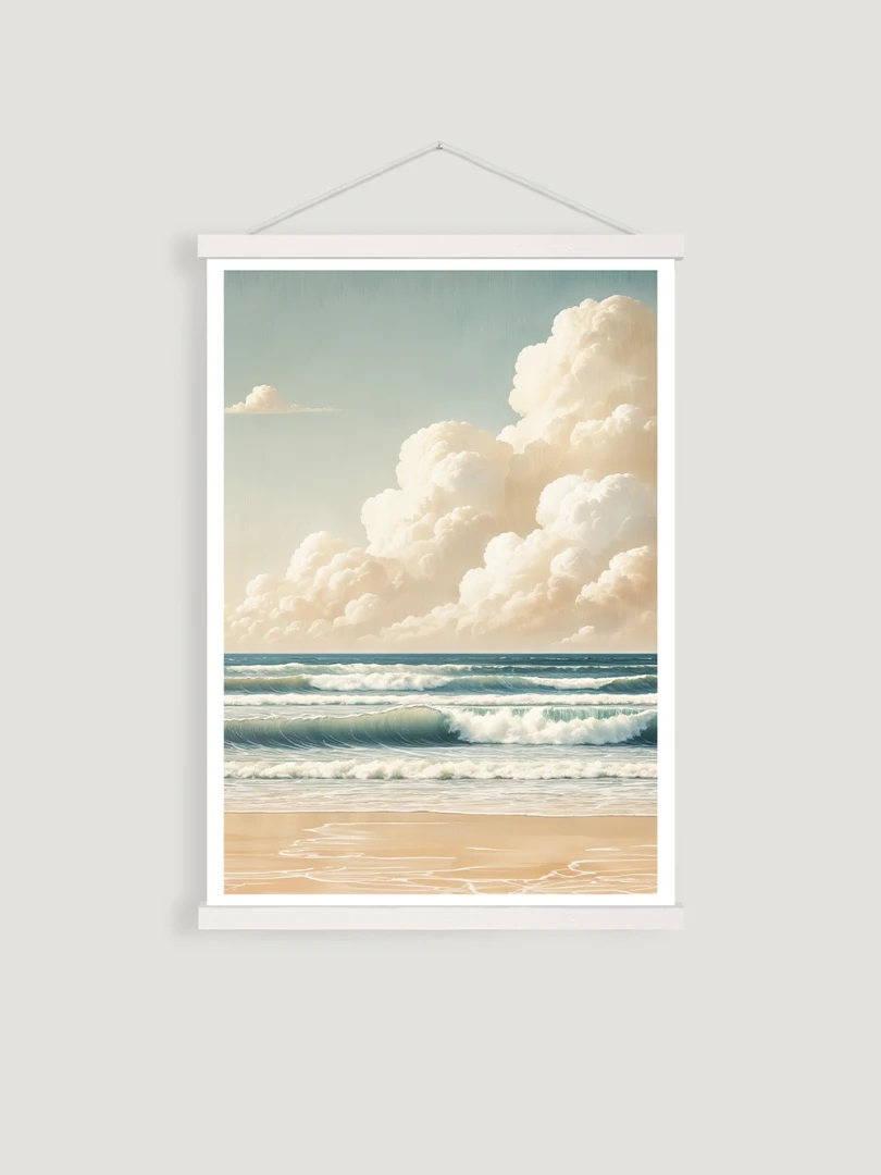 Tento print krásne vyobrazuje pokojné more v minimalistickom štýle, pod žiarivým obzorom. S paletou teplých béžových a jemných krémových farieb vytvára pokojnú dennú scénu, ktorá vyvoláva pocit harmónie a uvoľnenia.