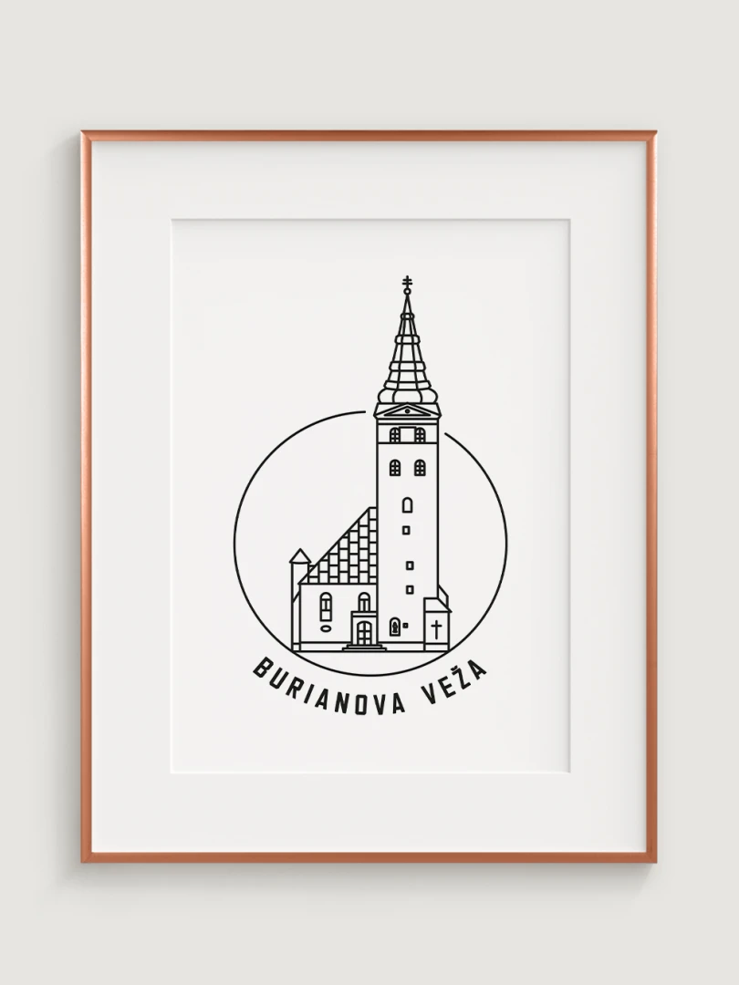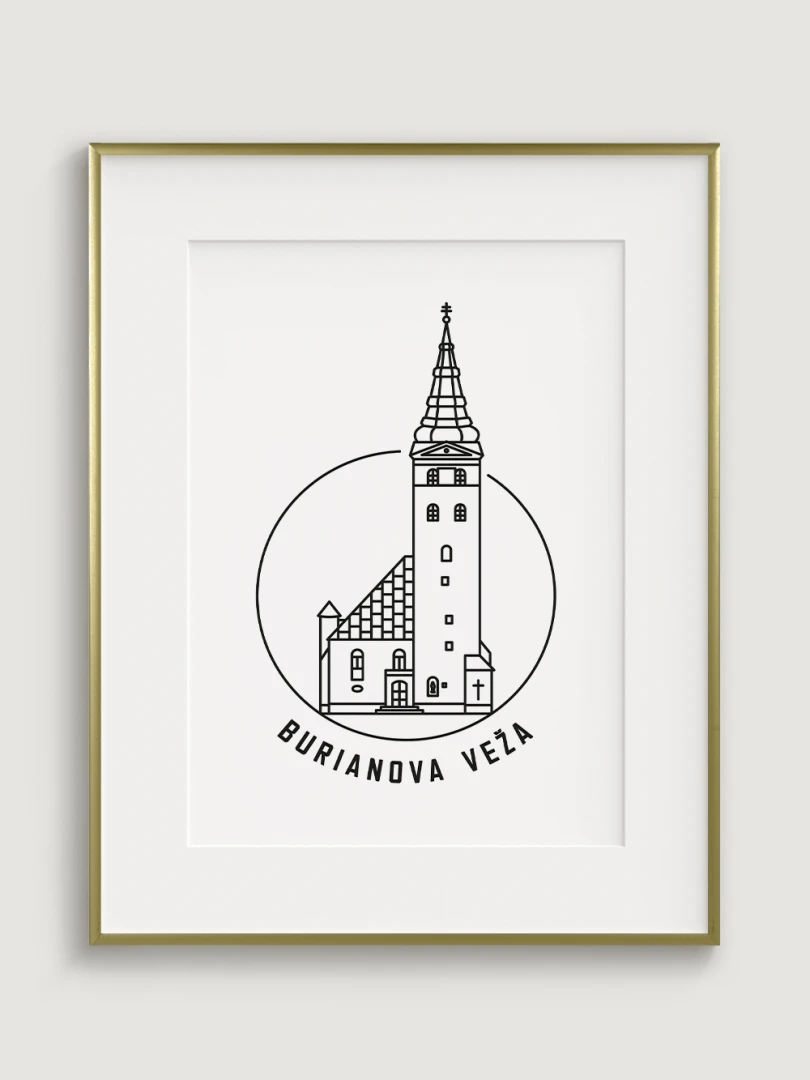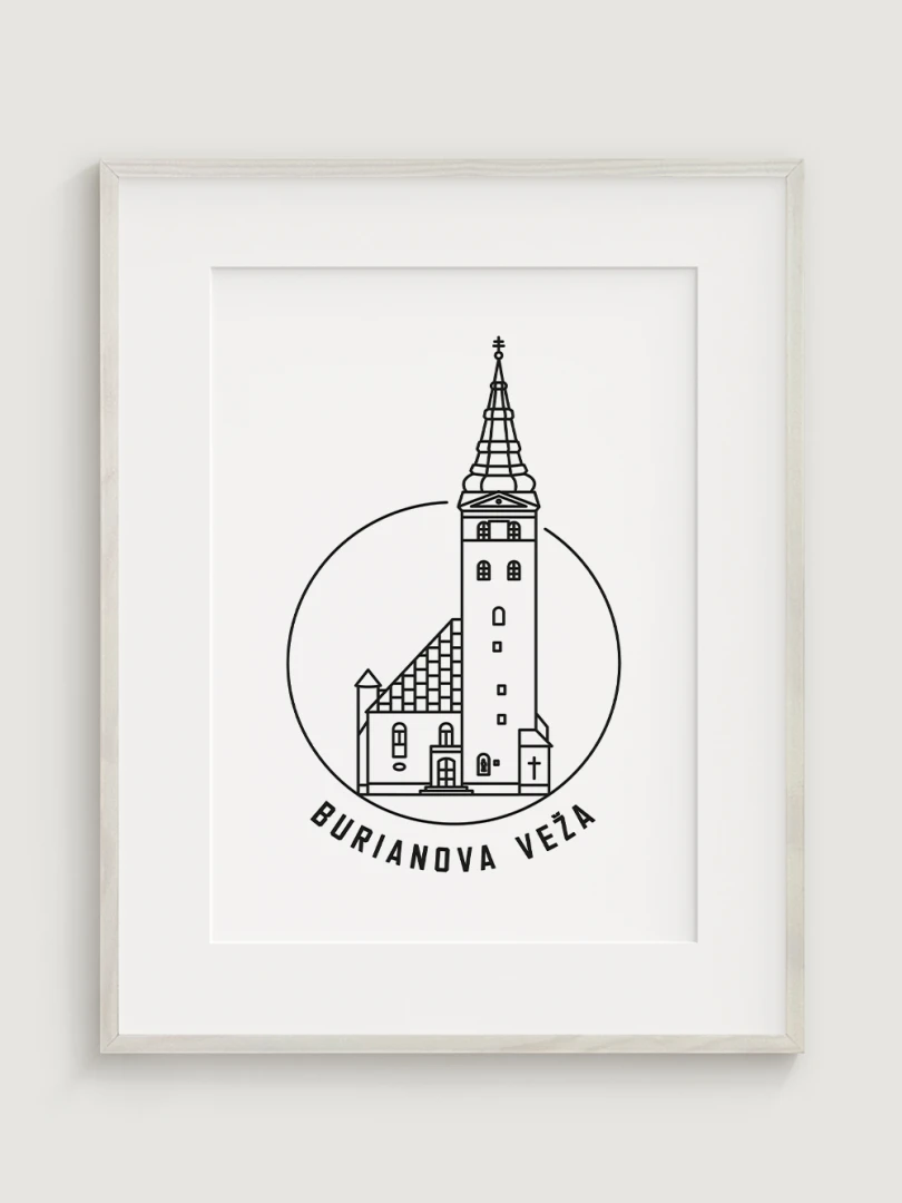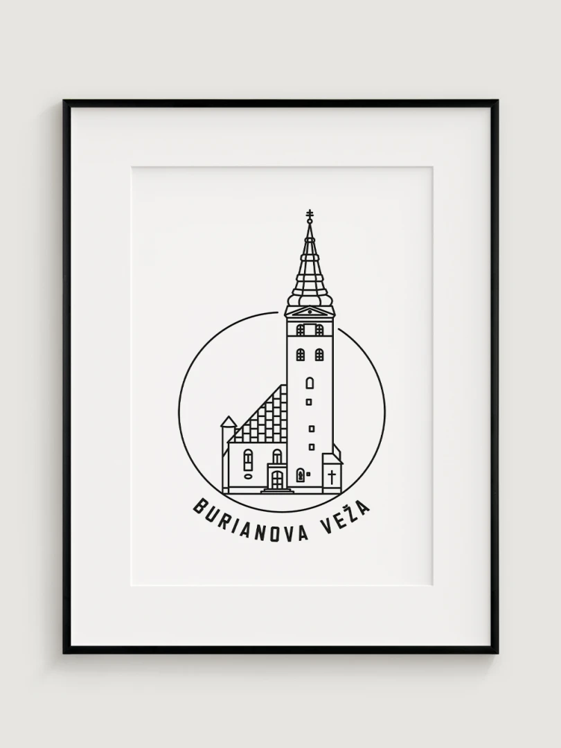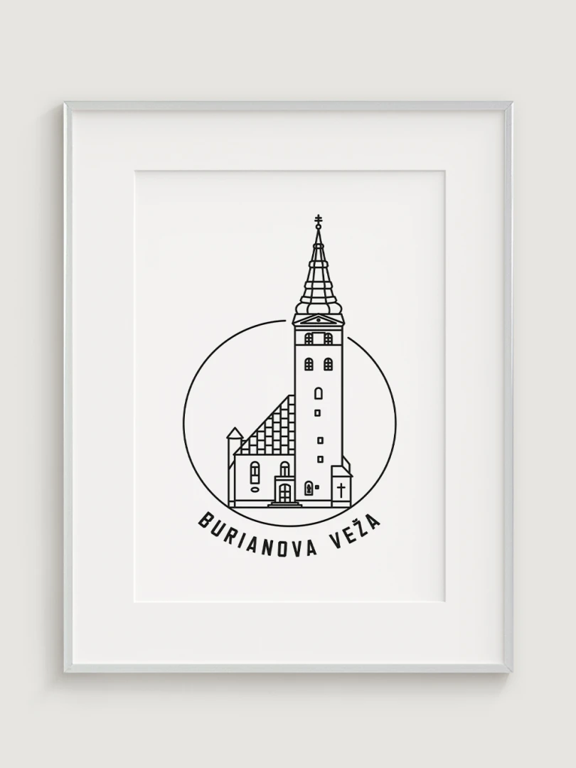 Tento print predstavuje štýlizované, minimalistické zobrazenie Burianovej veže v Žiline, architektonickej pamiatky, ktorá spája stredoveký ráz so súčasným pohľadom na históriu. Vypracovaný s jemnou čiernou linkovou kresbou na kvalitnom papieri, táto ilustrácia verne zachytáva silné línie a detaily veže v nadčasovom a elegantnom štýle.