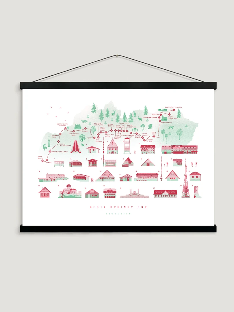 Tento print zachytáva charakteristickú líniu ikonickej trasy Cesty SNP, zdôraznenú čistým dizajnom a výraznou farebnosťou. Či už pre váš domov, kanceláriu alebo ako darček, tento print prináša kúsok histórie a odvahy Slovenska do akéhokoľvek priestoru jedinečným spôsobom.