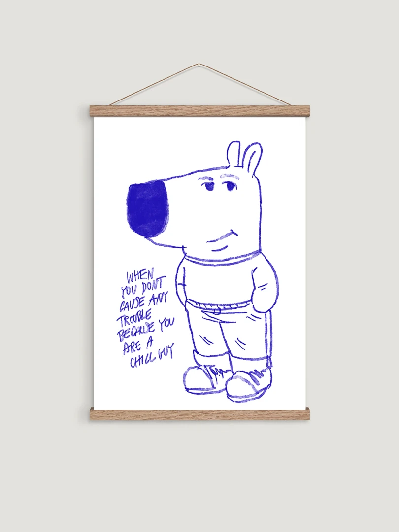 Keď nič neriešiš, nevyvolávaš problémy a si jednoducho chill guy – tento print dokonale vystihuje túto energiu. Hravá modrá ilustrácia pohodového psíka v ležérnom outfite v kombinácii s odľahčeným ručne písaným textom vytvára vtipný a uvoľnený vizuál, ktorý sa hodí do každého priestoru s nadhľadom.