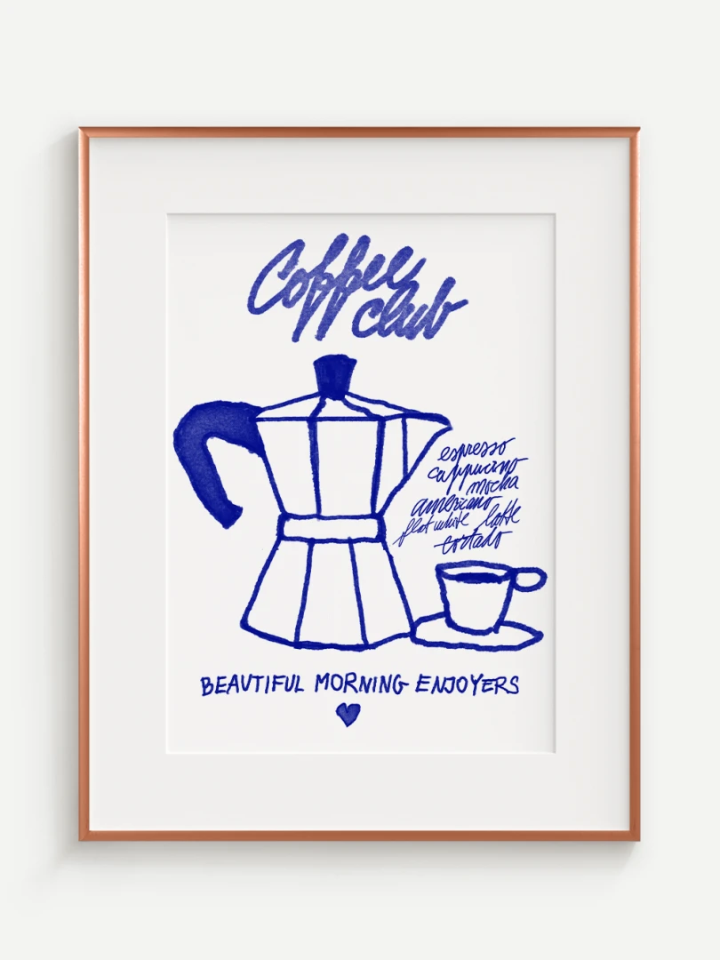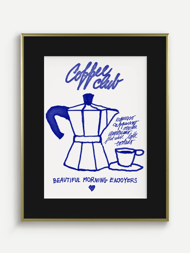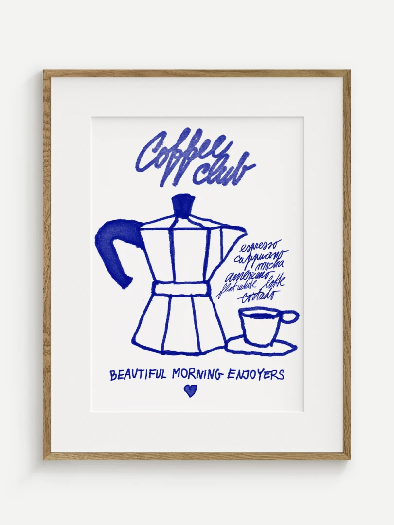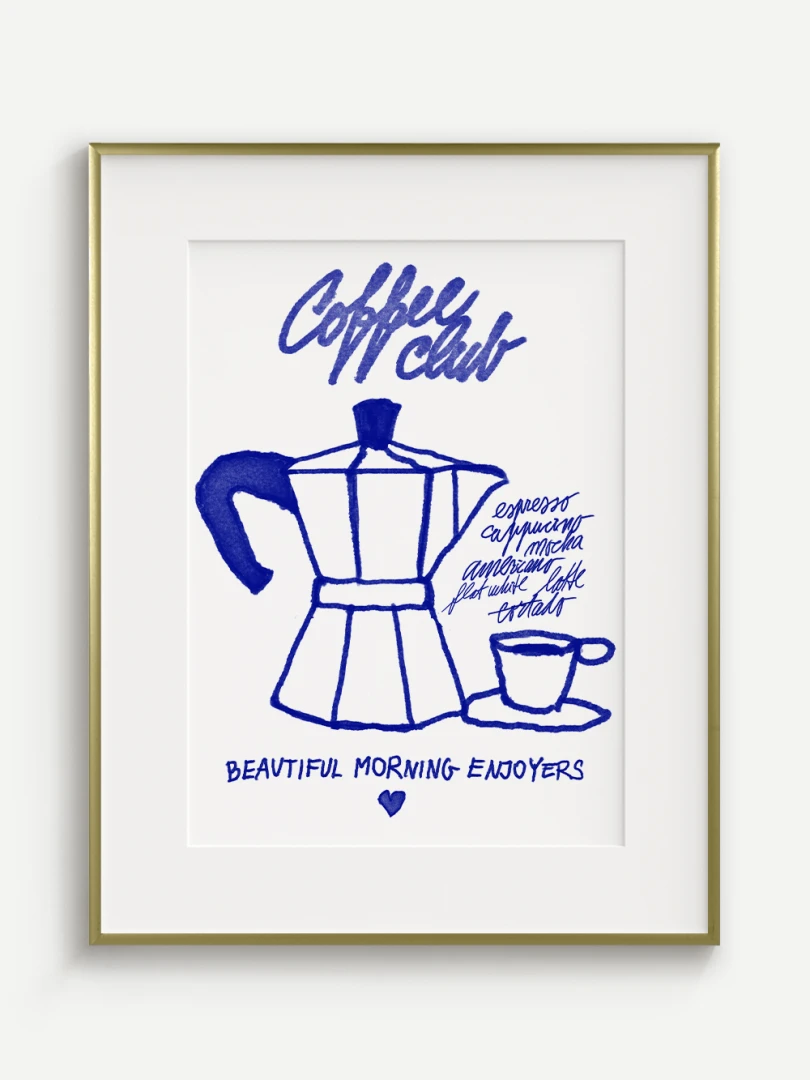 Tento umelecký print prináša atmosféru ranného kávového rituálu do vášho domova. Ilustrácia klasickej moka kanvice spolu s kávovou šálkou je vytvorená v hravom, ručne kreslenom štýle s výraznými modrými líniami. Dopĺňajú ju názvy obľúbených kávových nápojov a nápis "Coffee Club", ktorý evokuje komunitu milovníkov kávy a príjemné spoločné chvíle pri šálke espressa.