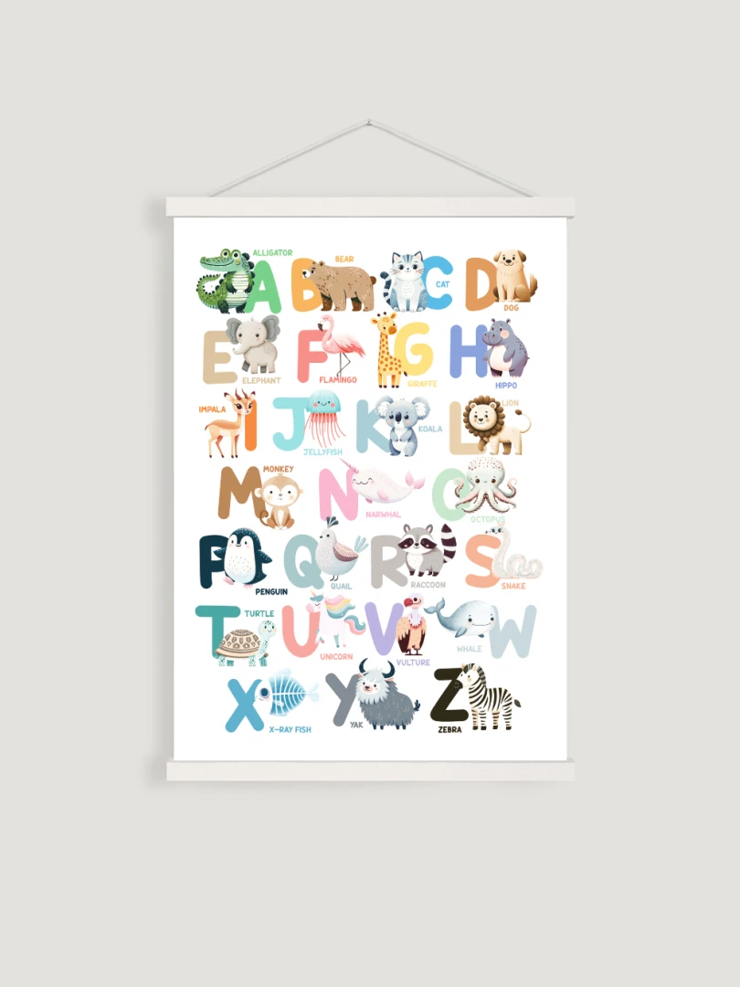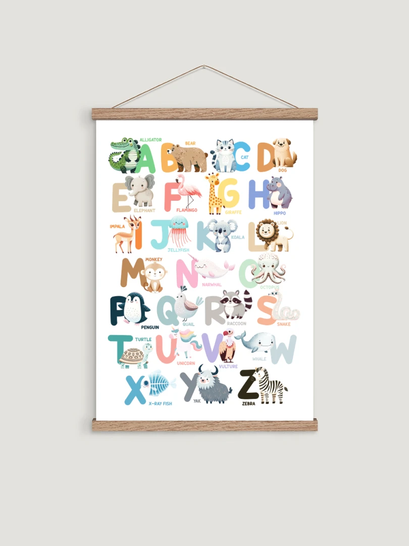 Každé písmeno je zastúpené čarovným zvieraťom, od aligátora po zebru, čo robí učenie zábavným a vizuálne príťažlivým. Tento farebný print je ideálny do detských izieb, herní alebo tried, prebudzuje zvedavosť.