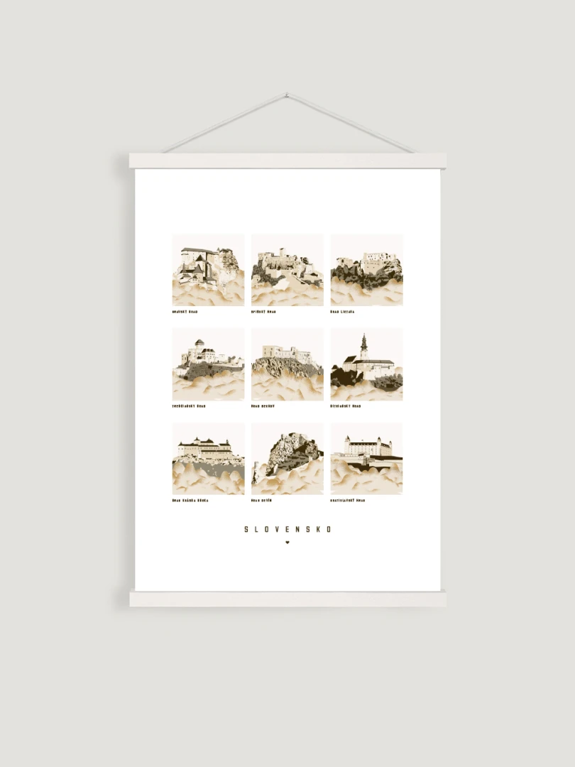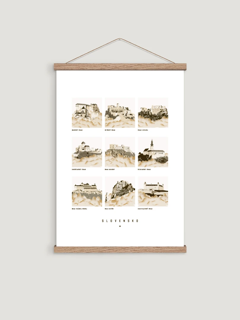 Tento print krásne zachytáva architektonickú eleganciu a historický význam každého hradu prostredníctvom série detailných ilustrácií, ponúkajúc okno do minulosti a oslavujúc kultúrne dedičstvo Slovenska.