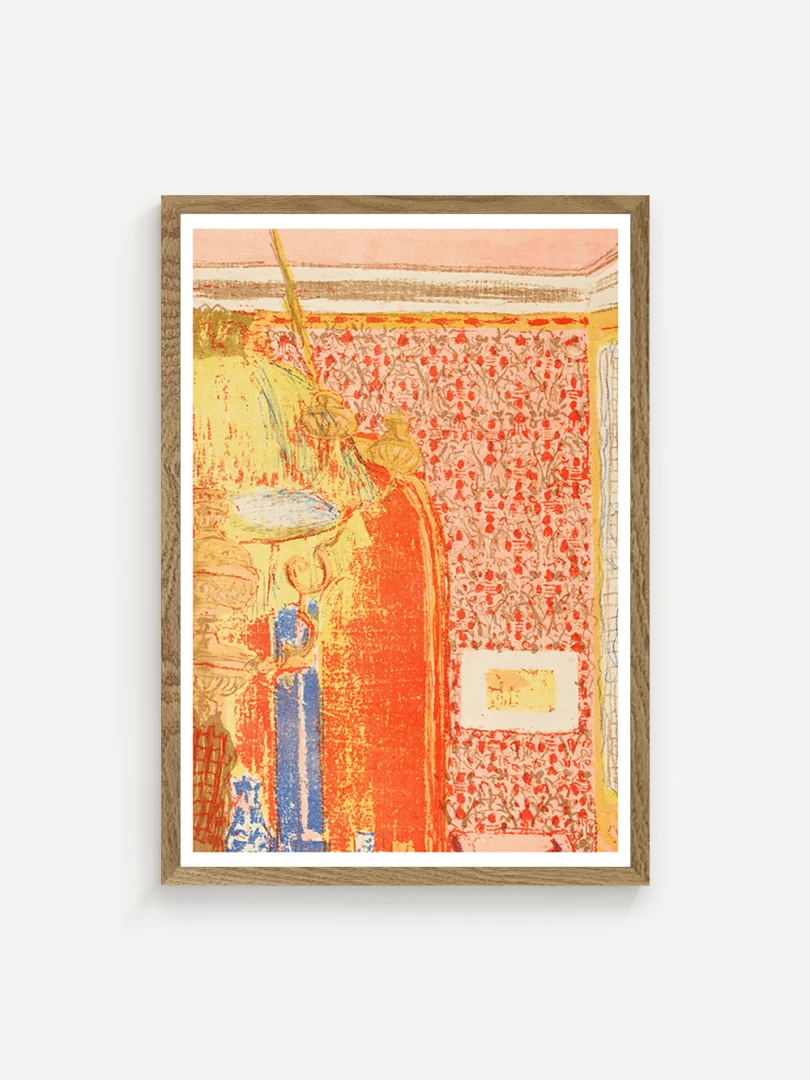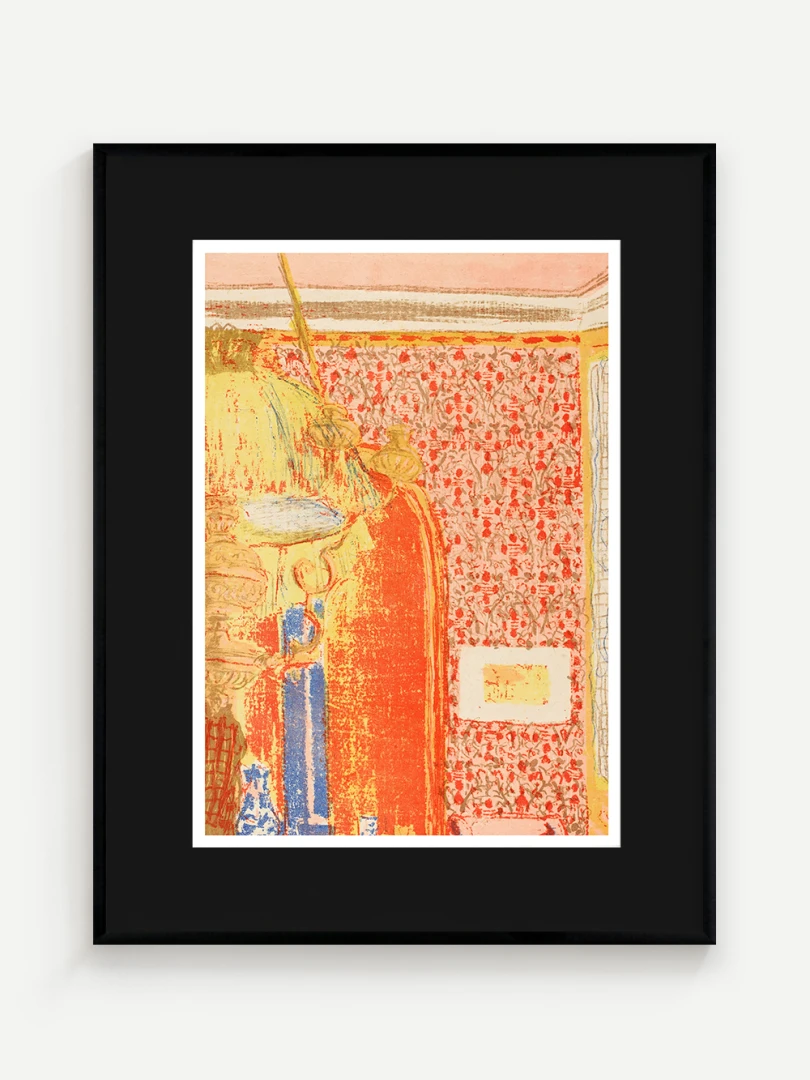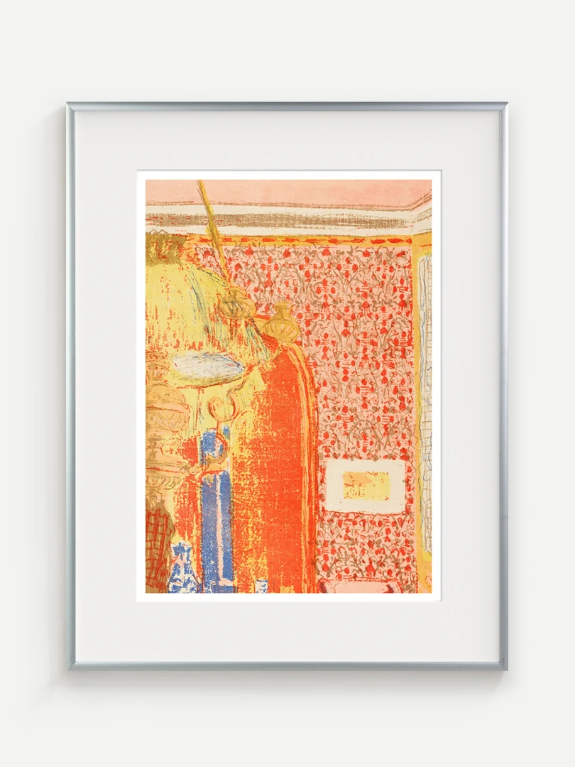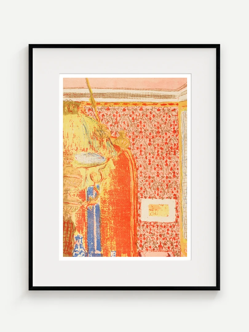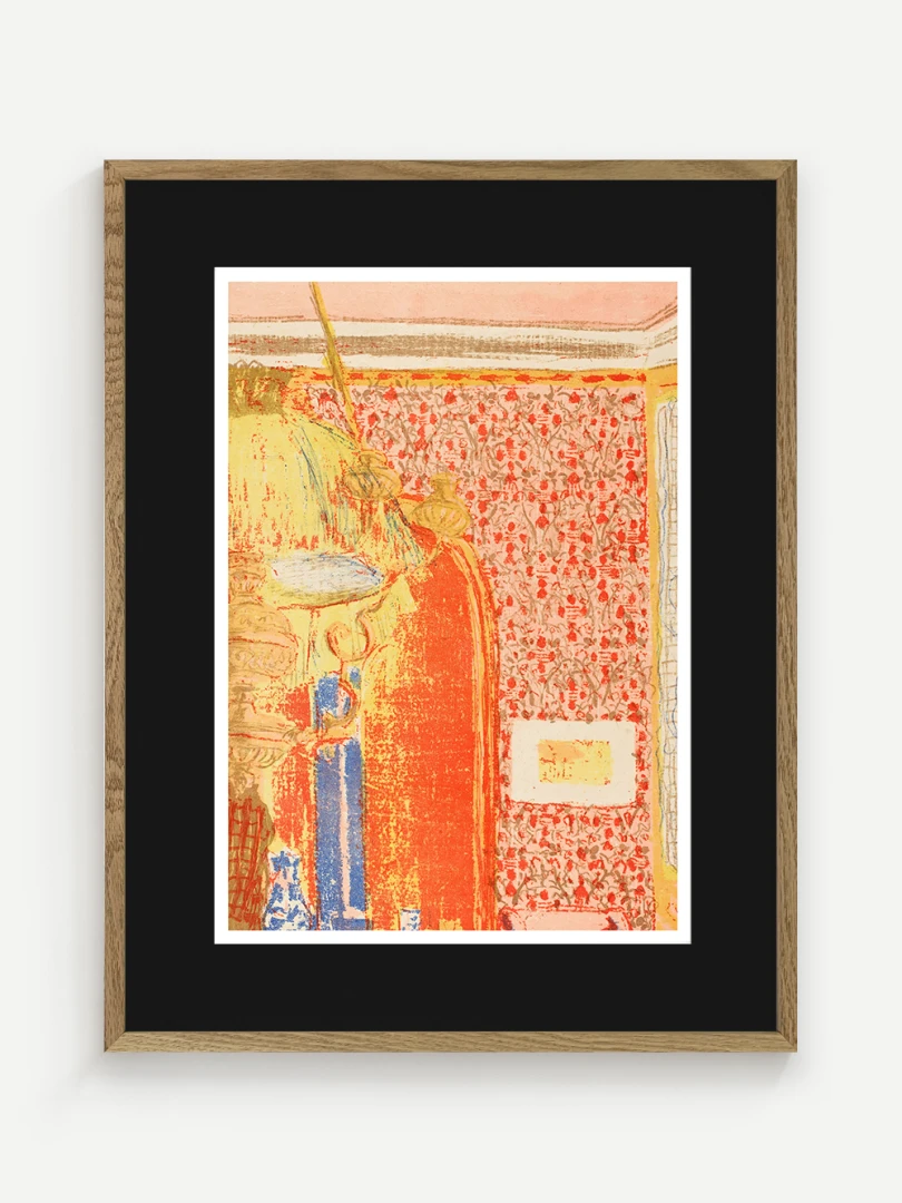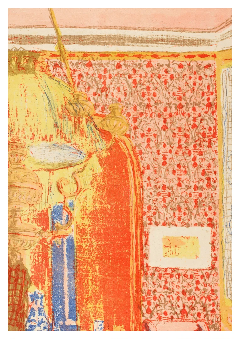Tento print vychádza z farebnej litografie Interiér s ružovou tapetou III, ktorú Vuillard vytvoril v roku 1899 ako súčasť série Paysages et Intérieurs. Zobrazuje stenu pokrytú výraznou ružovou tapetou s dekoratívnym vzorom. Scéna je rozdelená dverami, cez ktoré možno nazrieť do ďalších miestností s postavami, čím Vuillard vytvára vrstvený a hĺbkový pohľad na súkromný priestor.