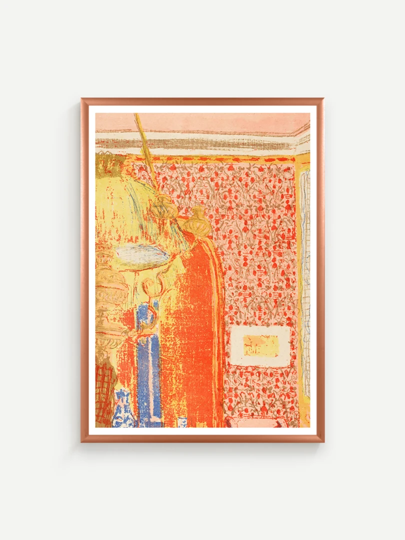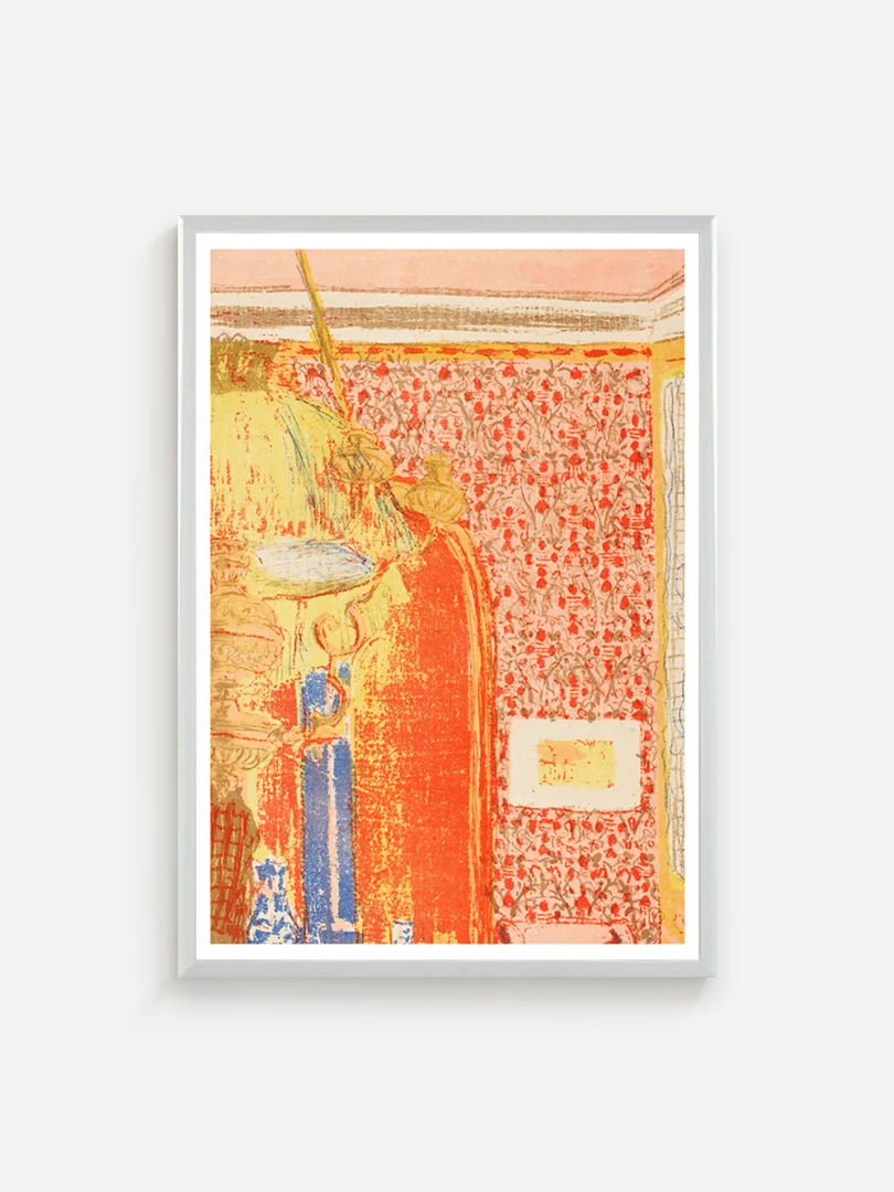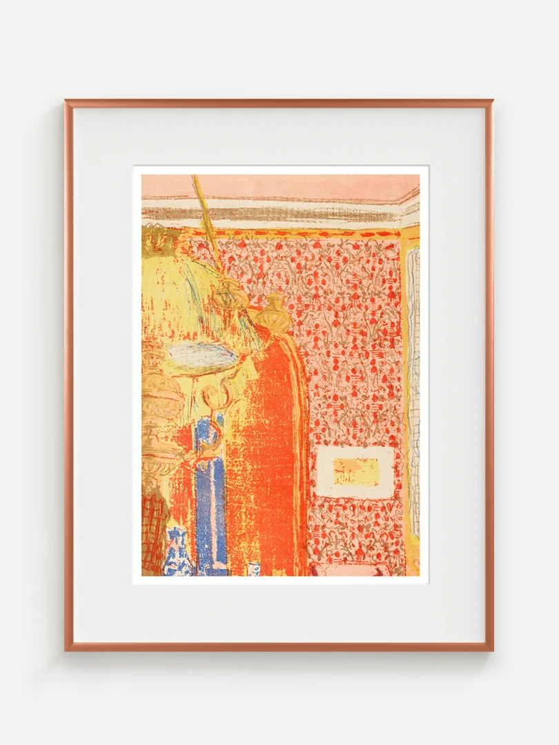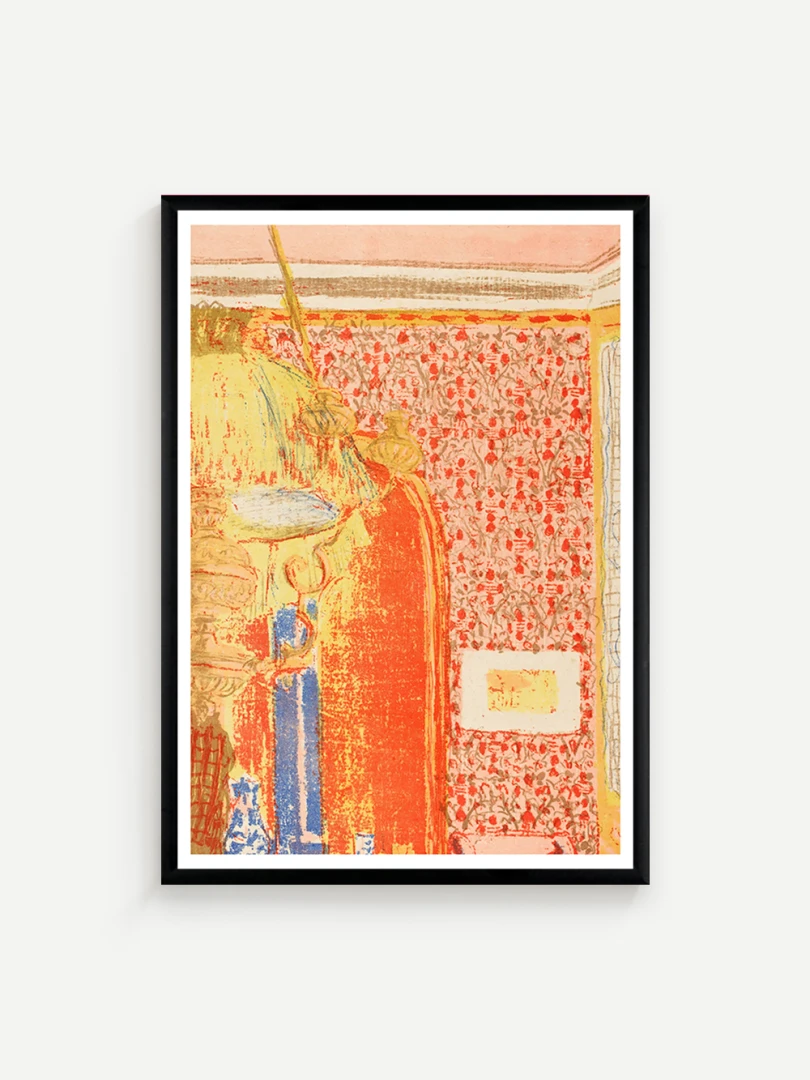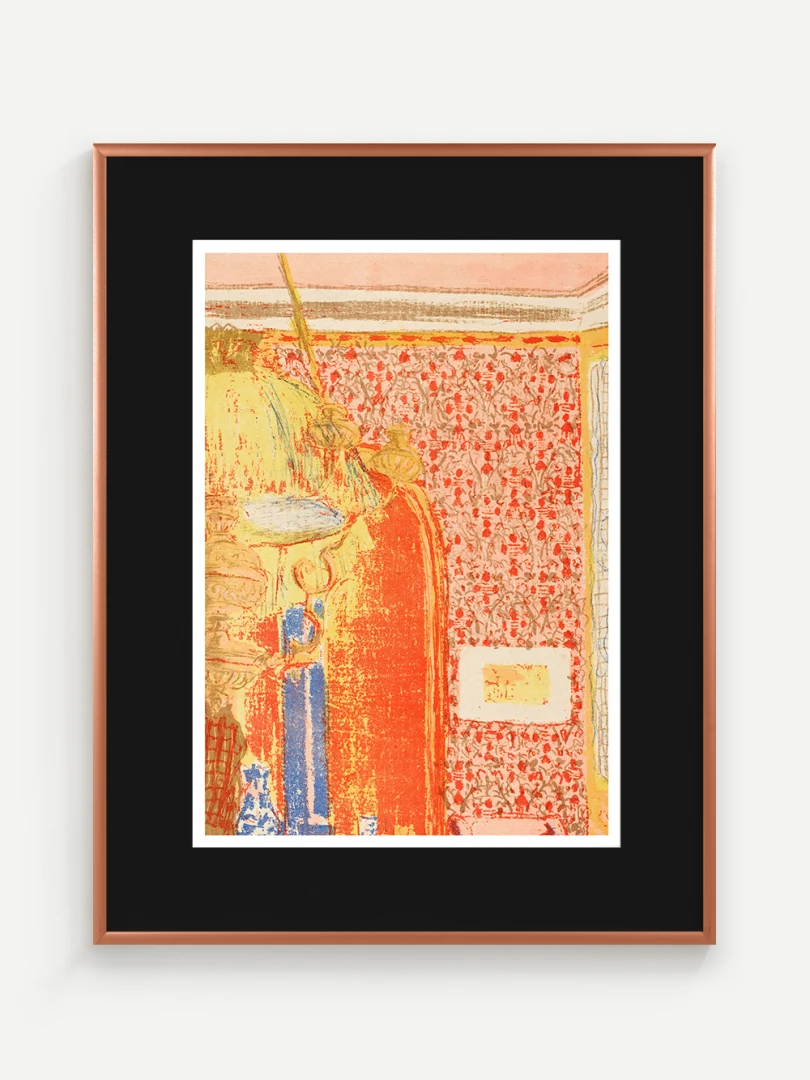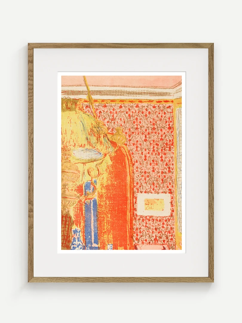 Tento print vychádza z farebnej litografie Interiér s ružovou tapetou III, ktorú Vuillard vytvoril v roku 1899 ako súčasť série Paysages et Intérieurs. Zobrazuje stenu pokrytú výraznou ružovou tapetou s dekoratívnym vzorom. Scéna je rozdelená dverami, cez ktoré možno nazrieť do ďalších miestností s postavami, čím Vuillard vytvára vrstvený a hĺbkový pohľad na súkromný priestor.