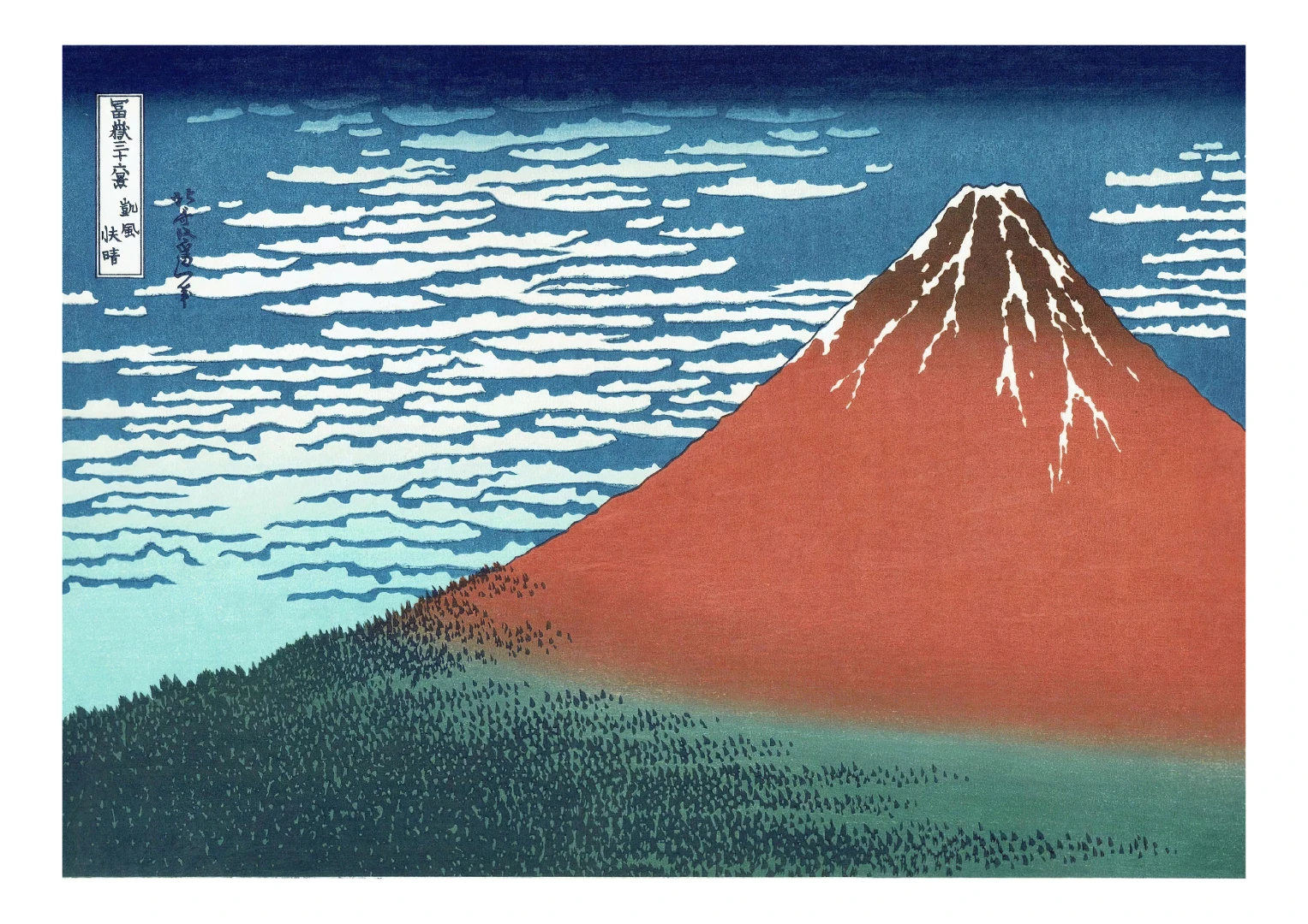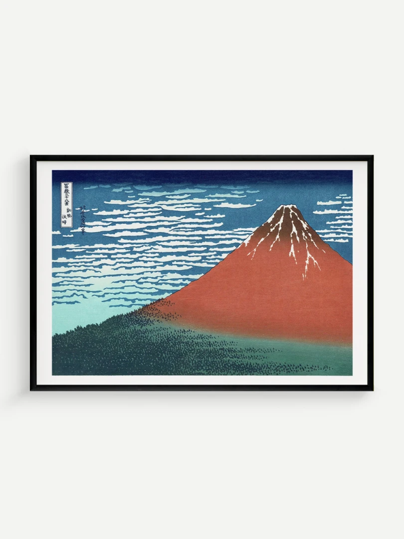 Tento nádherný umelecký print patrí do slávnej série „Tridsaťšesť pohľadov na horu Fudži“, ktorá je jednou z najvýznamnejších umeleckých reprezentácií konkrétneho miesta v dejinách umenia. Hokusai v tomto diele zachytil horu Fudži v rannom svetle letného dňa, keď sa jej svahy zafarbujú do sýtych odtieňov červenej pod vplyvom vychádzajúceho slnka.