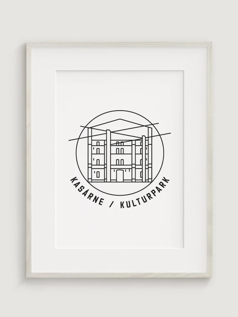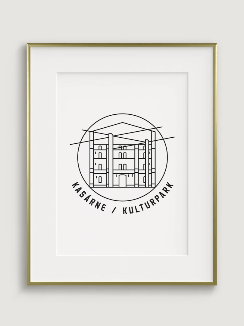 Tento print predstavuje štýlizované, minimalistické zobrazenie Kasární v Košiciach, budovy, ktorá prešla z vojenského využitia na kultúrne centrum s moderným charakterom. Vypracovaný s jemnou čiernou linkovou kresbou na kvalitnom papieri, táto ilustrácia zachytáva pôsobivé línie a detaily budovy v súčasnom a nadčasovom štýle.