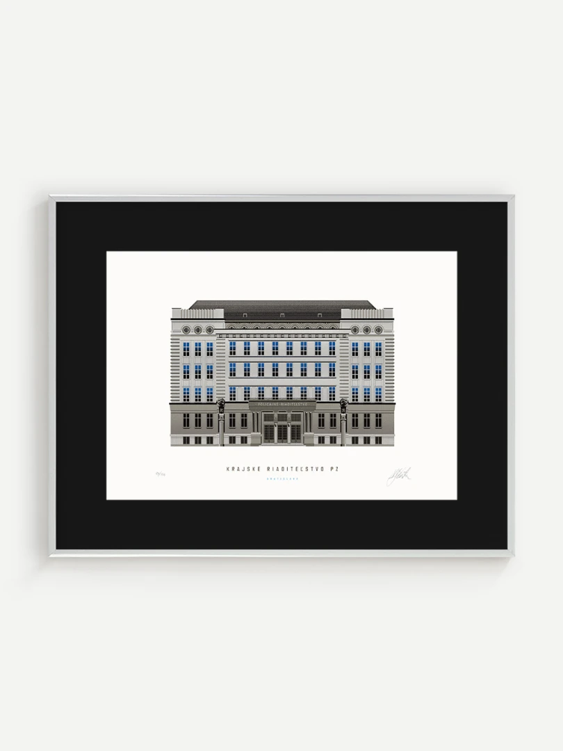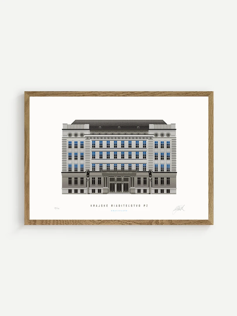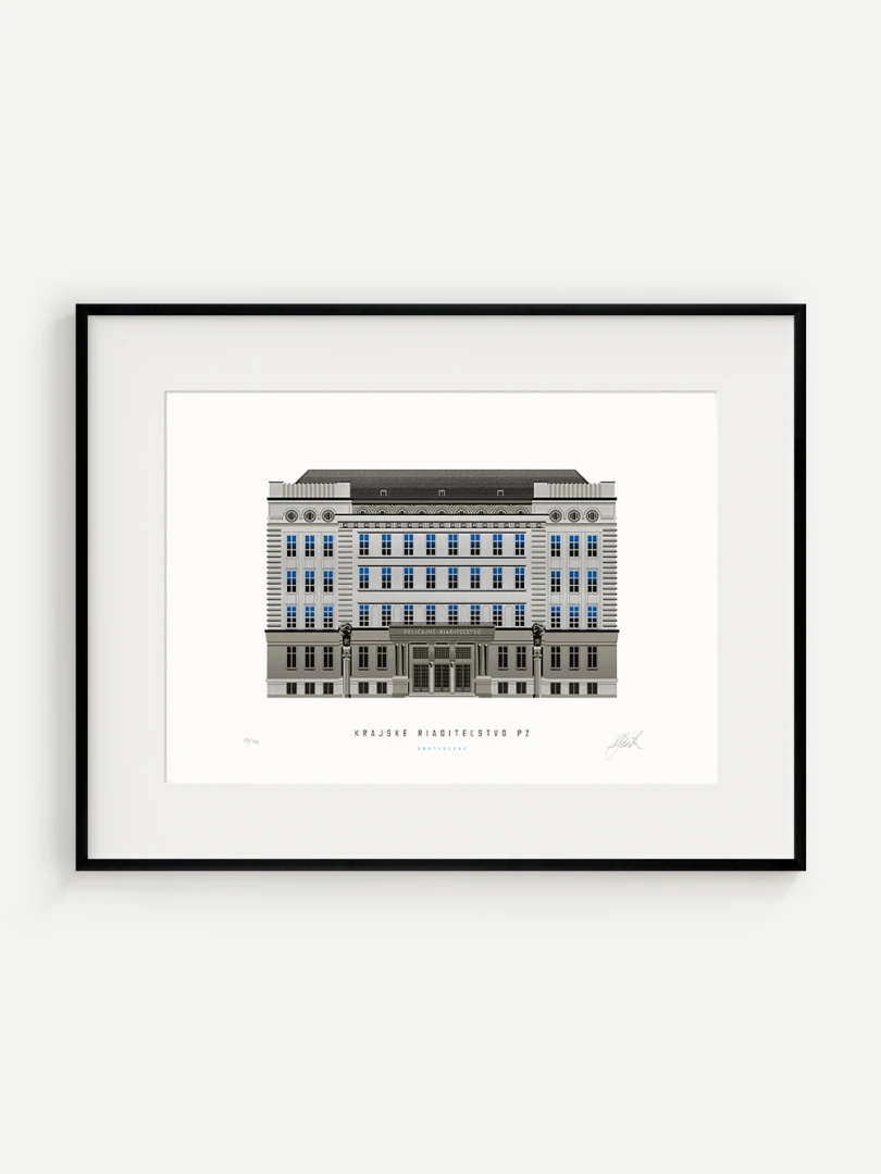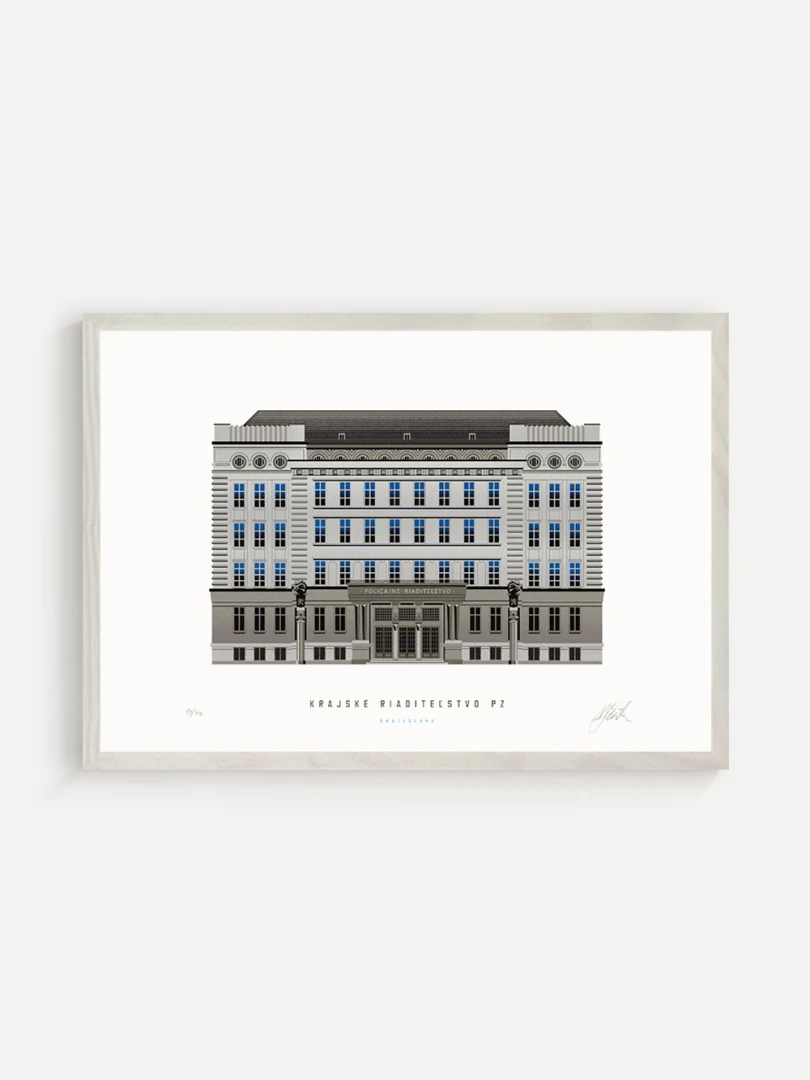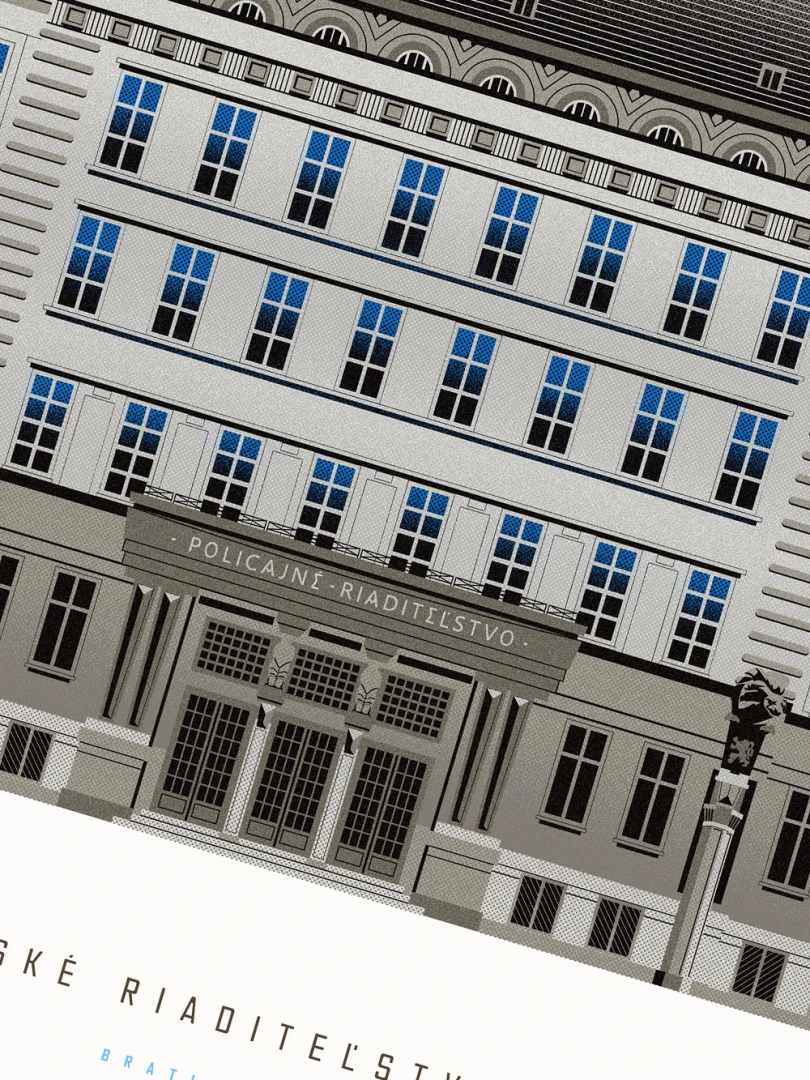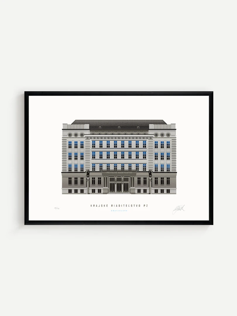 Krajské riaditeľstvo Policajného zboru v Bratislave Budovu Krajského riaditeľstva Policajného zboru v Bratislave pozná väčšina Bratislavčanov pod názvom „U dvoch levov“. Postavili ju v roku 1924 podľa návrhu českého architekta Františka Krupku. Nad vchodom sú umiestnené plastiky Atlantov v podobe spútaných väzňov, a po stranách plastiky dvoch sediacich levov, ktorí v labách držia štíty s československým štátnym znakom. Ich autorom je český sochár Augustín Paukert. Budova sa nesie v štýle takzvaného národného slohu, ktorý bol kombináciou pražského kubizmu s prvkami ľudovej architektúry a umenia. V tom čase patrila k najmodernejším policajným budovám v Európe, obdobné budovy boli postavené pre policajné riaditeľstvo v Košiciach a pre francúzsku políciu v Lyone. Do užívania bola odovzdaná v marci 1926. Od roku 1997do súčasnosti budova slúži ako sídlo Krajského riaditeľstva Policajného zboru v Bratislave.Jedným z podnetov na vznik grafiky bola aj knižka Zabudnutí detektívi od Petra Nevolného.Na pamiatku Dr. Jaroslava Klímu, bratislavského policajného riaditeľa, bez ktorého iniciatívyby budova riaditeľstva nebola postavená. Venované všetkým policajtom, ktorí v minulosti bojovali a doteraz bojujú s kriminalitou v bratislavských uliciach a robia naše mesto bezpečnejším.
