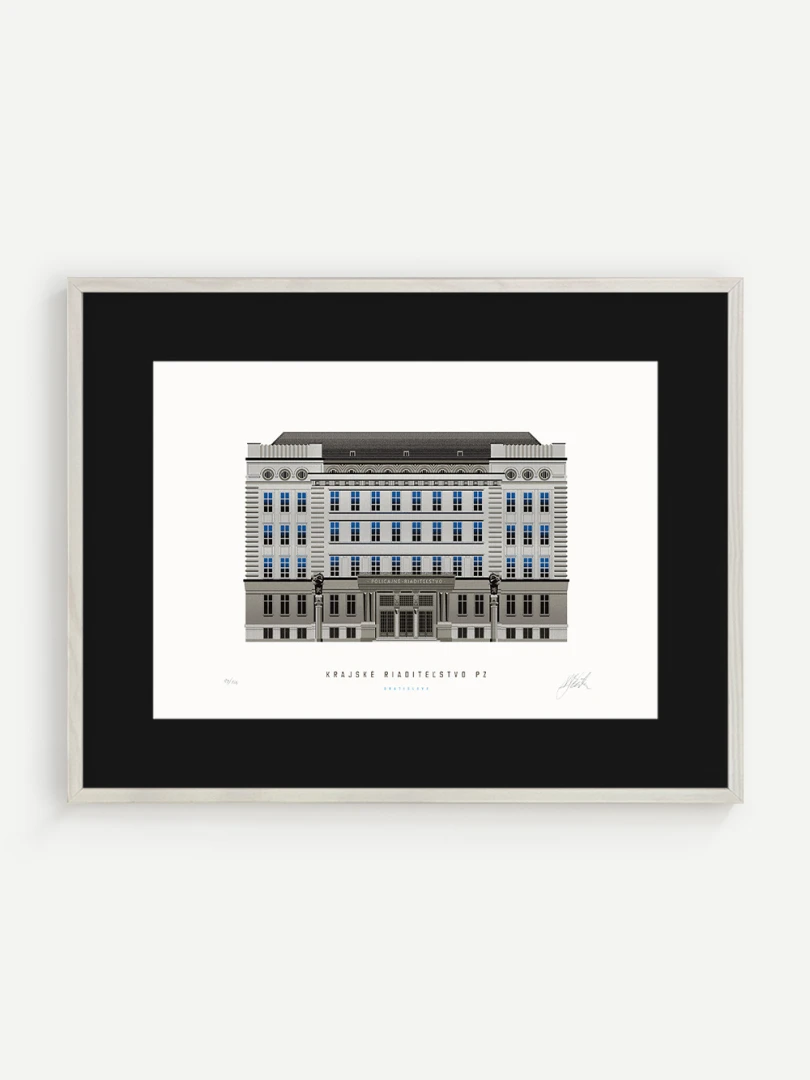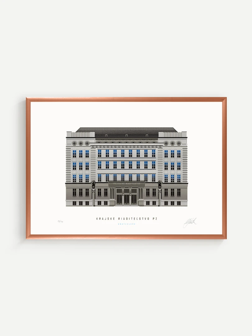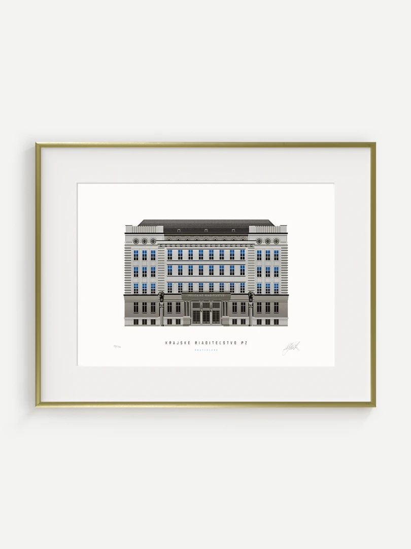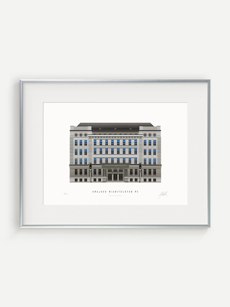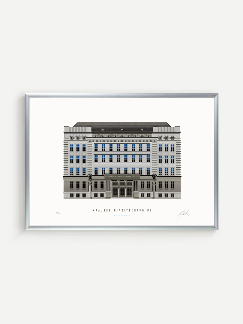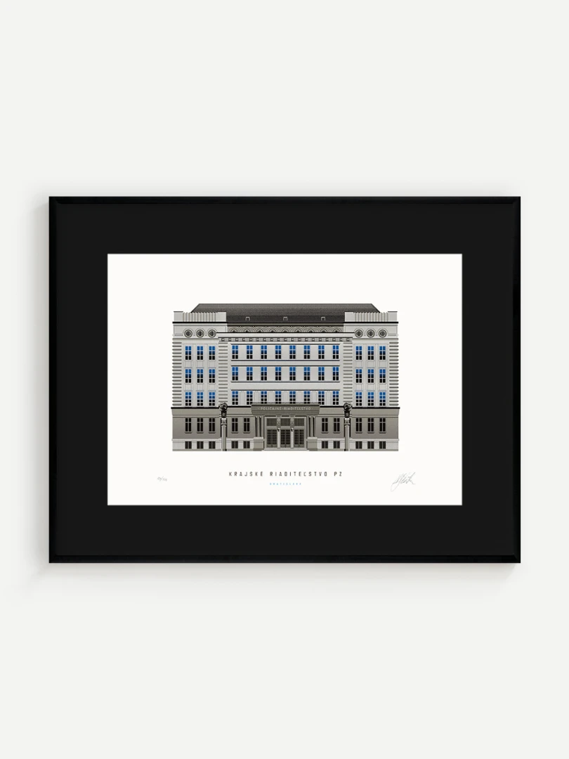 Krajské riaditeľstvo Policajného zboru v Bratislave Budovu Krajského riaditeľstva Policajného zboru v Bratislave pozná väčšina Bratislavčanov pod názvom „U dvoch levov“. Postavili ju v roku 1924 podľa návrhu českého architekta Františka Krupku. Nad vchodom sú umiestnené plastiky Atlantov v podobe spútaných väzňov, a po stranách plastiky dvoch sediacich levov, ktorí v labách držia štíty s československým štátnym znakom. Ich autorom je český sochár Augustín Paukert. Budova sa nesie v štýle takzvaného národného slohu, ktorý bol kombináciou pražského kubizmu s prvkami ľudovej architektúry a umenia. V tom čase patrila k najmodernejším policajným budovám v Európe, obdobné budovy boli postavené pre policajné riaditeľstvo v Košiciach a pre francúzsku políciu v Lyone. Do užívania bola odovzdaná v marci 1926. Od roku 1997do súčasnosti budova slúži ako sídlo Krajského riaditeľstva Policajného zboru v Bratislave.Jedným z podnetov na vznik grafiky bola aj knižka Zabudnutí detektívi od Petra Nevolného.Na pamiatku Dr. Jaroslava Klímu, bratislavského policajného riaditeľa, bez ktorého iniciatívyby budova riaditeľstva nebola postavená. Venované všetkým policajtom, ktorí v minulosti bojovali a doteraz bojujú s kriminalitou v bratislavských uliciach a robia naše mesto bezpečnejším.