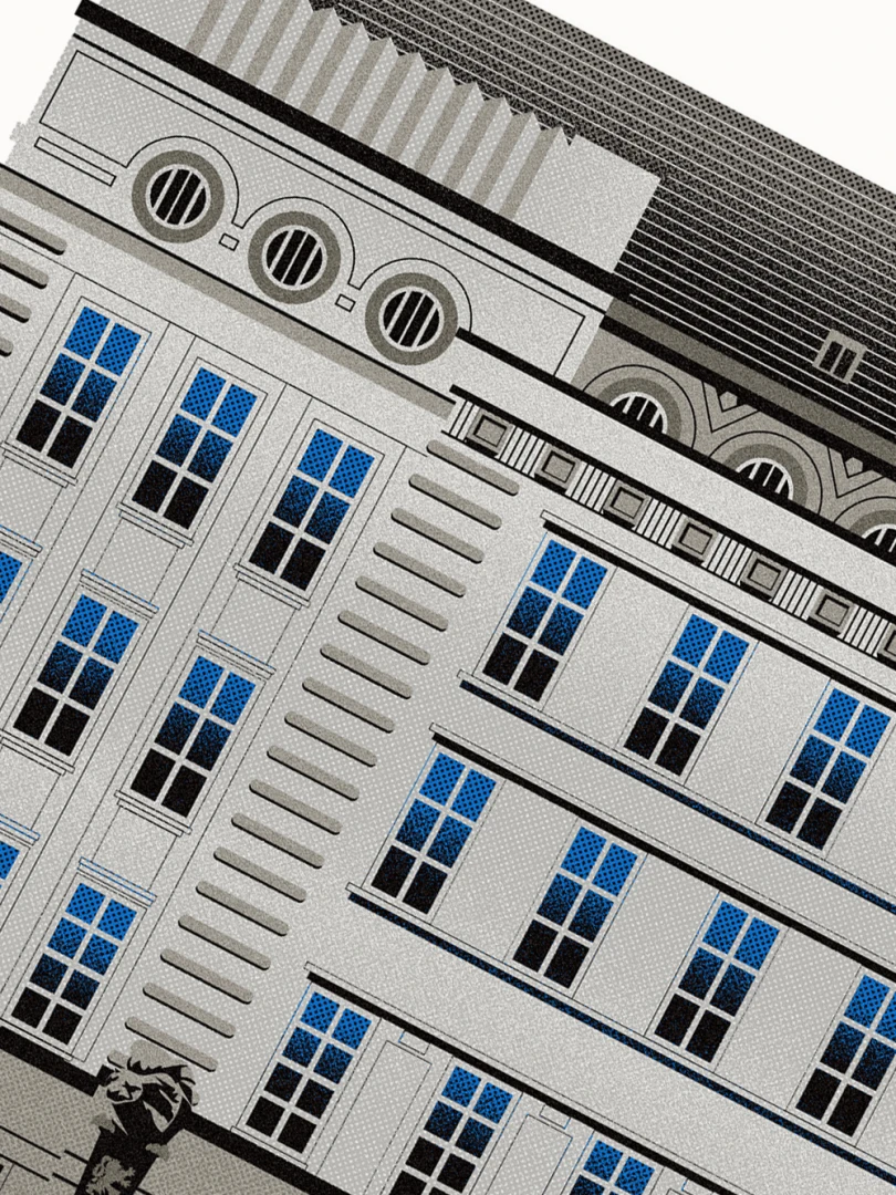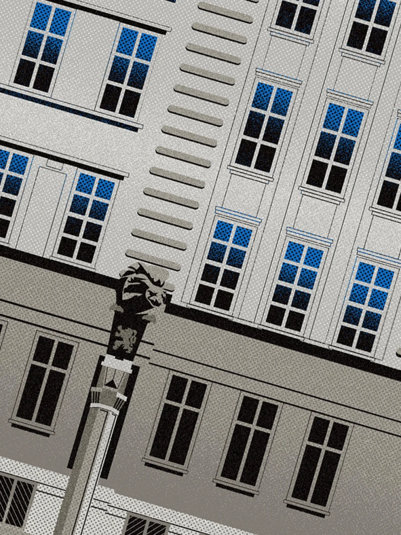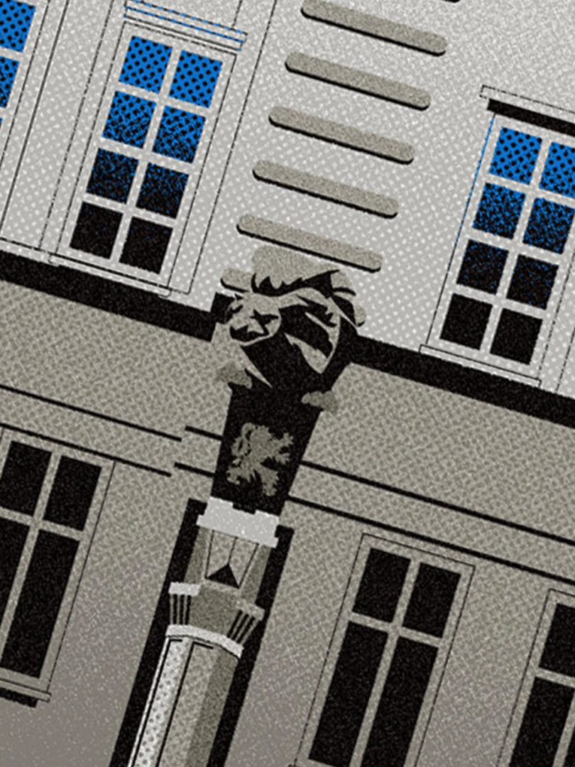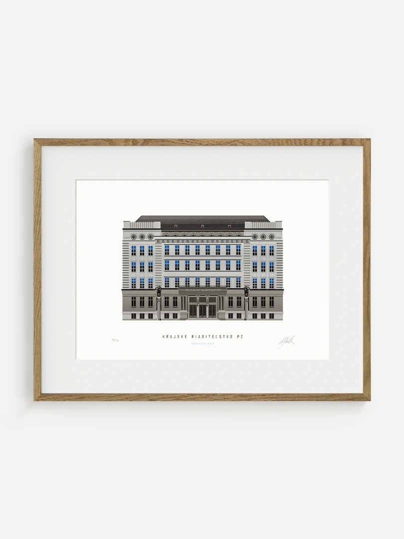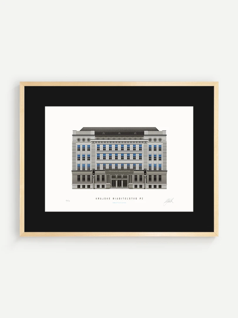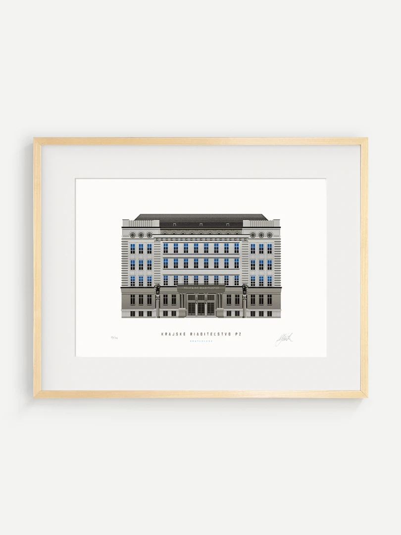 Krajské riaditeľstvo Policajného zboru v Bratislave Budovu Krajského riaditeľstva Policajného zboru v Bratislave pozná väčšina Bratislavčanov pod názvom „U dvoch levov“. Postavili ju v roku 1924 podľa návrhu českého architekta Františka Krupku. Nad vchodom sú umiestnené plastiky Atlantov v podobe spútaných väzňov, a po stranách plastiky dvoch sediacich levov, ktorí v labách držia štíty s československým štátnym znakom. Ich autorom je český sochár Augustín Paukert. Budova sa nesie v štýle takzvaného národného slohu, ktorý bol kombináciou pražského kubizmu s prvkami ľudovej architektúry a umenia. V tom čase patrila k najmodernejším policajným budovám v Európe, obdobné budovy boli postavené pre policajné riaditeľstvo v Košiciach a pre francúzsku políciu v Lyone. Do užívania bola odovzdaná v marci 1926. Od roku 1997do súčasnosti budova slúži ako sídlo Krajského riaditeľstva Policajného zboru v Bratislave.Jedným z podnetov na vznik grafiky bola aj knižka Zabudnutí detektívi od Petra Nevolného.Na pamiatku Dr. Jaroslava Klímu, bratislavského policajného riaditeľa, bez ktorého iniciatívyby budova riaditeľstva nebola postavená. Venované všetkým policajtom, ktorí v minulosti bojovali a doteraz bojujú s kriminalitou v bratislavských uliciach a robia naše mesto bezpečnejším.