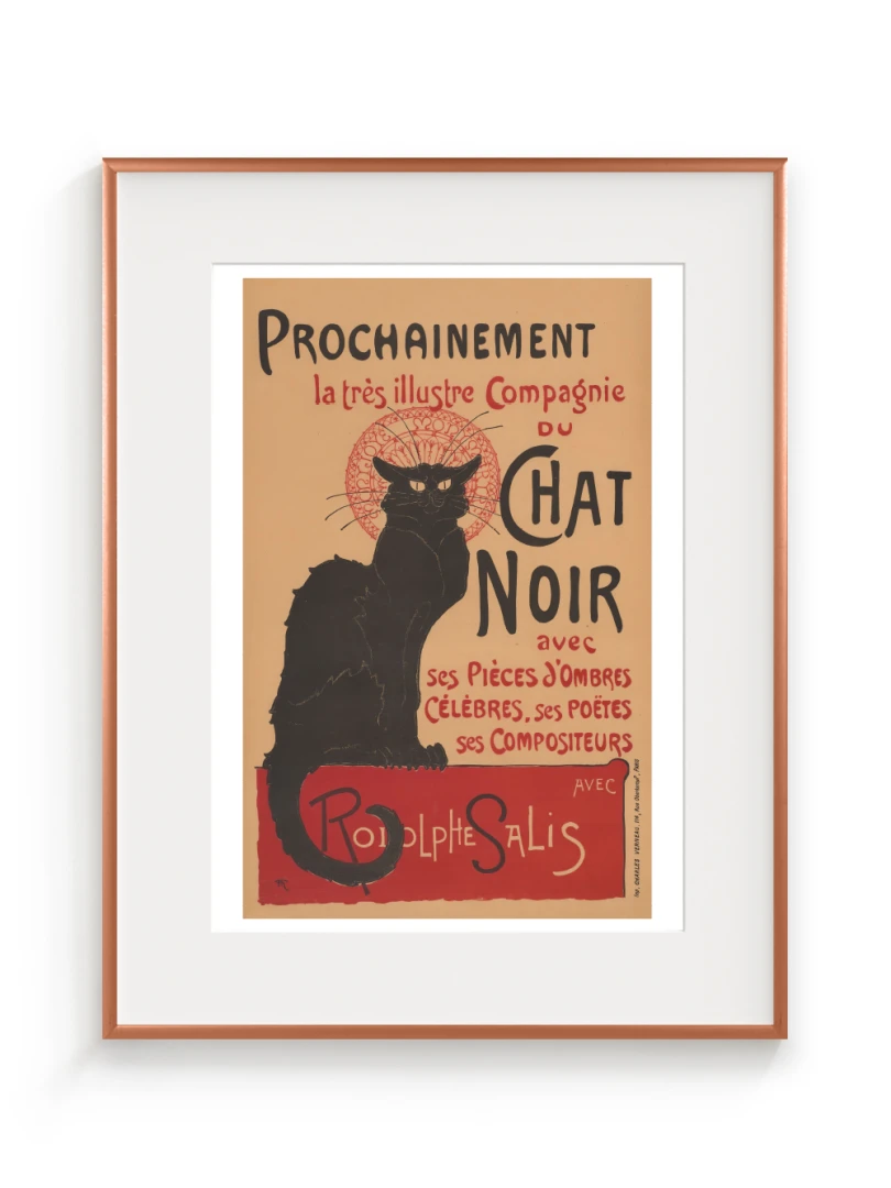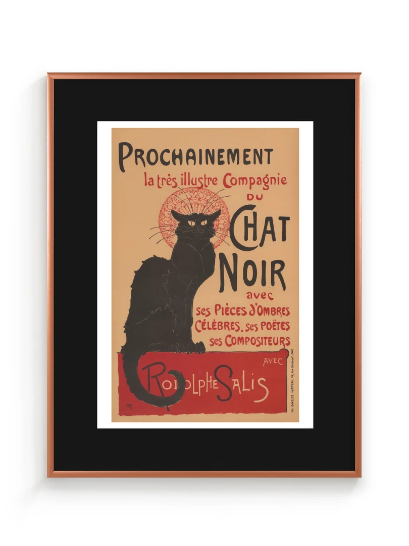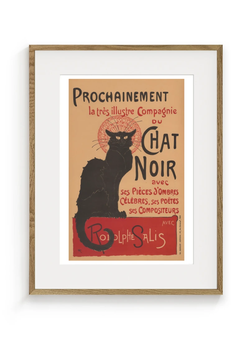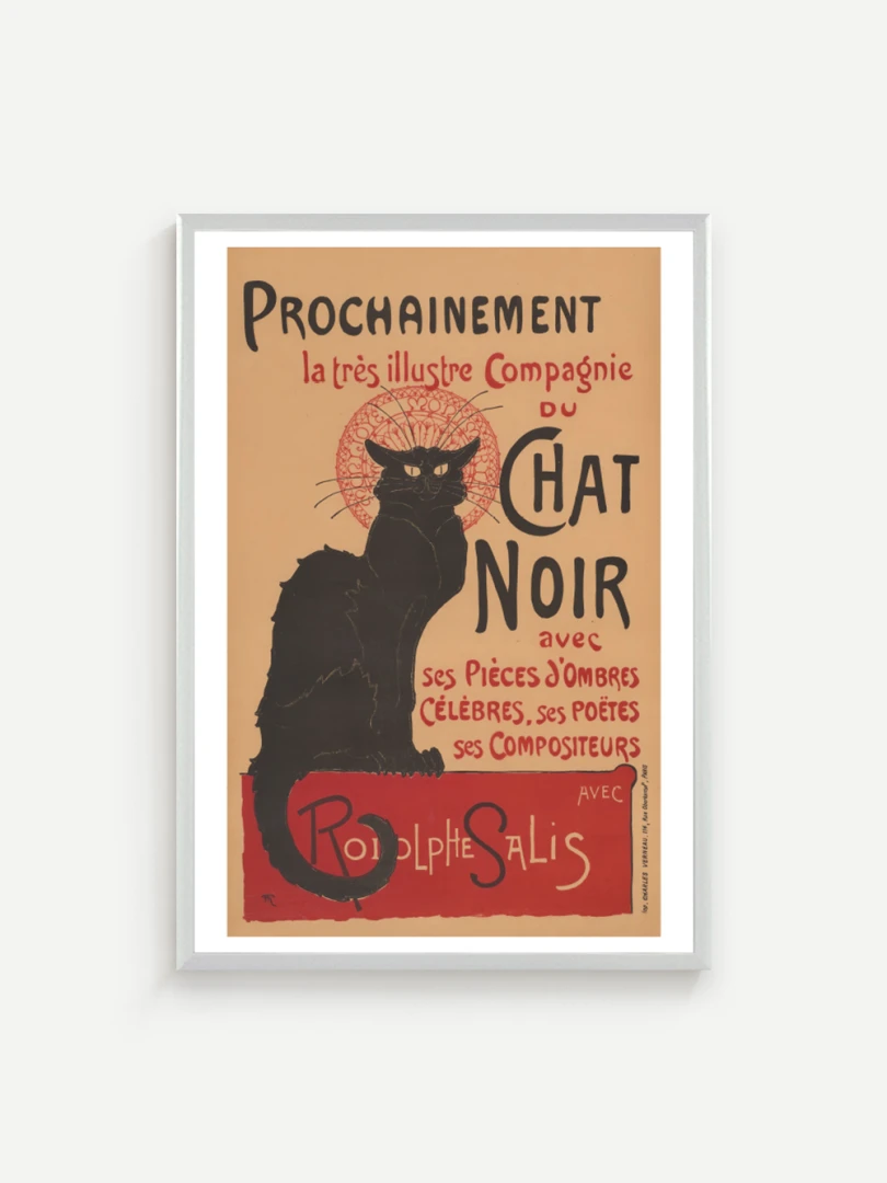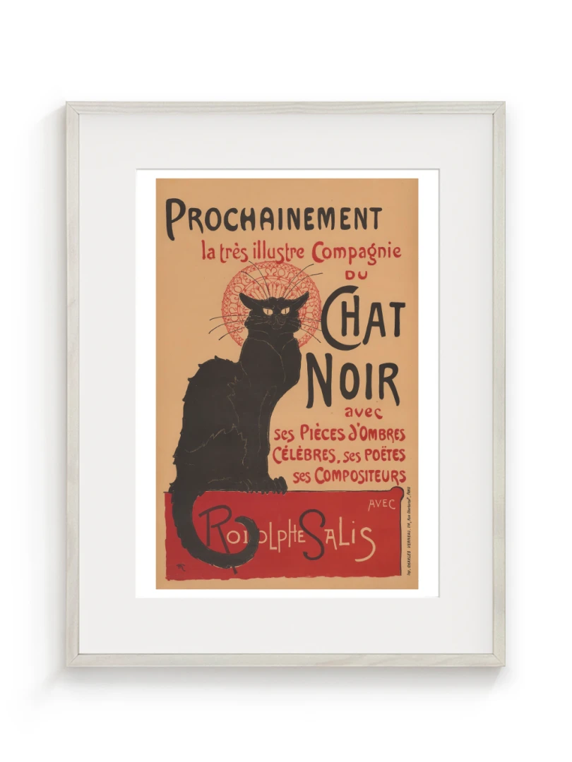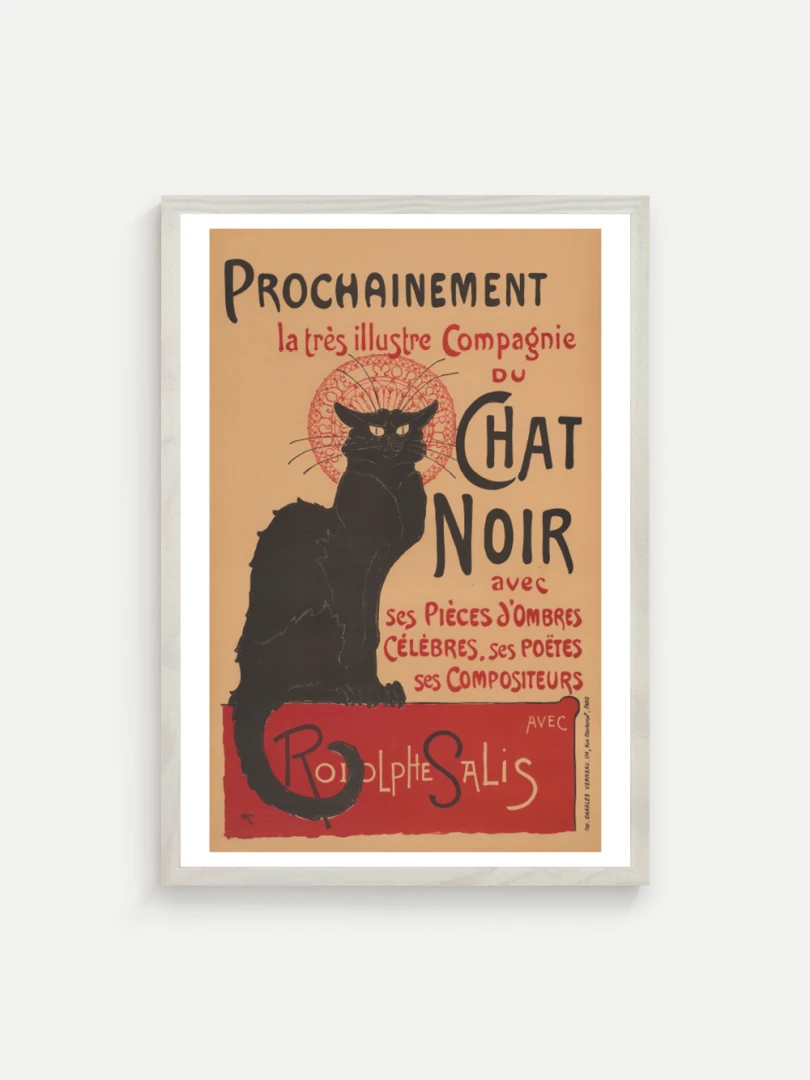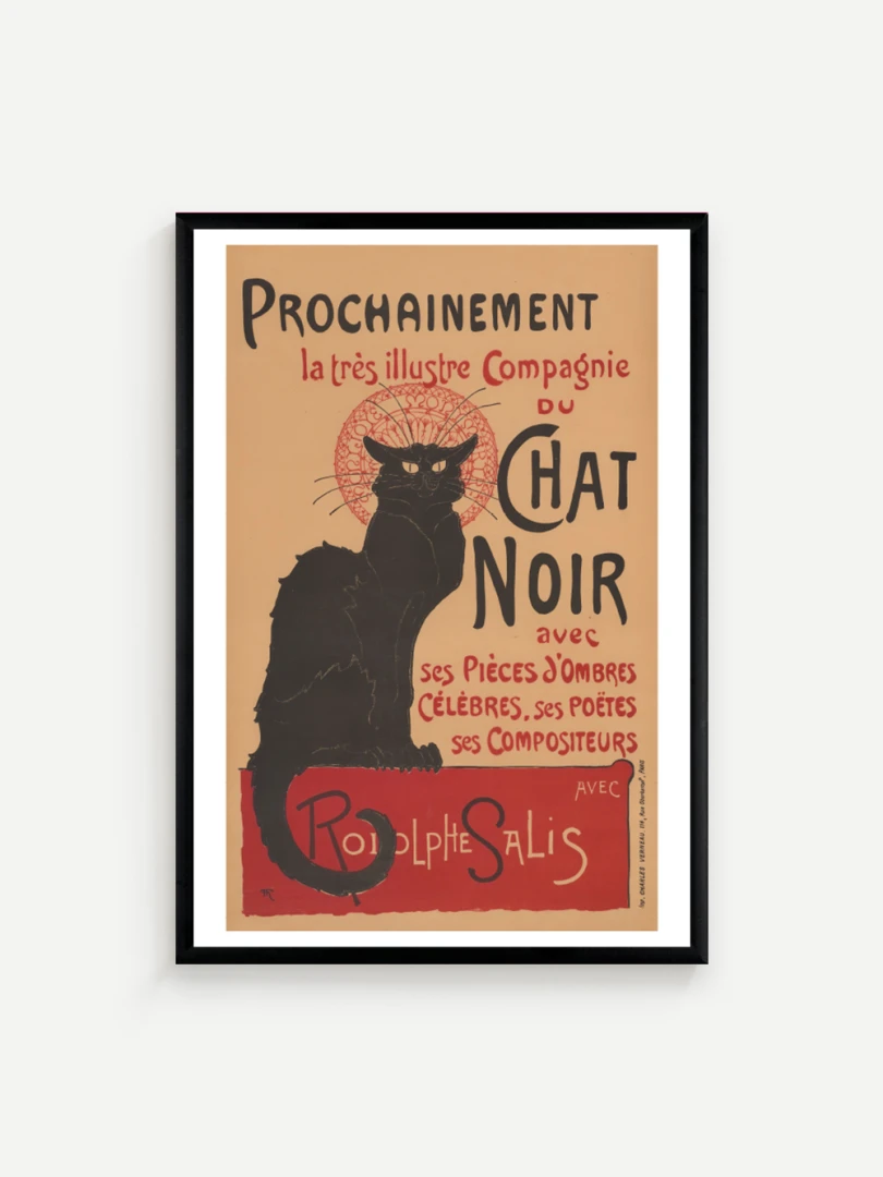 Tento print vychádza z legendárneho plagátu Prochainement la très illustre Compagnie du Chat Noir, ktorý v roku 1896 vytvoril francúzsky maliar a ilustrátor Théophile Alexandre Steinlen. Dielo vzniklo ako reklama pre umeleckú skupinu a kabaret Le Chat Noir v Montmartri - symbol bohémskeho Paríža na prelome 19. a 20. storočia. Tajomný čierny kocúr s intenzívnym pohľadom, posadený na okraji červenej plochy, sa stal ikonou francúzskeho fin de siècle.