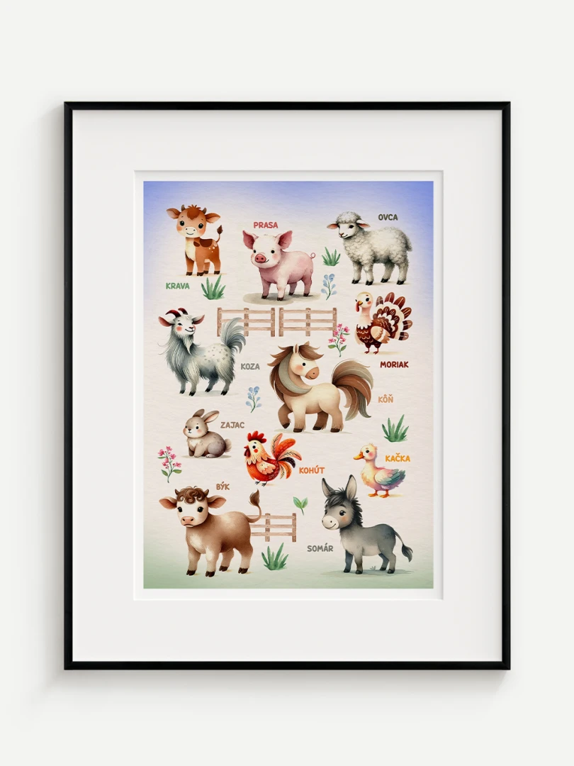 Tento očarujúci a farebný print zobrazuje život na farme plný milých hospodárskych zvieratiek, a tak deťom pomáha spoznávať rôzne druhy zvierat zábavným a príjemným spôsobom. Každé zvieratko je krásne ilustrované a doplnené svojím názvom v slovenčine, čo z tohto printu robí výborný vzdelávací nástroj.