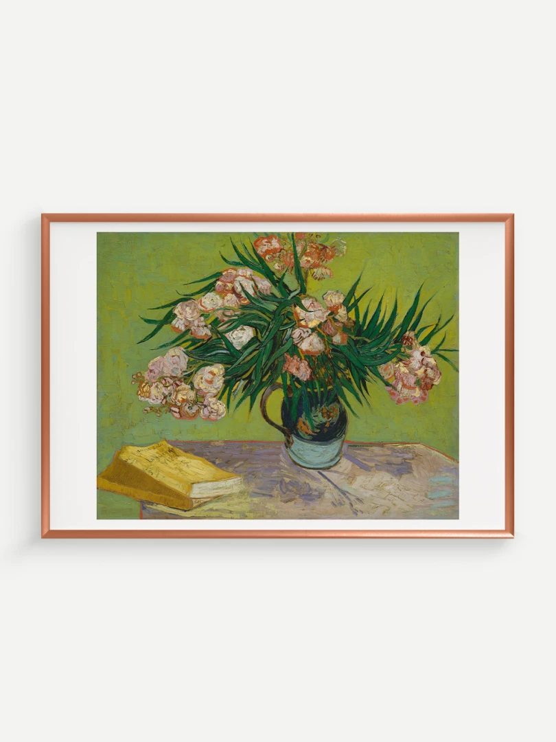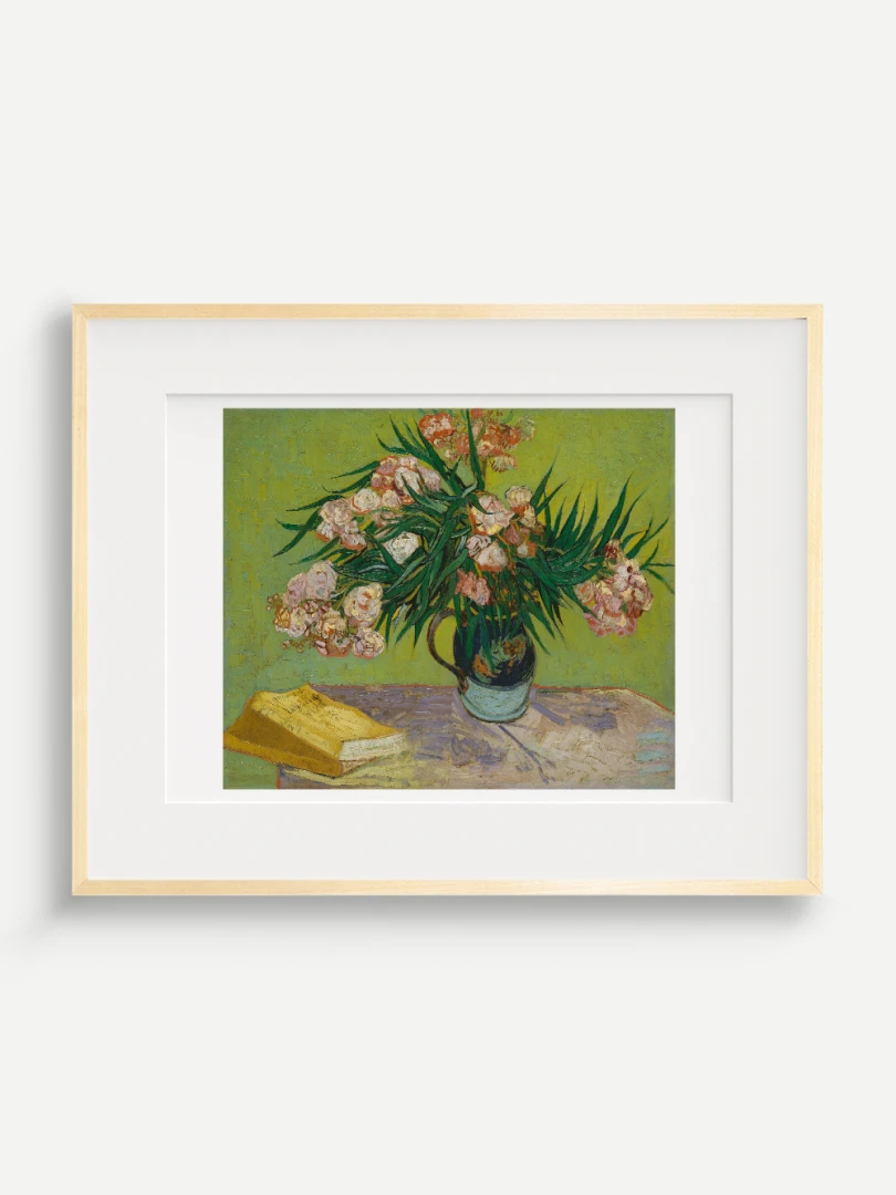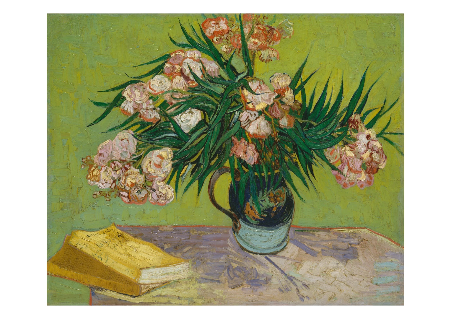 Tento žiarivý print Oleandrov (Oleanders) vychádza z diela, ktoré Vincent van Gogh namaľoval v auguste 1888 počas svojho pobytu v Arles. Pre Van Gogha mali oleandre špeciálny význam – vnímal ich ako kvety, ktoré prekypujú radosťou a životnou silou. Kvety, ktoré podľa neho „nekonečne kvitnú“ a neustále „vyrážajú nové výhonky“.