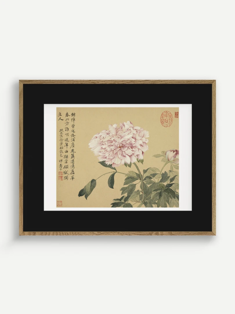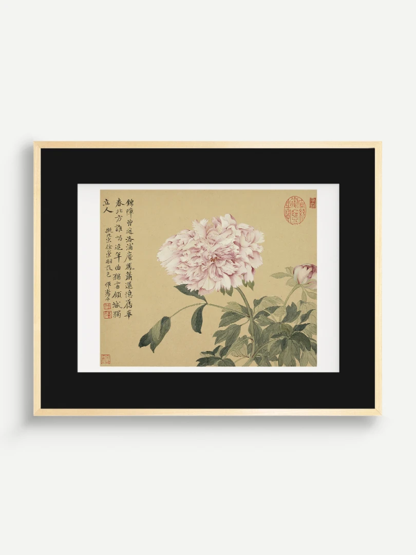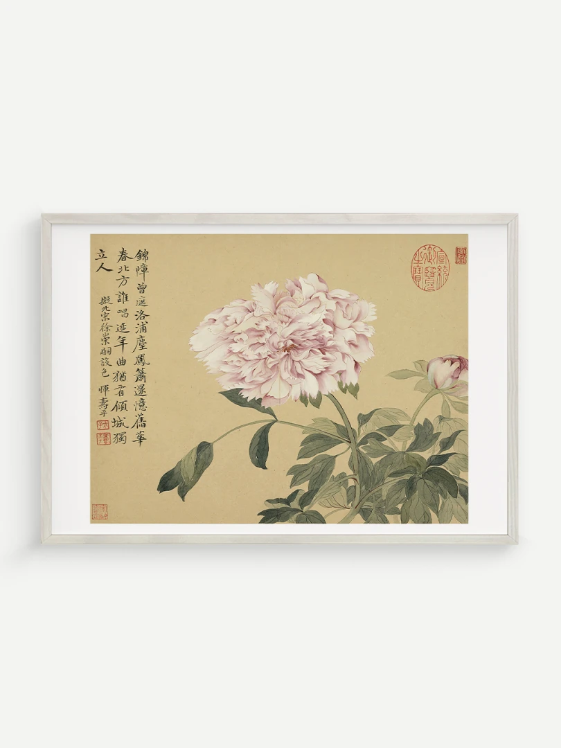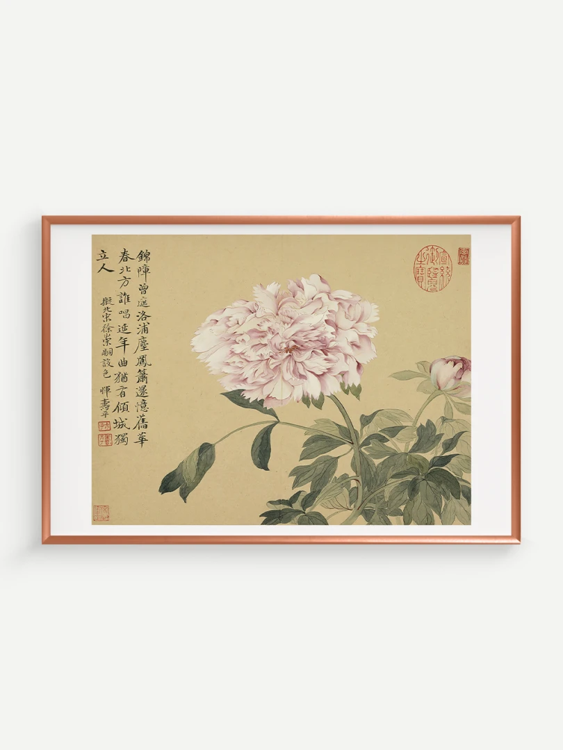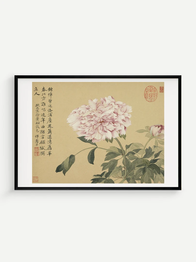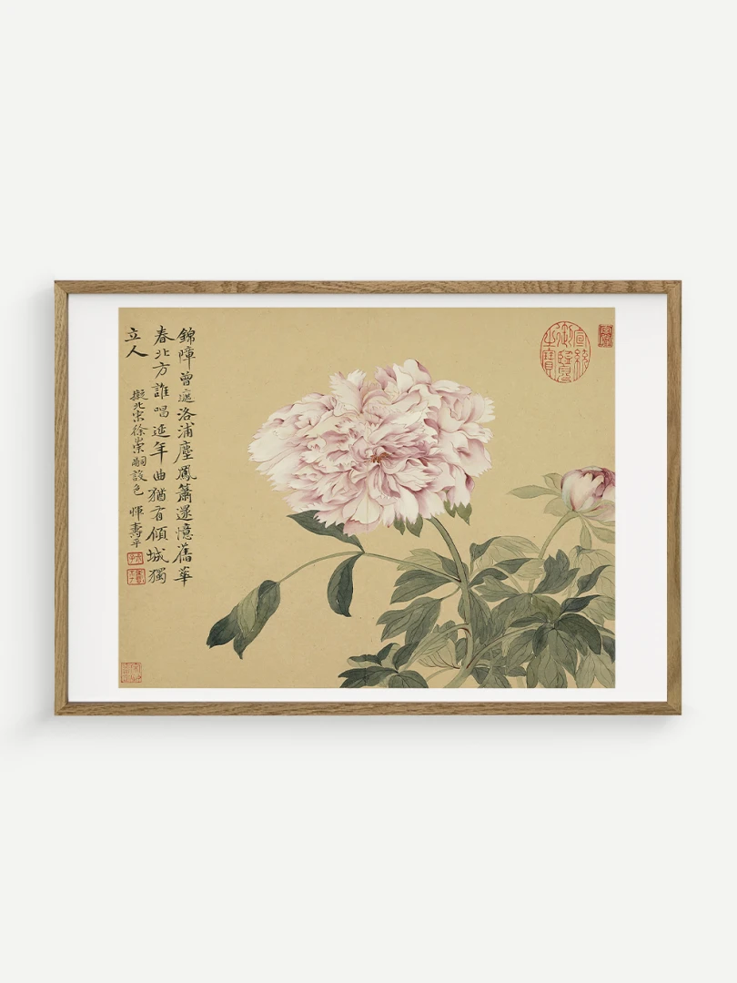 Tento nádherný umelecký print zachytáva pivonky v ich plnej kráse, tak ako ich v 17. storočí majstrovsky zobrazil čínsky umelec Yun Shouping. Bol jedným z najvýznamnejších predstaviteľov kvitnúcich štetcových malieb (huaniao) v období dynastie Čching a preslávil sa svojou schopnosťou zachytiť prírodnú krásu s jemnosťou a ľahkosťou.