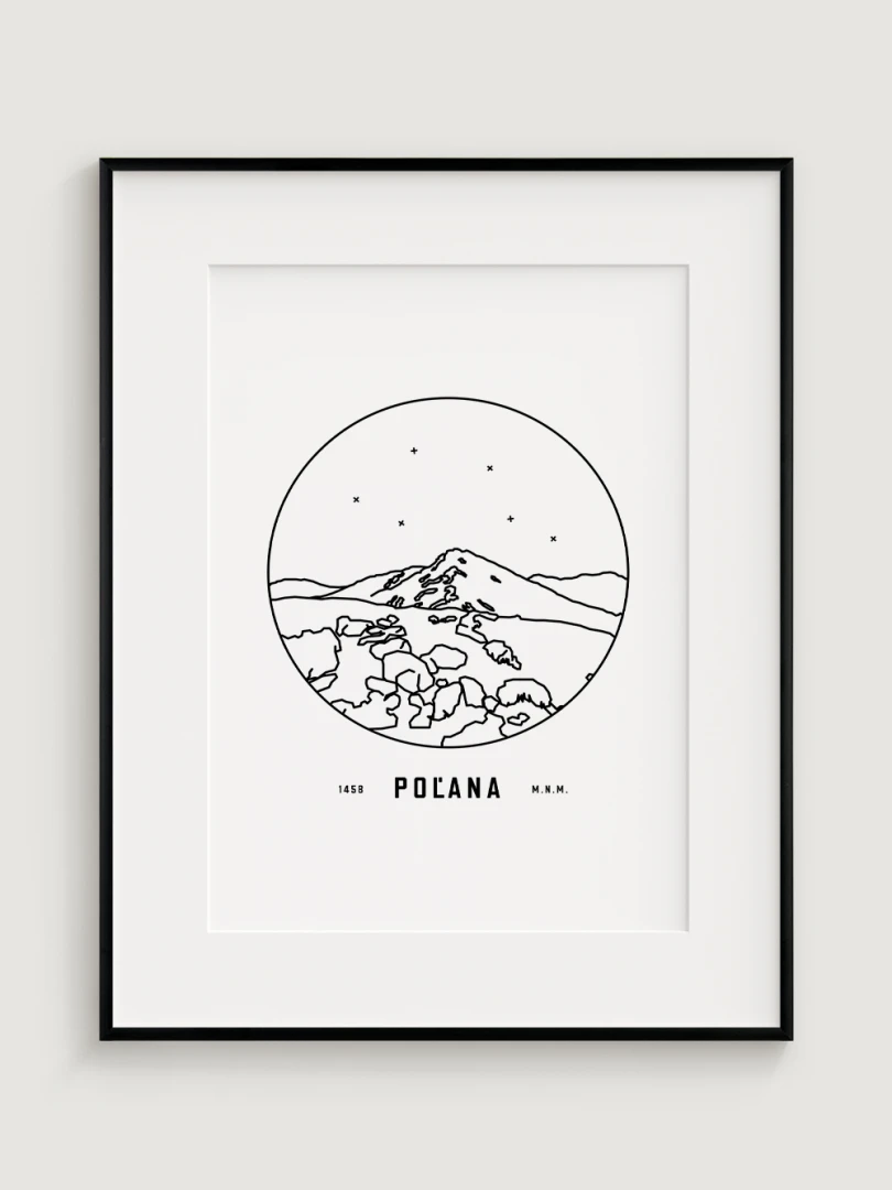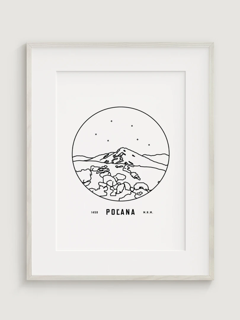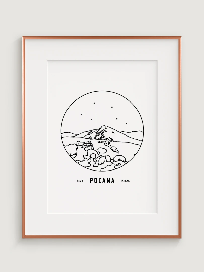 Poľa je znázornená v detailnej kruhovej vinete s uvedením jeho názvu a nadmorskej výšky, čo vytvára jedinečný a estetický doplnok pre milovníkov prírody a hôr. Tento print je ideálnym darčekom pre tých, ktorí si chcú domov priniesť kúsok slovenskej krajiny a majestátnosť jej vrcholov.