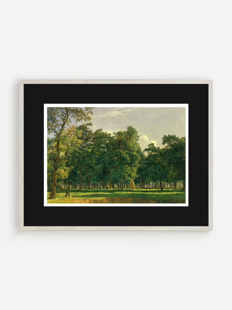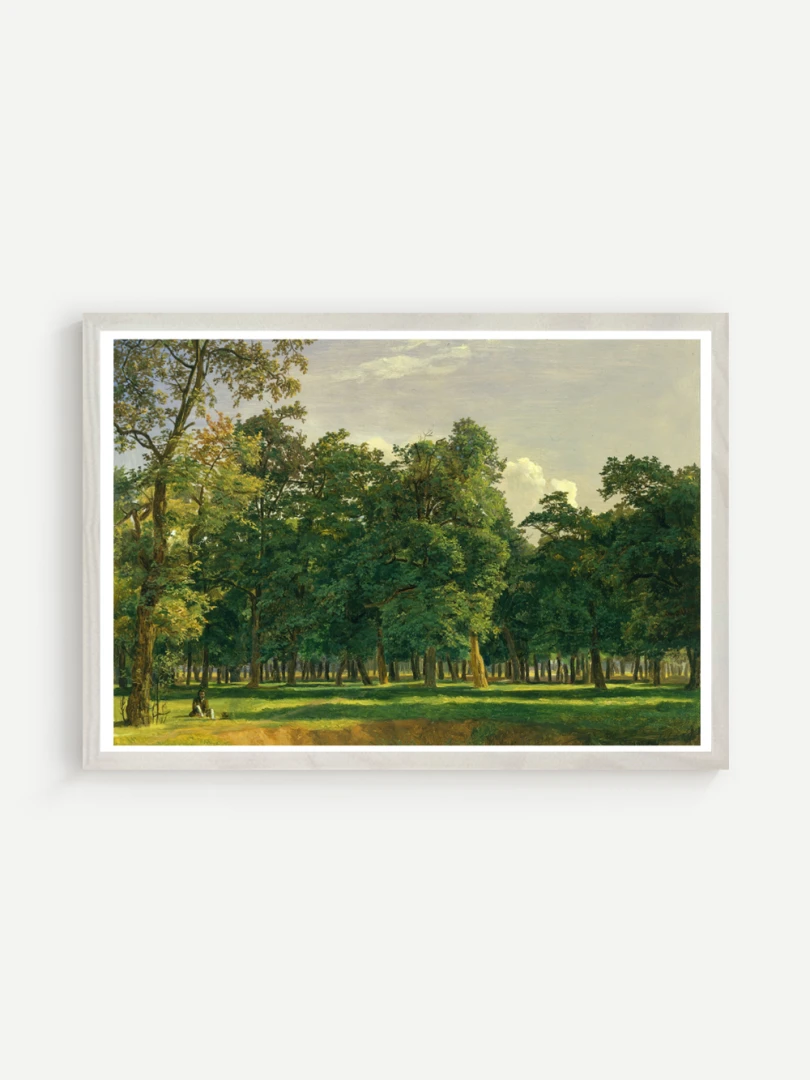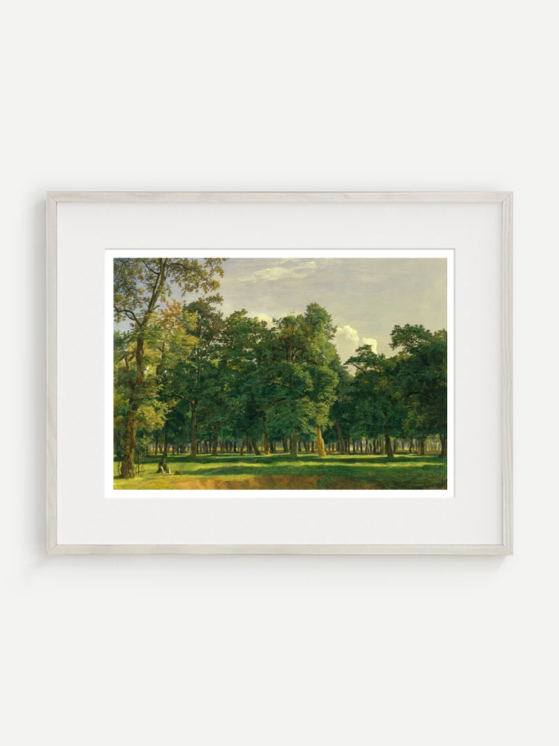 Tento print vychádza z obrazu Krajina v Pratri (Prater Landscape), ktorý vznikol okolo roku 1831 a zachytáva slnečný výjav z veľkého verejného parku vo Viedni. Park je zaliaty žiarivým svetlom, ktoré preniká medzi korunami stromov a zvýrazňuje množstvo jemných detailov na listoch, kôre a trávnatej pôde.