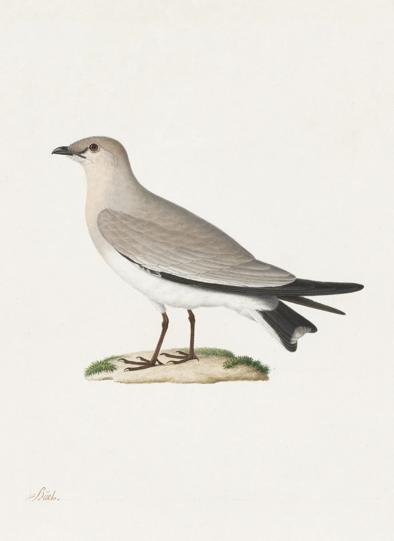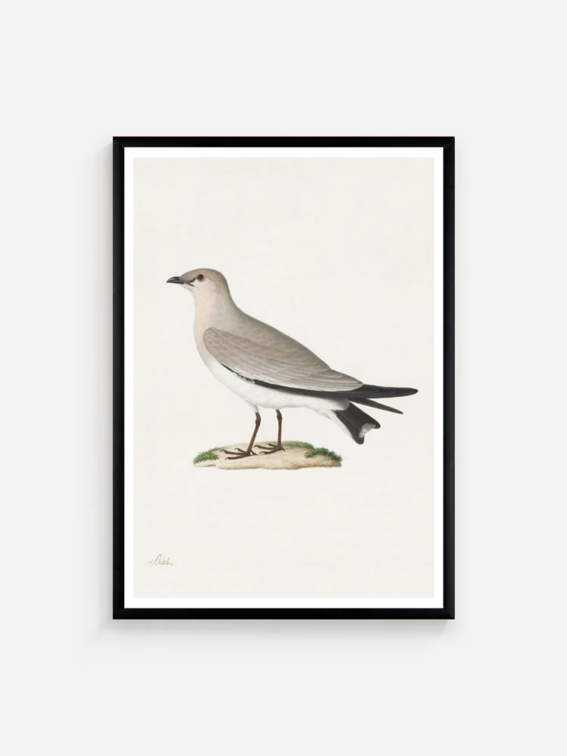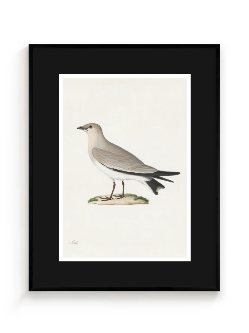 Tento print zobrazuje Malého prieložníka (Small Pratincole, Glareola lactea), drobného vtáka typického pre piesočnaté brehy južnej Ázie. Dielo pochádza z 19. storočia a je pripisované francúzskemu maliarovi Paulovi Hüetovi. Vták je zobrazený s precíznou anatomickou presnosťou, stojaci na jednoduchej zemi s trsom trávy – scéna je čistá, bez rušivého pozadia, vďaka čomu vyniká samotná forma vtáčika.
