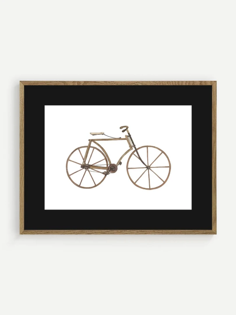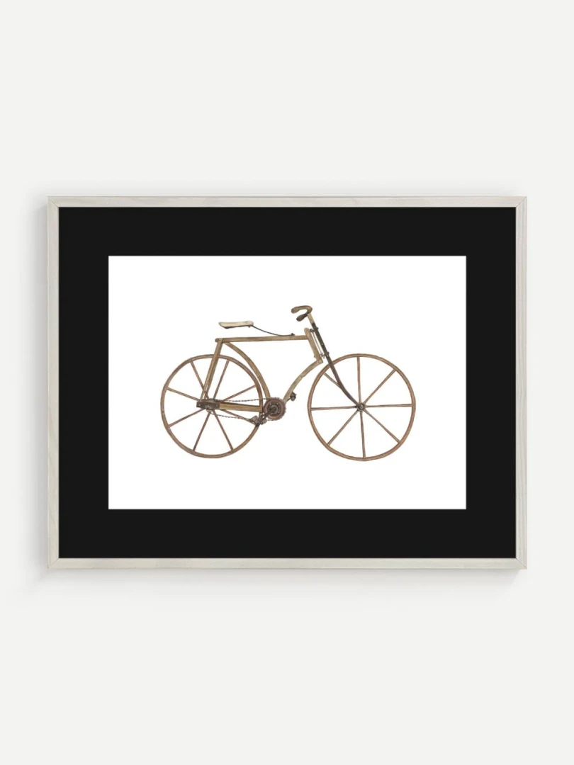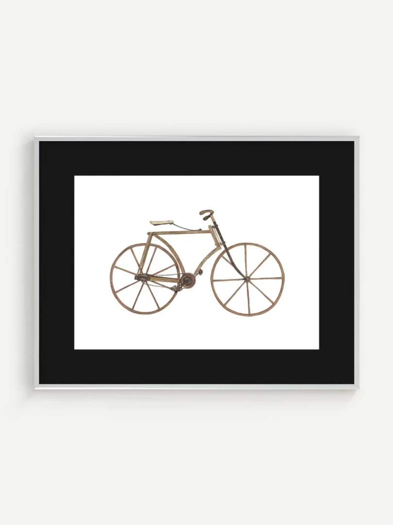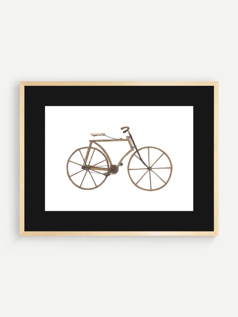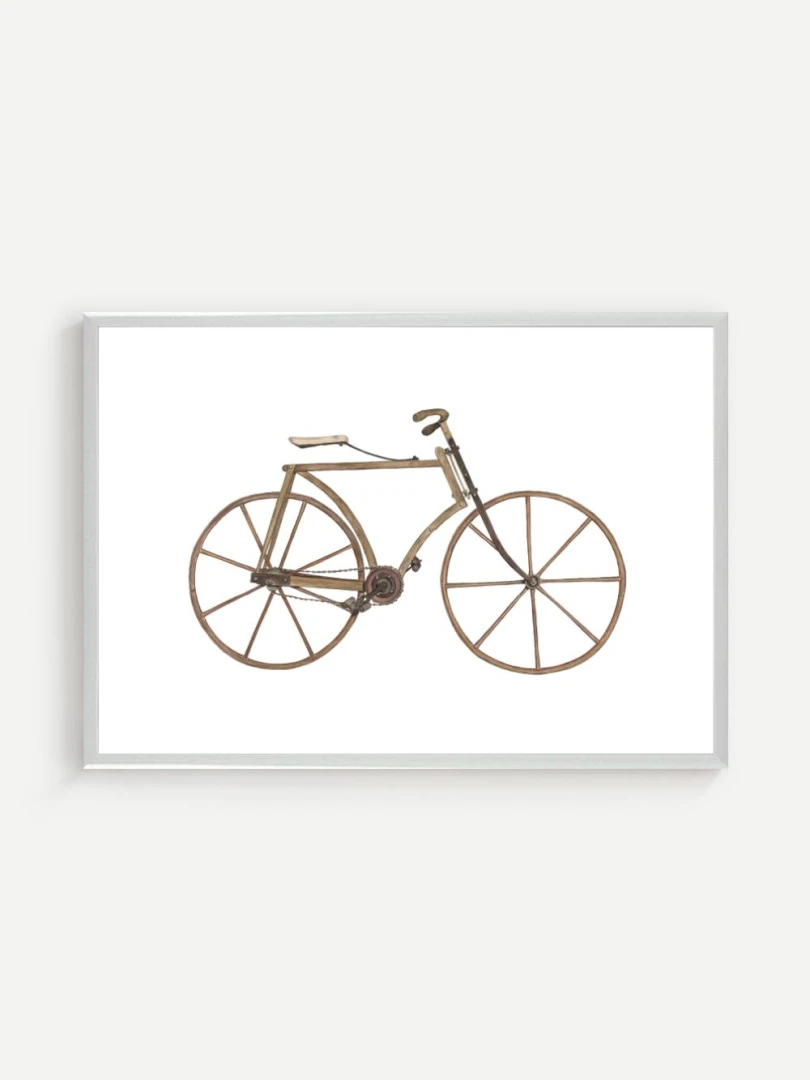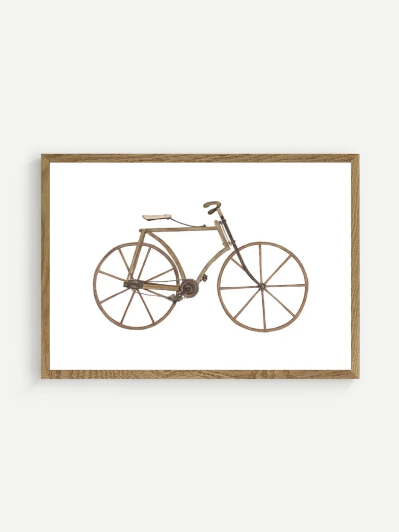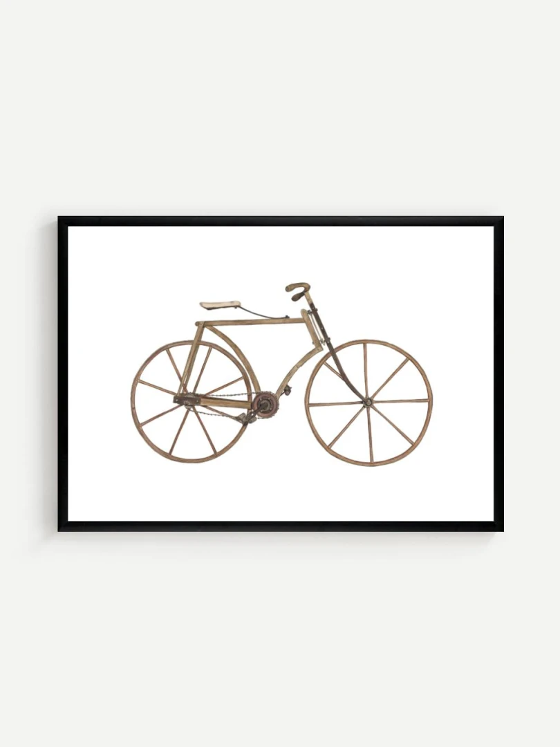 Tento print zachytáva detailnú ilustráciu starého bicykla s dreveným rámom a kolesami, aké sa používali na konci 19. storočia. Je to obraz jednoduchosti a vynaliezavosti – konštrukcia bez zbytočností, surové materiály, čisté línie. Pedále sú priamo napojené na reťazový prevod, sedlo jednoduché a funkčné, riadidlá elegantne zatočené. V každom detaile cítiť remeselnú zručnosť a vtedajšie chápanie pohybu ako niečoho mechanického, ale zároveň ľudsky dostupného.