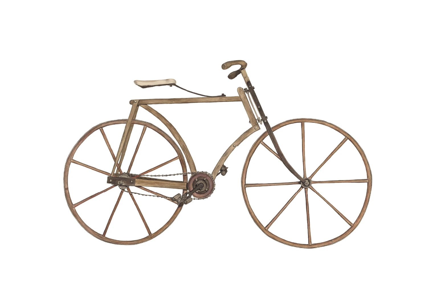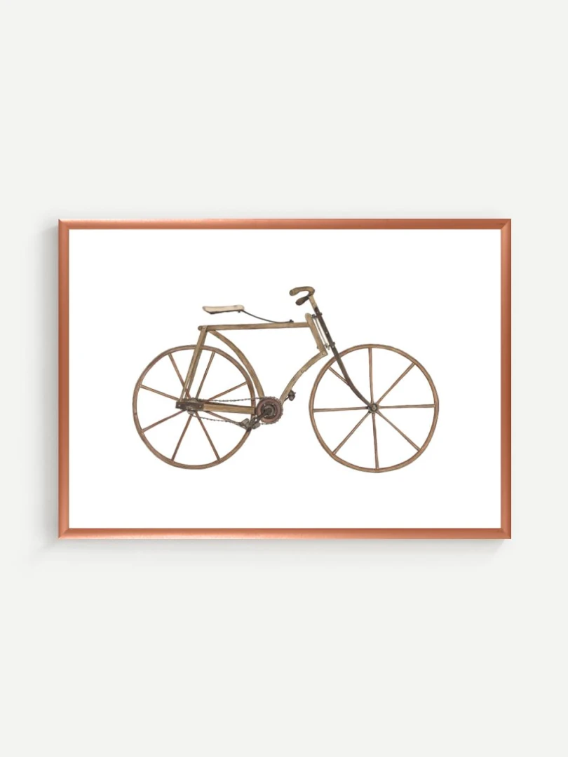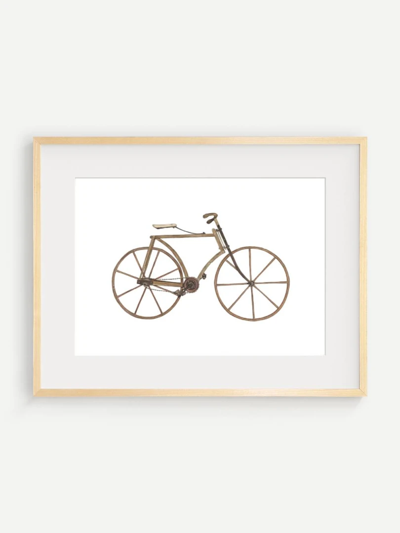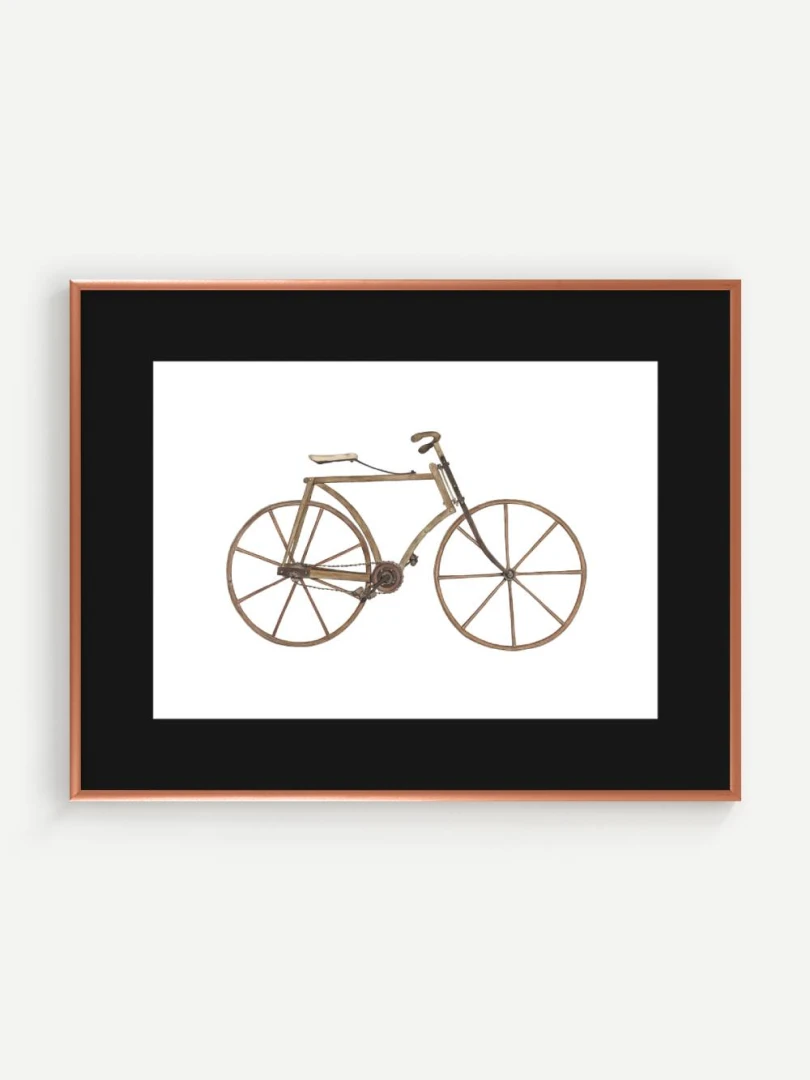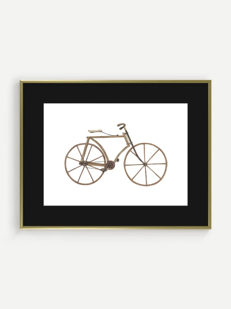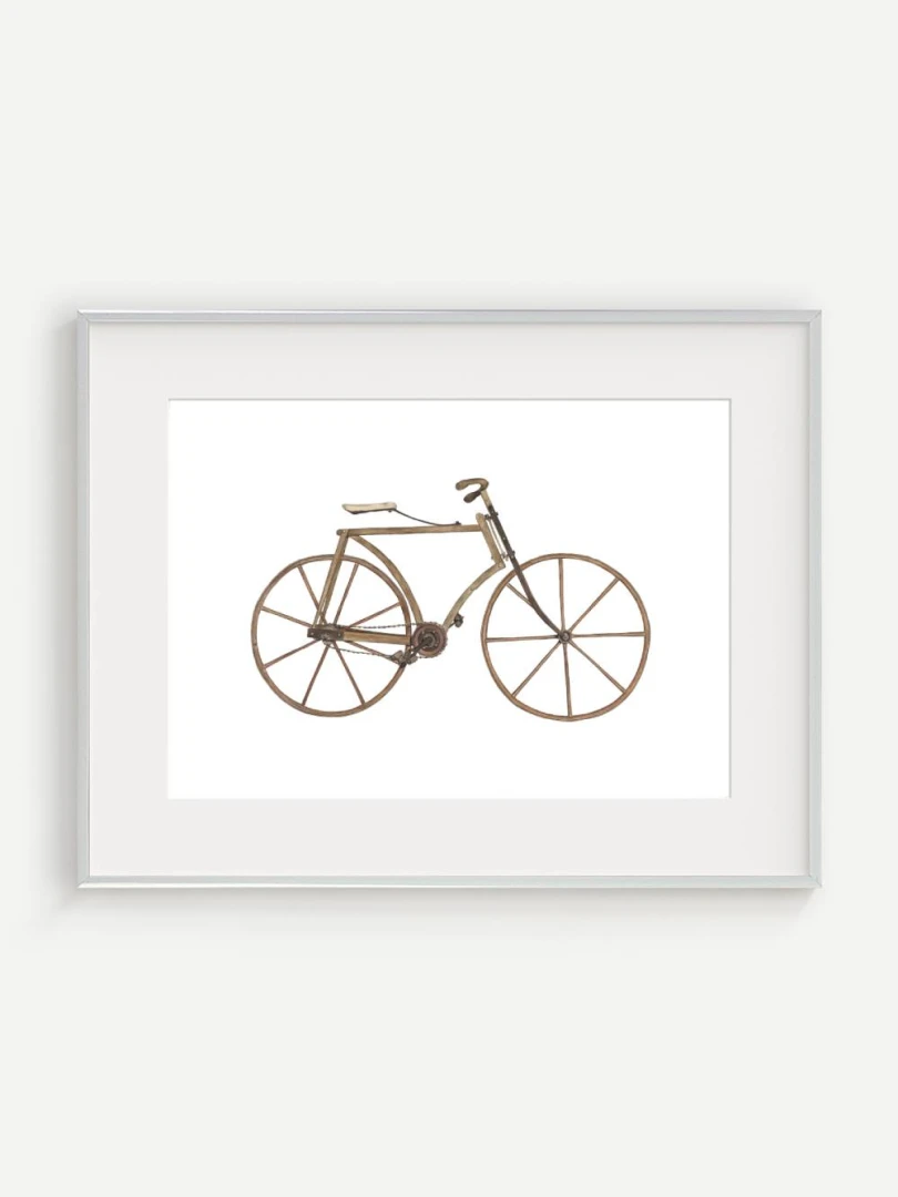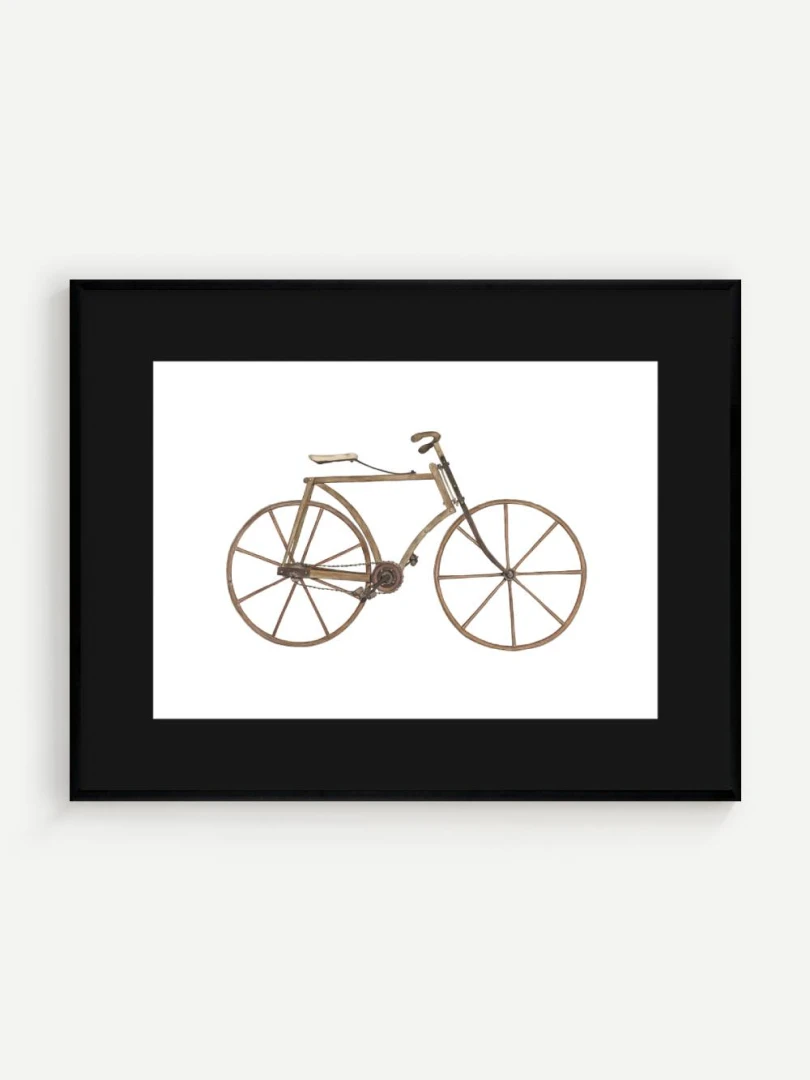 Tento print zachytáva detailnú ilustráciu starého bicykla s dreveným rámom a kolesami, aké sa používali na konci 19. storočia. Je to obraz jednoduchosti a vynaliezavosti – konštrukcia bez zbytočností, surové materiály, čisté línie. Pedále sú priamo napojené na reťazový prevod, sedlo jednoduché a funkčné, riadidlá elegantne zatočené. V každom detaile cítiť remeselnú zručnosť a vtedajšie chápanie pohybu ako niečoho mechanického, ale zároveň ľudsky dostupného.