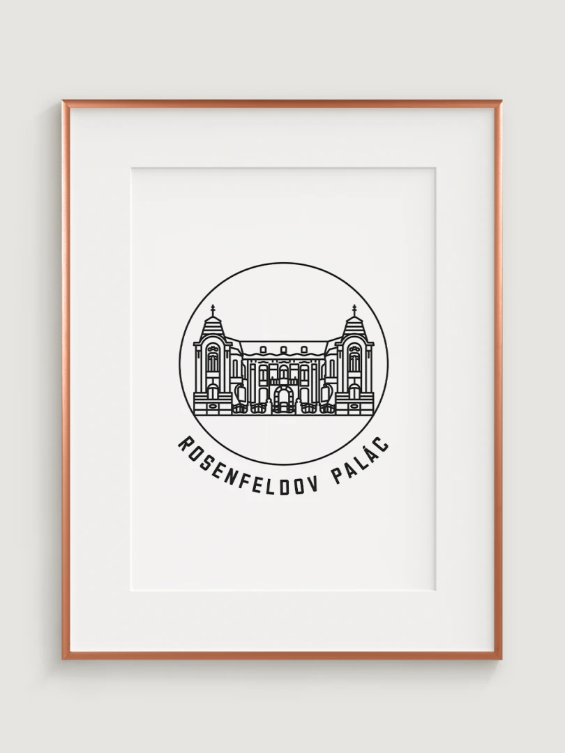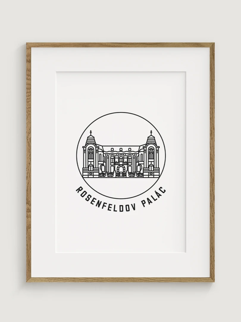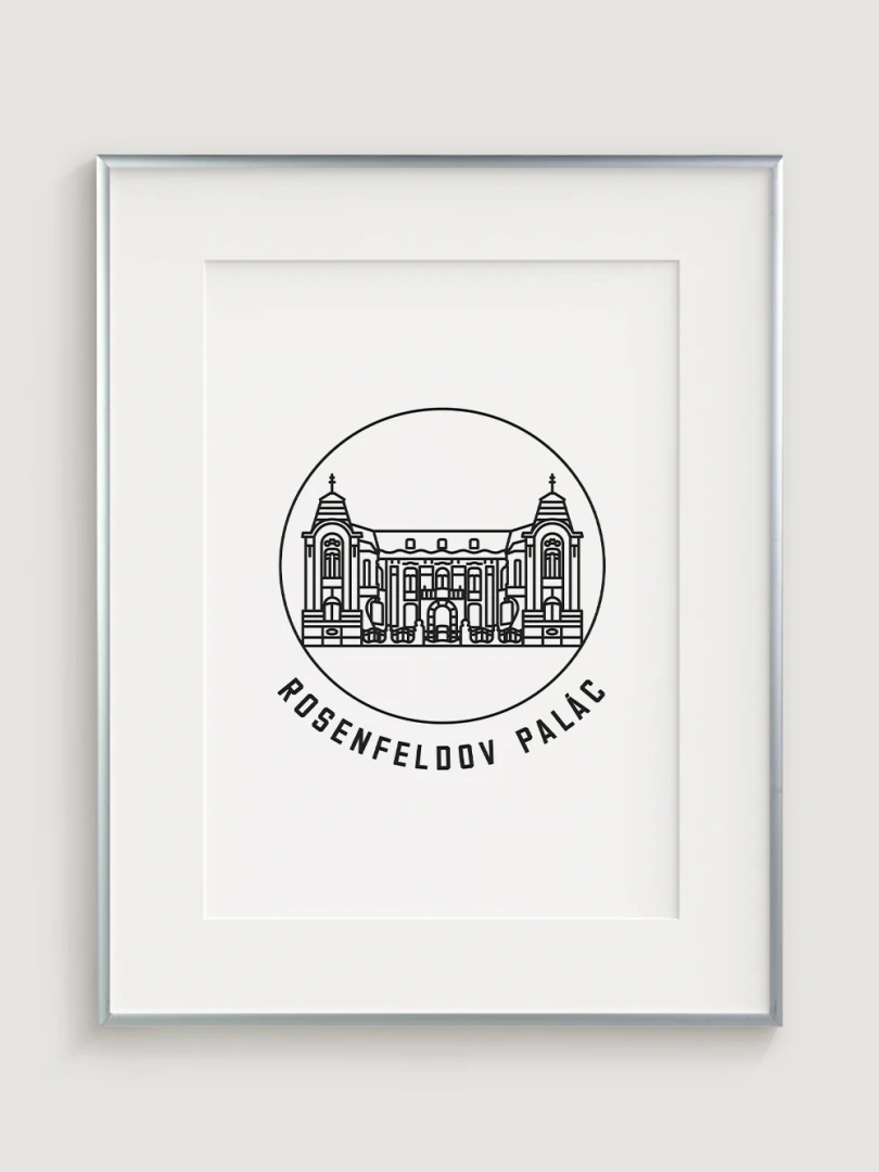 Tento print predstavuje štýlizované, minimalistické zobrazenie Rosenfeldovho paláca v Žiline, budovy, ktorá sa vyznačuje secesným dizajnom a výnimočnými architektonickými prvkami. Vypracovaný s jemnou čiernou linkovou kresbou na kvalitnom papieri, táto ilustrácia zachytáva čisté línie a detaily paláca v nadčasovom a elegantnom štýle.
