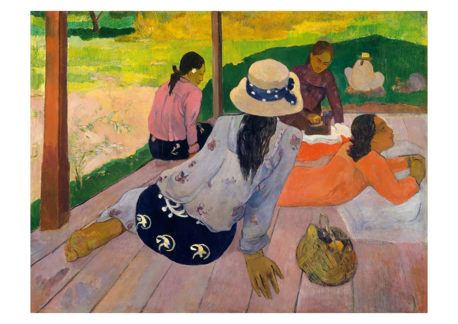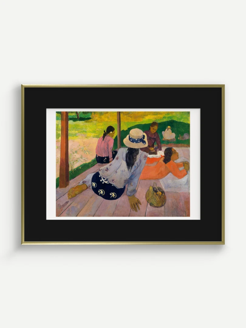 Tento nádherný umelecký print zachytáva pokojnú a harmonickú atmosféru Tahiti, ktorá fascinovala Paula Gauguina počas jeho pobytu na ostrove. Dielo „Siesta“ z roku 1892 zobrazuje skupinu tahitských žien odpočívajúcich na verande, čím dokonale vystihuje ich prirodzenú gráciu a pocit pospolitosti, ktorý mal na umelca hlboký vplyv. Jeho farebnosť a hravá kompozícia dodávajú obrazu živý a uvoľnený charakter.