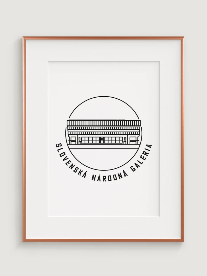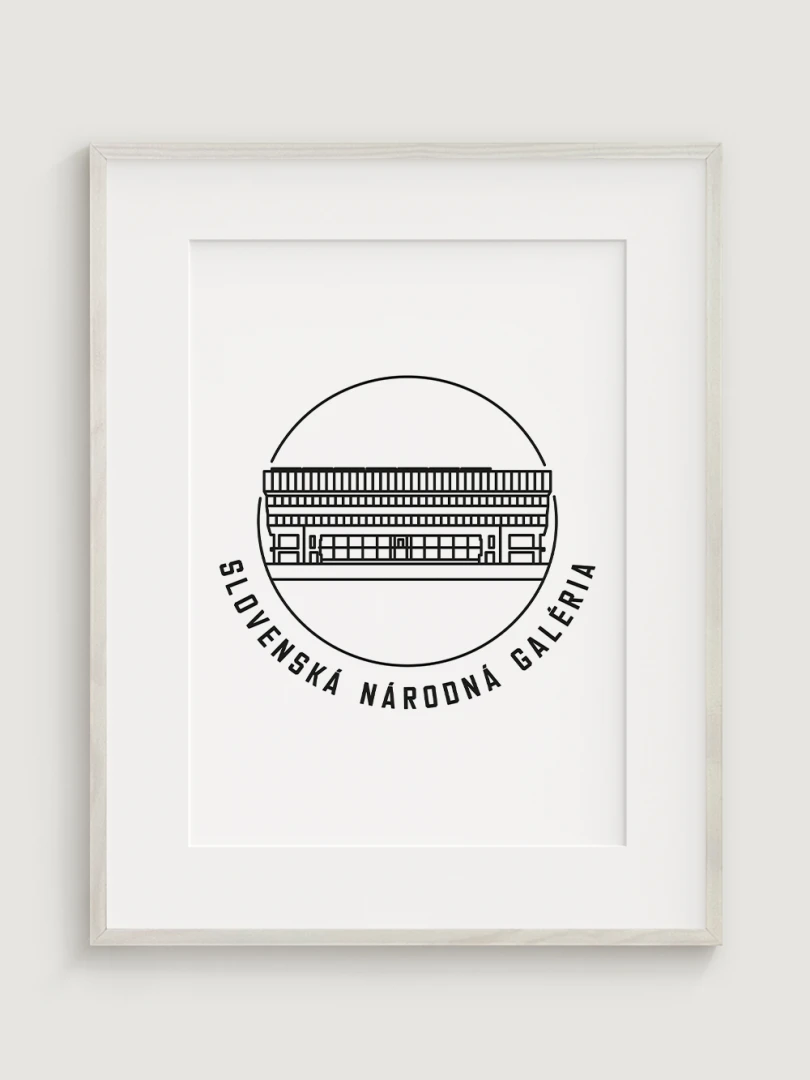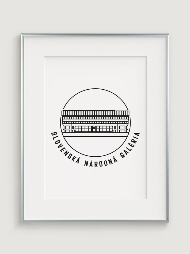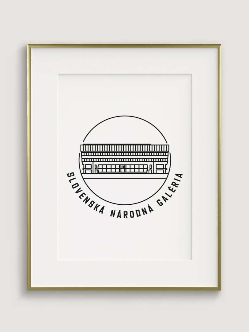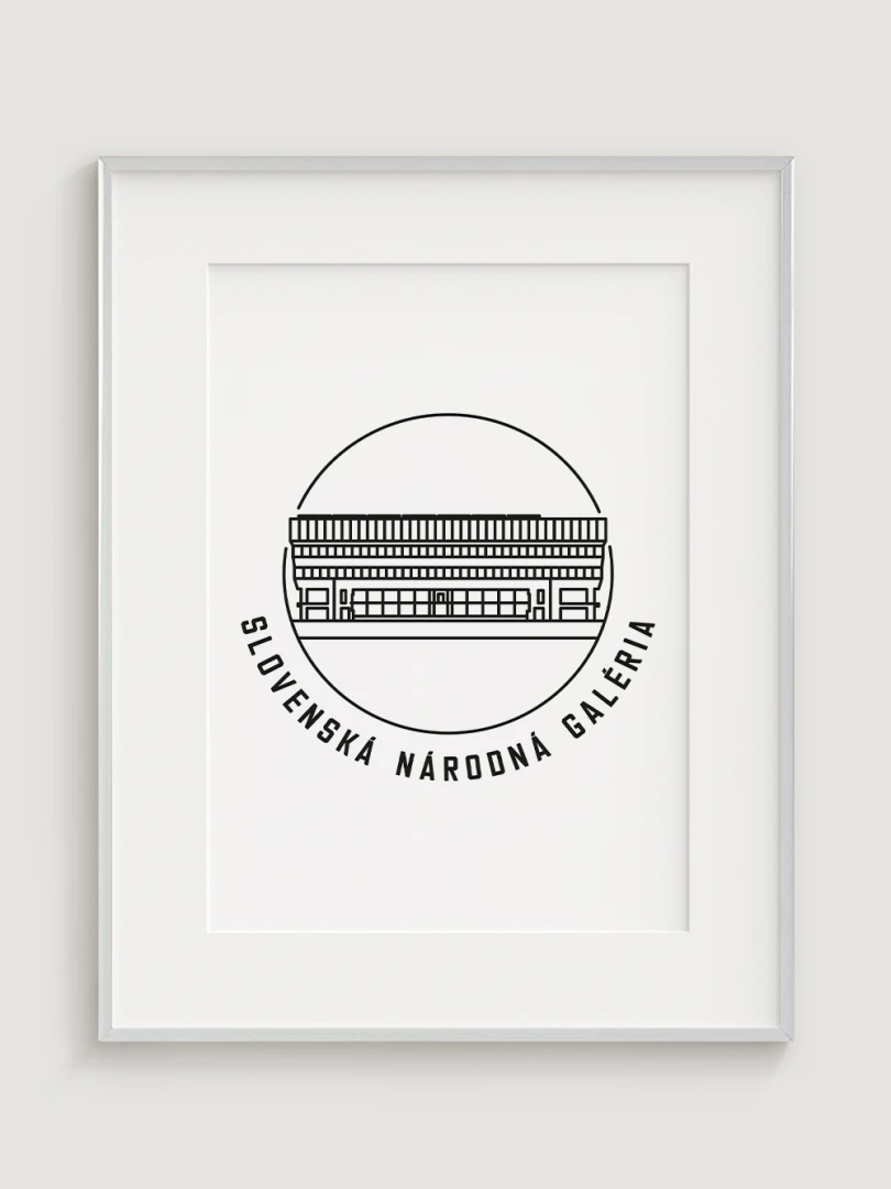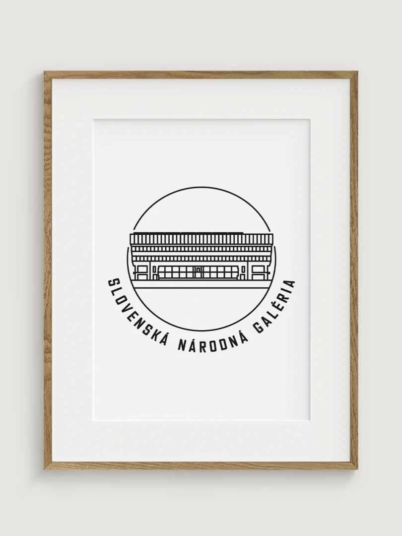 Tento kúsok elegantne zachytáva modernistickú fasádu jednej z popredných kultúrnych inštitúcií na Slovensku v čistom minimalistickom štýle, ktorý zdôrazňuje jej jedinečné štrukturálne prvky a mestskú prítomnosť. Realizovaná ostrým čiernym atramentom na kvalitnom papieri, táto práca zvýrazňuje podstatu galérie do jednoduchých geometrických tvarov a čistých línií, ideálnych pre tých, ktorí oceňujú umenie aj architektúru. Kruhový rám v potlači priťahuje pohľad priamo na detailné zobrazenie budovy, čo ho robí výrazným doplnkom do akéhokoľvek priestoru.