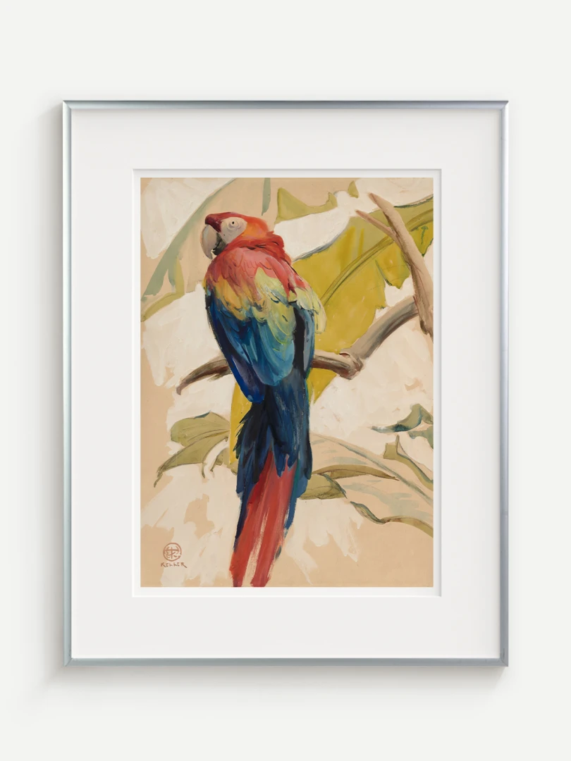 Papagáj na obraze pôsobí majestátne a zároveň trochu mrzuto, čo dodáva dielu osobitý charakter. Kellerova technika akvarelu umožňuje jemné prechody farieb a vytvára dojem hĺbky a textúry peria.