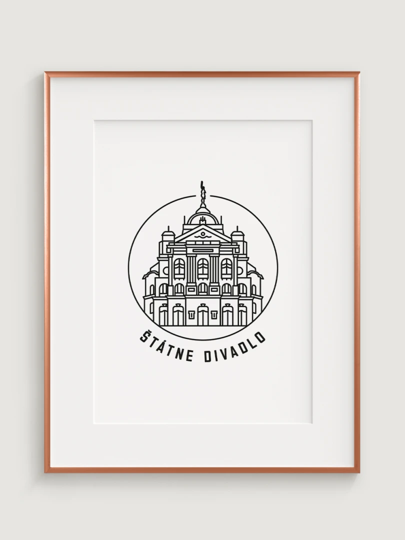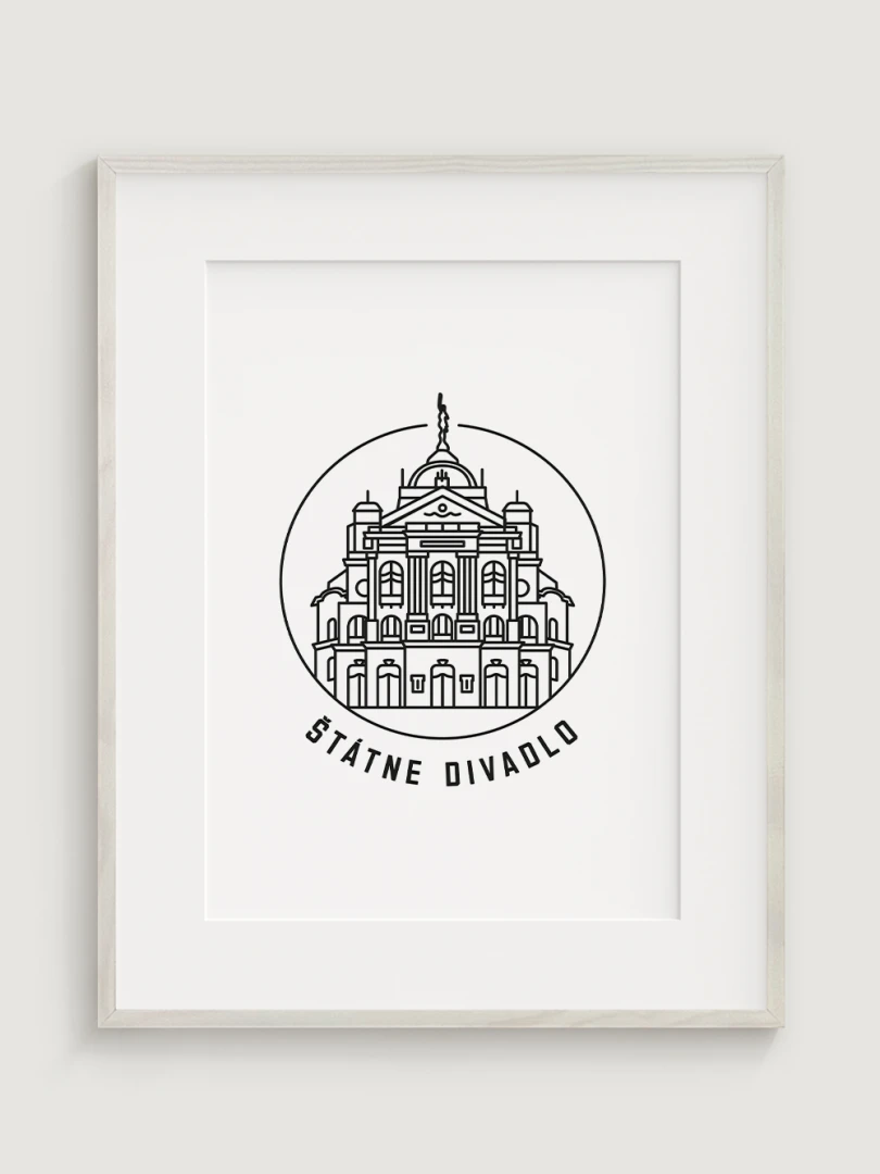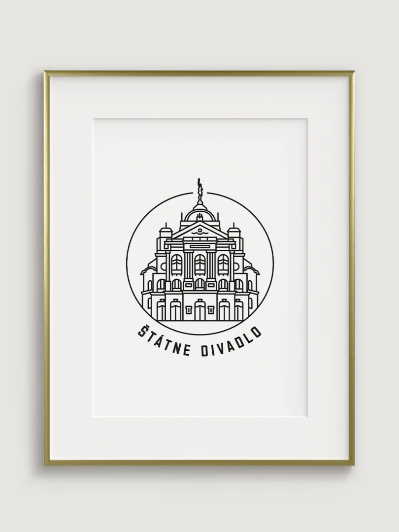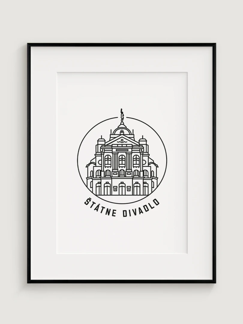 Tento print predstavuje štýlizované, minimalistické zobrazenie Štátneho divadla v Košiciach, budovy, ktorá spája historickú krásu s moderným kultúrnym významom. Vypracovaný s jemnou čiernou linkovou kresbou na kvalitnom papieri, táto ilustrácia verne odráža eleganciu a detailnú architektúru divadla v nadčasovom štýle.
