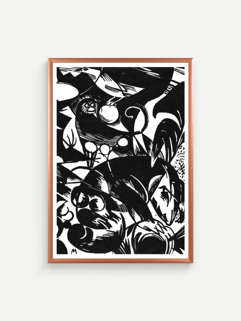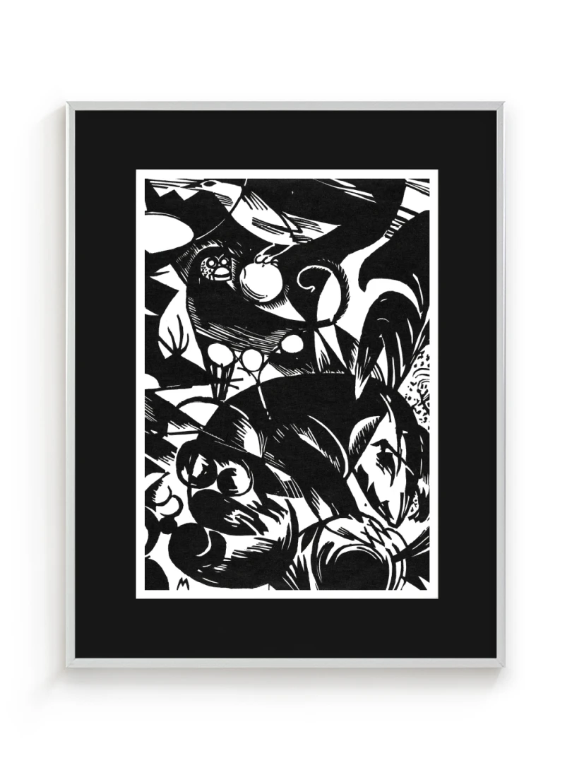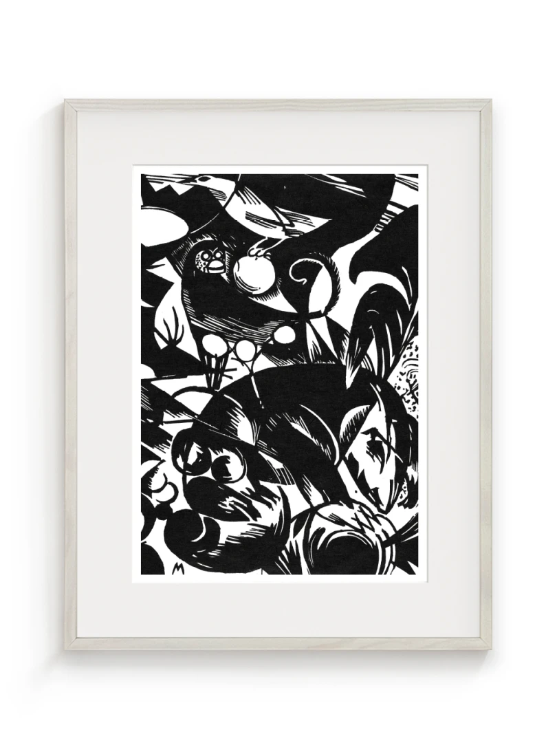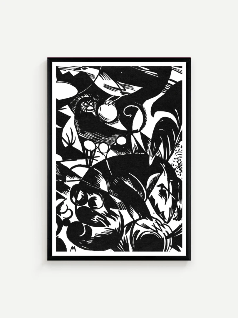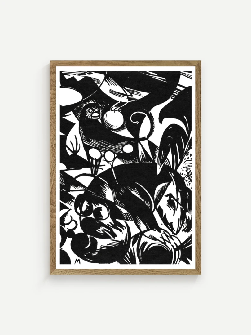Tento print vychádza z drevorytu Stvorenie I (Schöpfungsgeschichte I, Creation I), ktorý vytvoril nemecký maliar Franz Marc v roku 1914. Dielo bolo publikované až po jeho smrti, v roku 1922, ako súčasť prestížneho Bauhaus portfólia Neue Europäische Graphik III: Deutsche Künstler. V typickej expresionistickej estetike je obraz stvárnený ostrými líniami, silným kontrastom čiernej a bielej a dynamickou, až násilne zhutnenou kompozíciou.