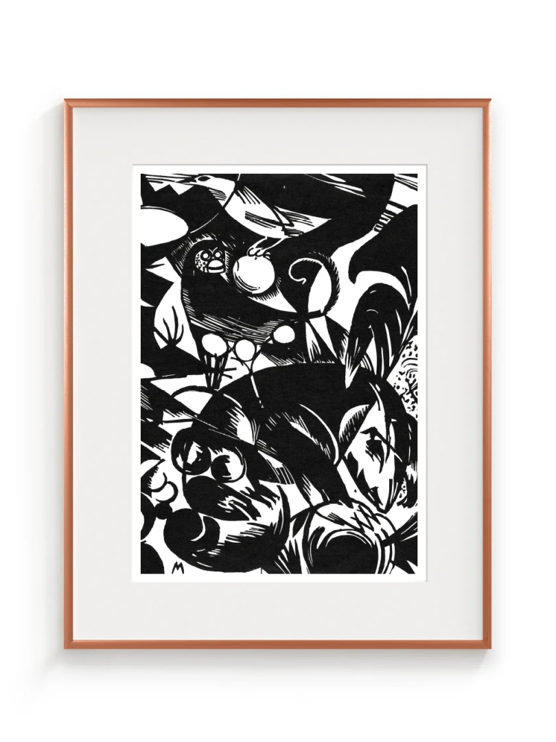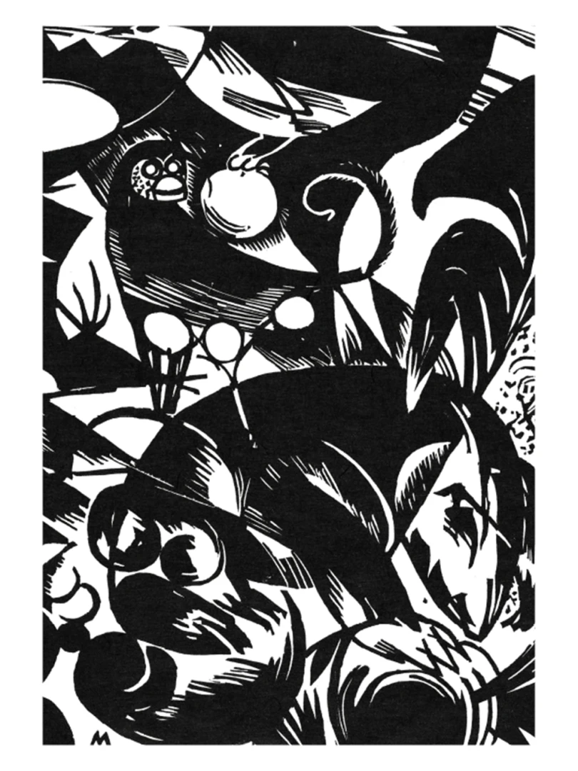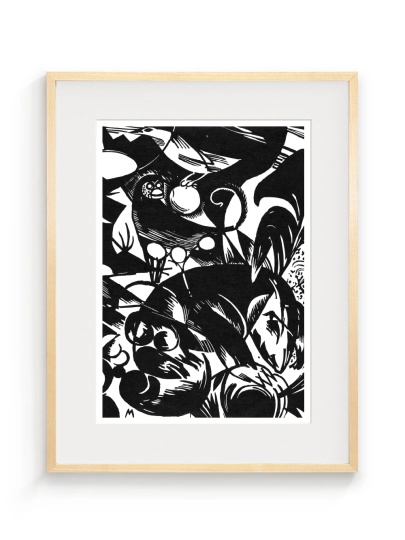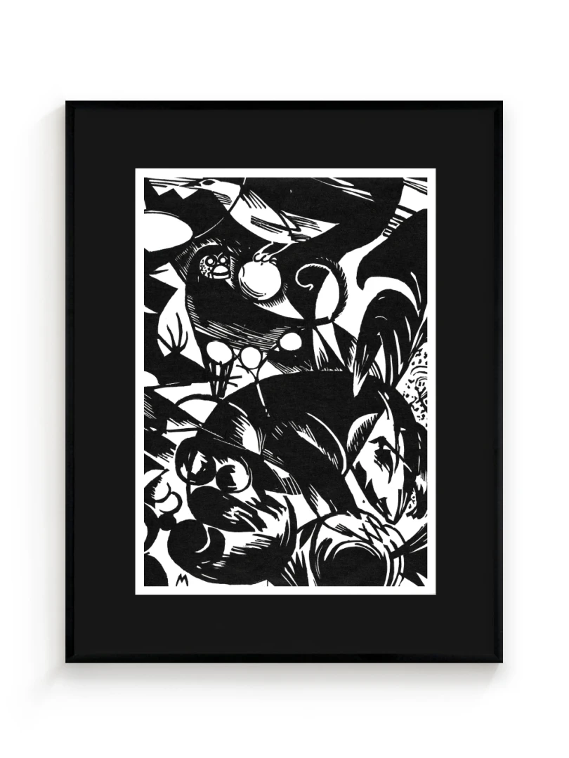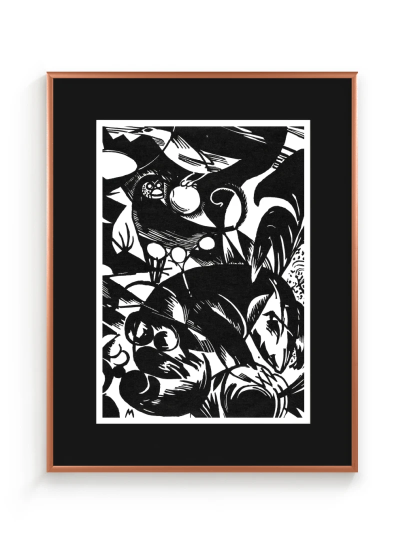 Tento print vychádza z drevorytu Stvorenie I (Schöpfungsgeschichte I, Creation I), ktorý vytvoril nemecký maliar Franz Marc v roku 1914. Dielo bolo publikované až po jeho smrti, v roku 1922, ako súčasť prestížneho Bauhaus portfólia Neue Europäische Graphik III: Deutsche Künstler. V typickej expresionistickej estetike je obraz stvárnený ostrými líniami, silným kontrastom čiernej a bielej a dynamickou, až násilne zhutnenou kompozíciou.