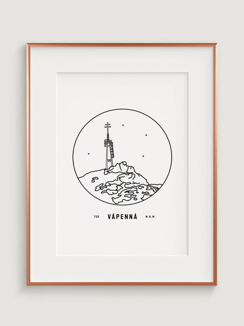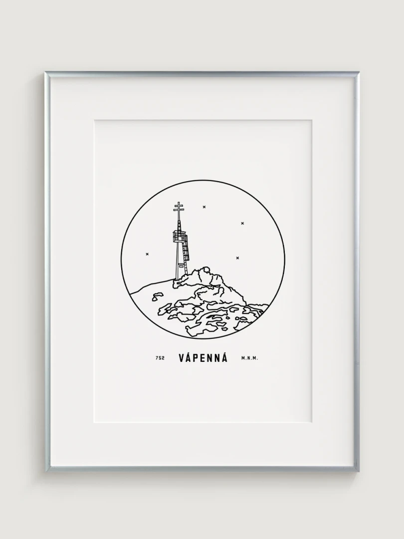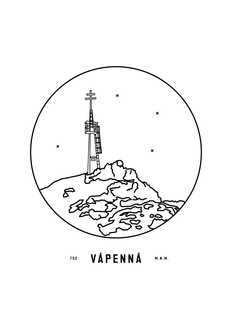 Vápenná je znázornená v detailnej kruhovej vinete s uvedením jeho názvu a nadmorskej výšky, čo vytvára jedinečný a estetický doplnok pre milovníkov prírody a hôr. Tento print je ideálnym darčekom pre tých, ktorí si chcú domov priniesť kúsok slovenskej krajiny a majestátnosť jej vrcholov.