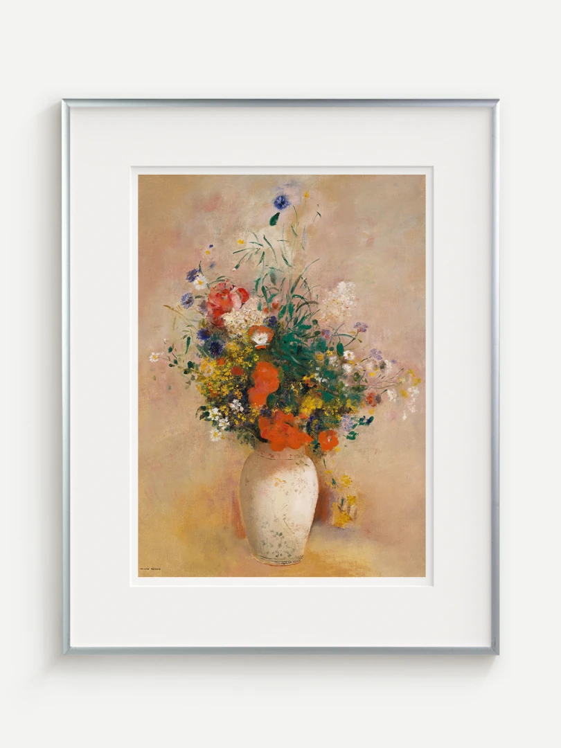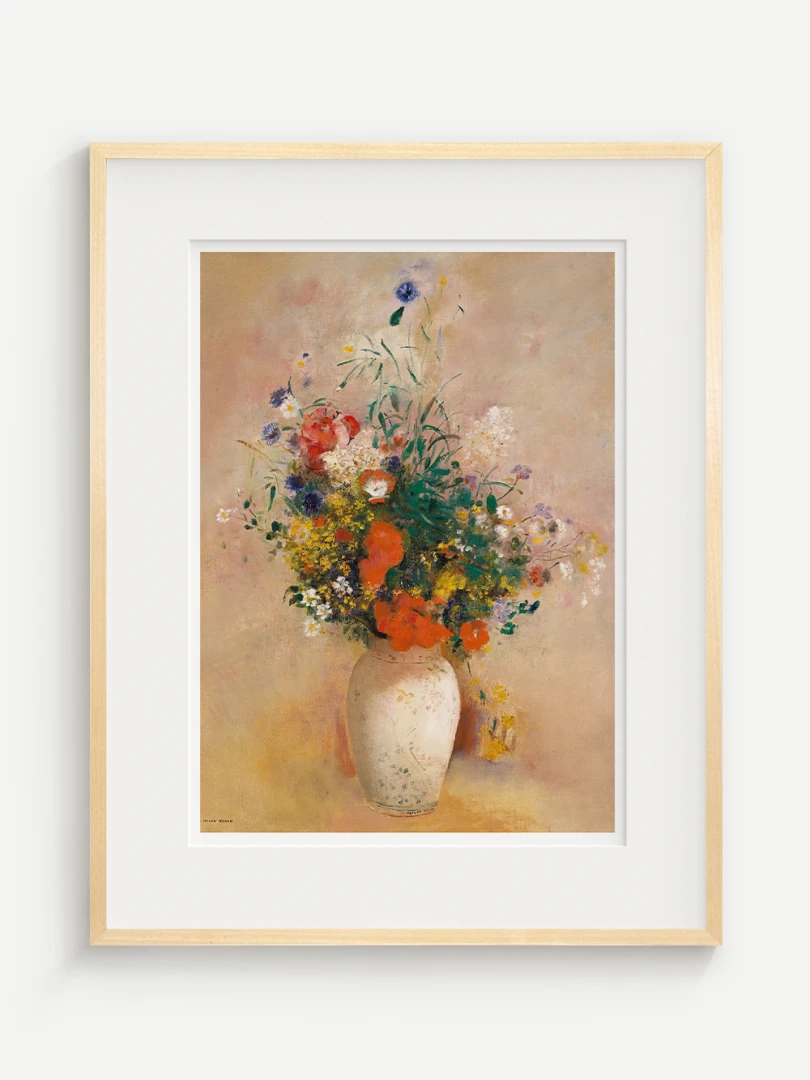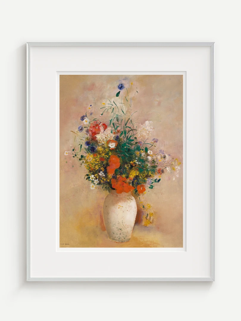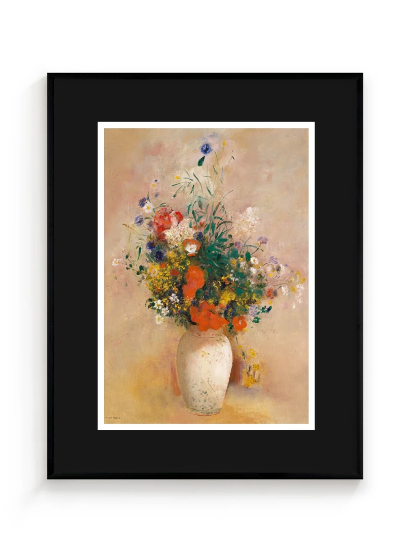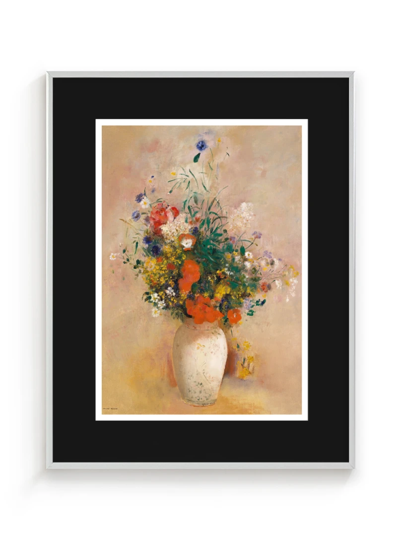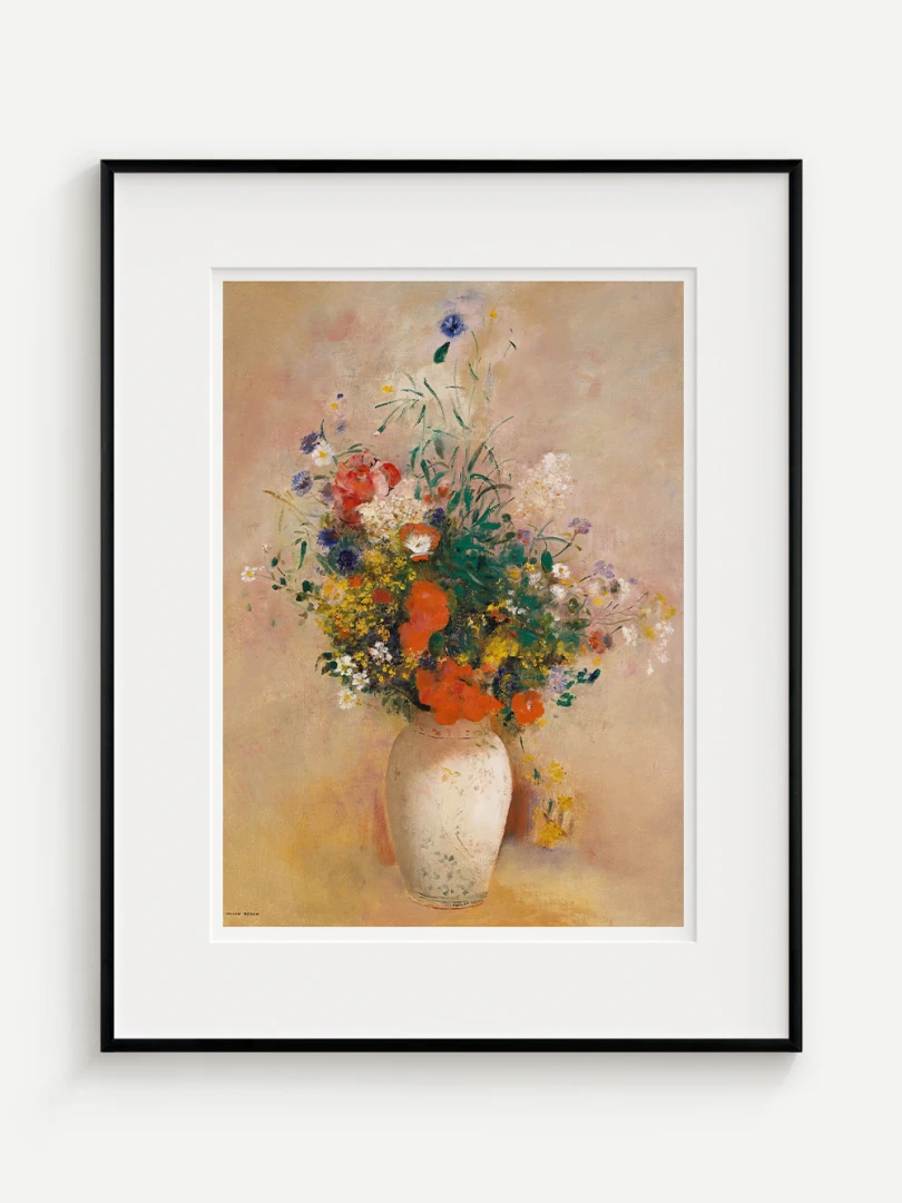 Tento print vychádza z obrazu Váza s kvetinami (Vase of Flowers), ktorý v roku 1905 vytvoril francúzsky symbolistický maliar Odilon Redon. Dielo zobrazuje kyticu pestrých kvetov v jednoduchej váze, pričom kompozícia a farebnosť vytvárajú dojem snovej atmosféry. Redon, známy svojimi dielami plnými fantázie a symboliky, tu využíva sýte farby a jemné línie.