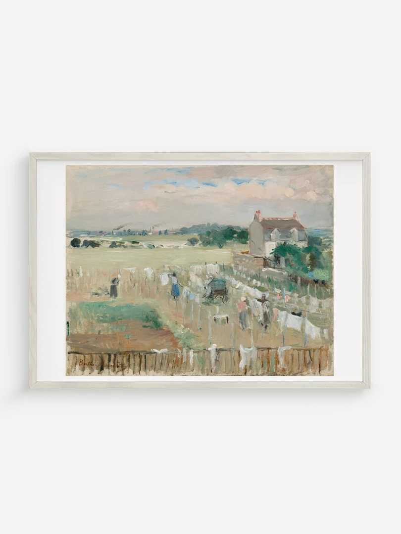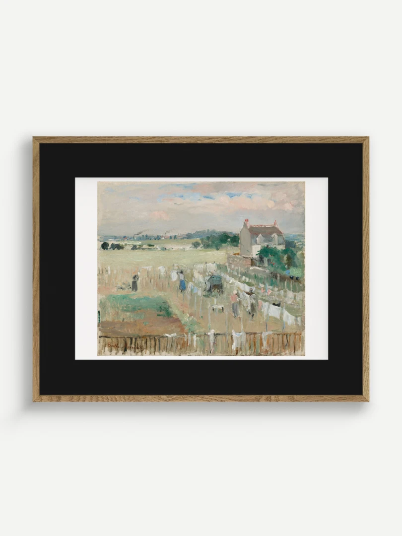 Tento nádherný umelecký print zachytáva bežný každodenný okamih, ktorý Berthe Morisot pretvorila na scénu plnú svetla a pohybu. Dielo „Vešanie prádla“ patrí medzi jej najikonickejšie maľby a dokonale vystihuje impresionistický štýl, kde dominuje hra svetla, voľné štetecné ťahy a prirodzená atmosféra.