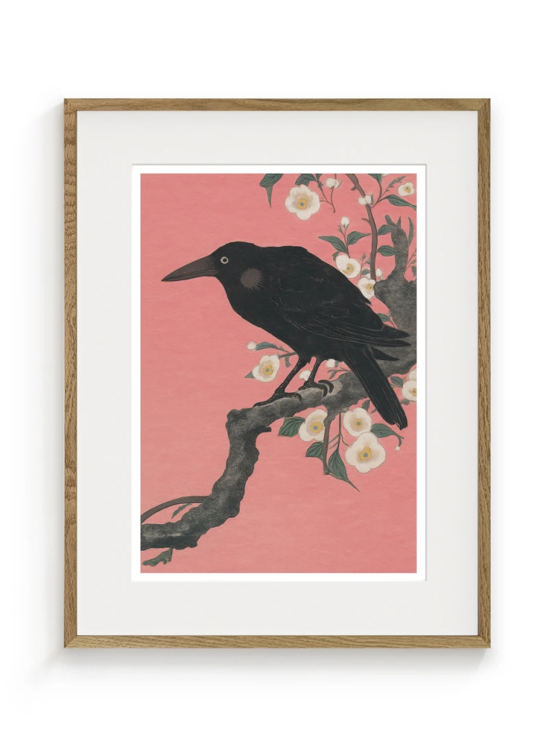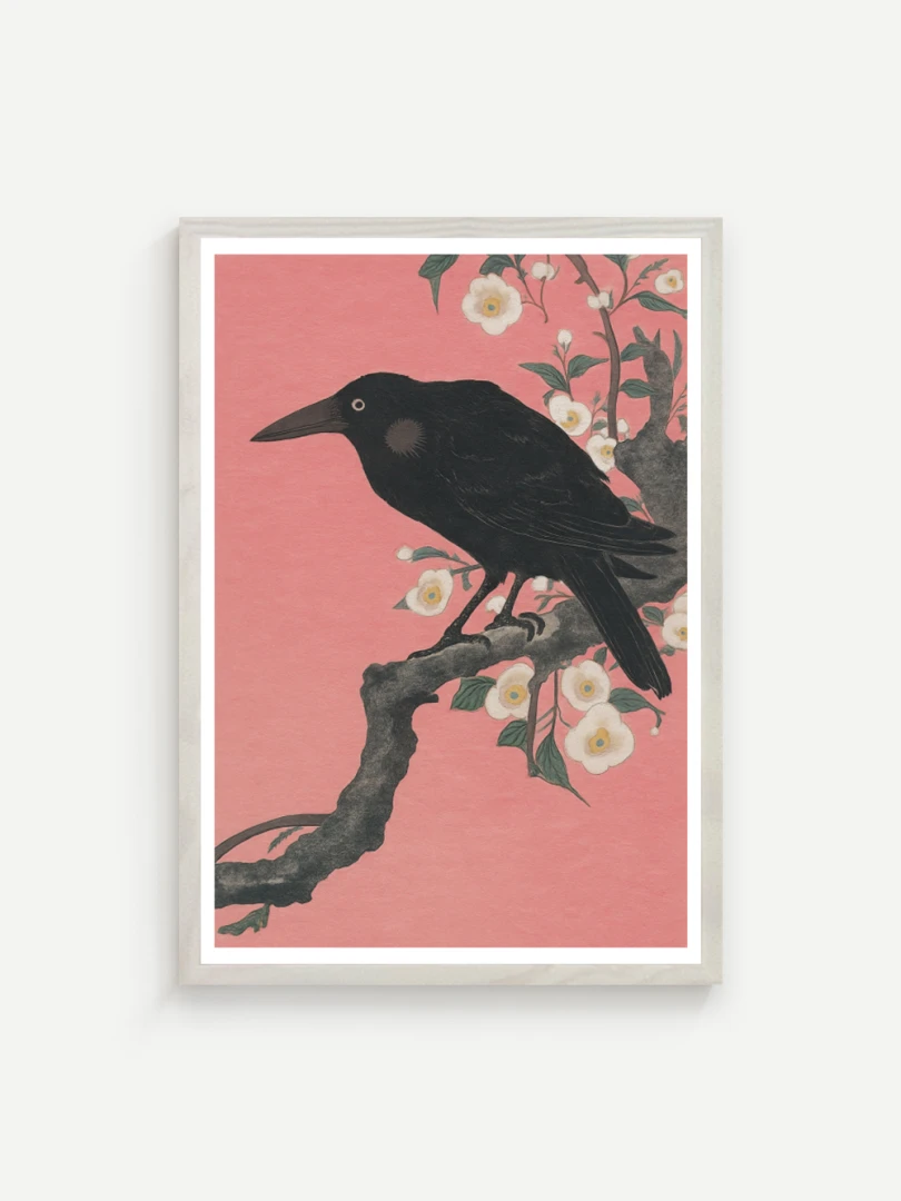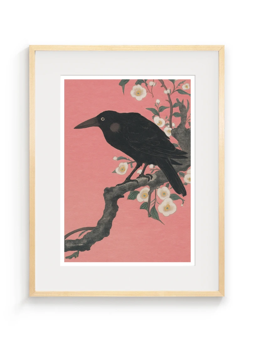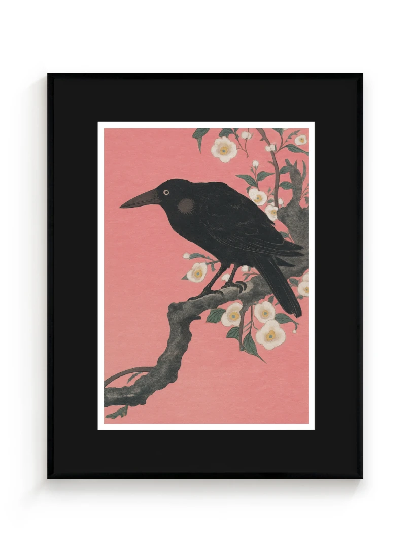 Print vychádza z pôvodného japonského drevorytu Crow on a Cherry Branch (Vrana na Čerešňoveh vetve) ktor vytvoril Ohara Koson.