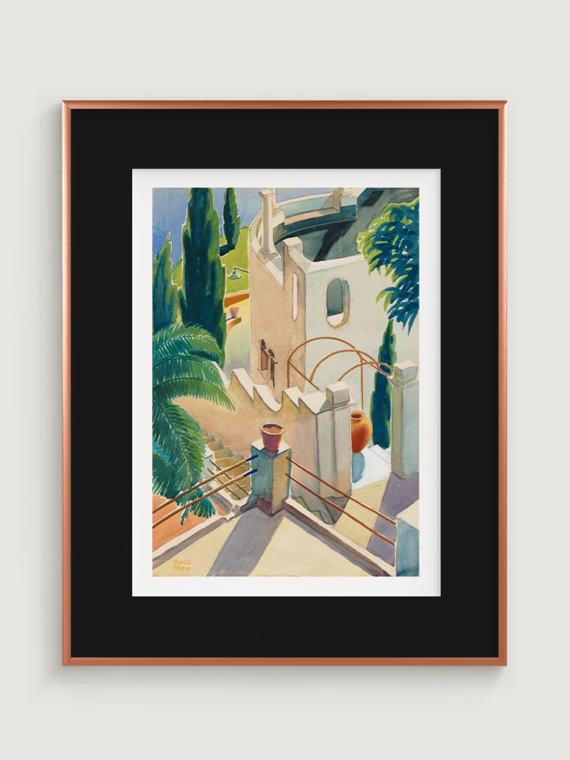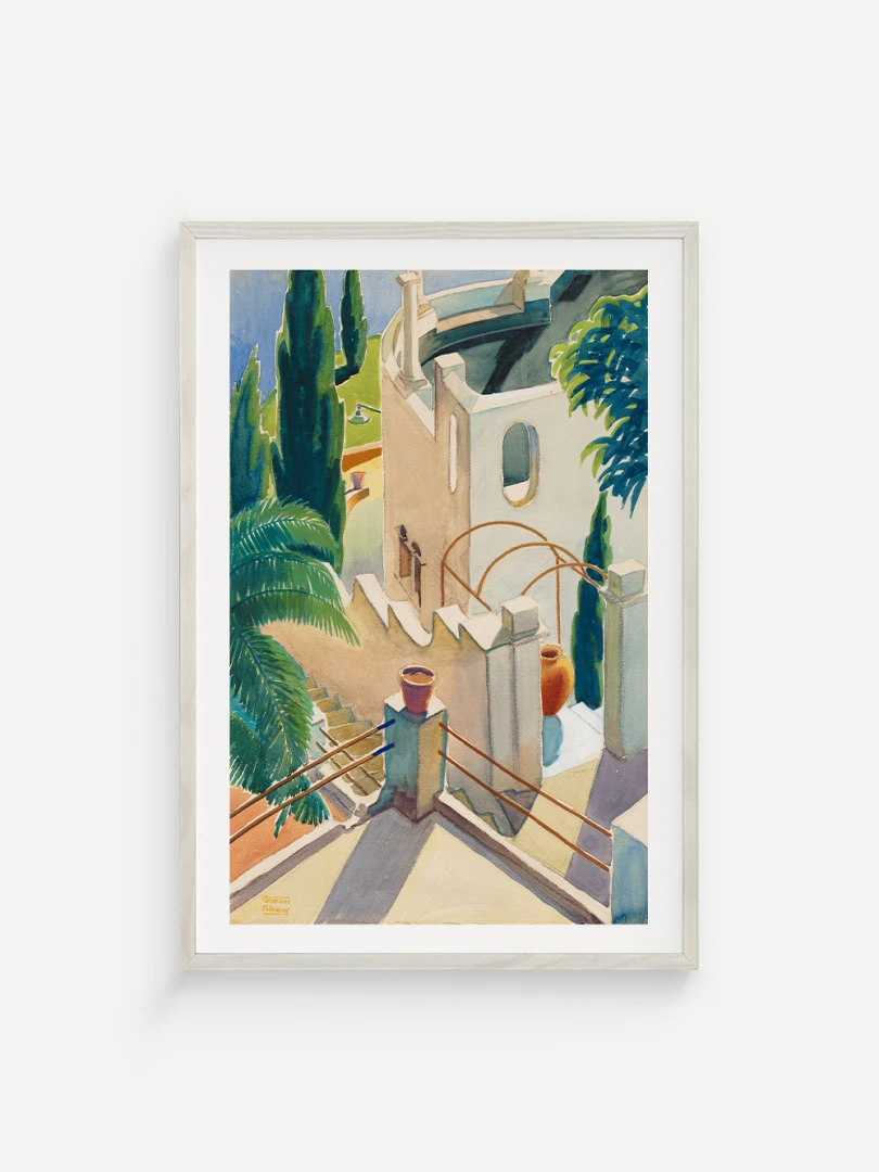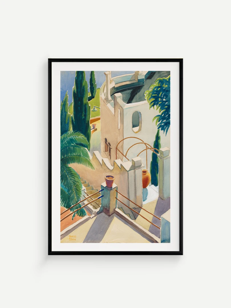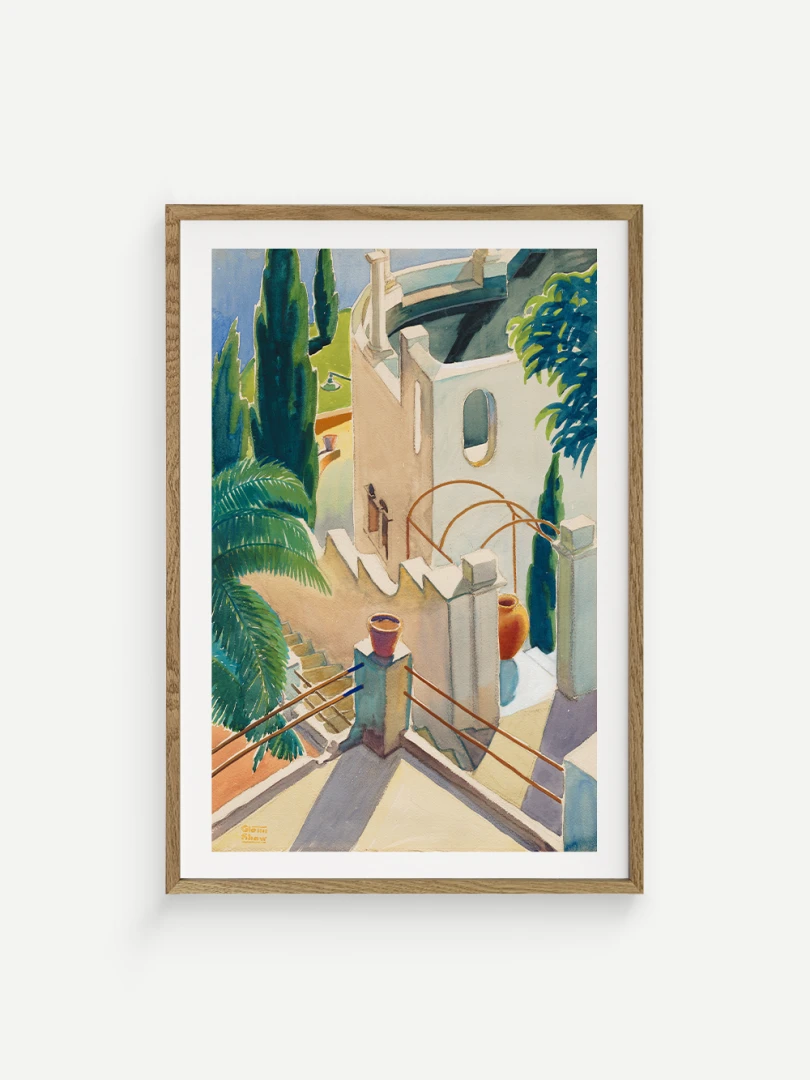 Tento print zachytáva scénu z obrazu Z nášho balkóna (From Our Balcony), ktorý americký umelec Glenn Moore Shaw namaľoval v roku 1928. Dielo pôsobí intímne a zároveň otvorene – cez jemné kovové zábradlie balkóna sa pred nami rozprestiera výhľad na pokojné ulice lemované palmami, ktoré okamžite evokujú južnú, prímorskú atmosféru. V kombinácii s teplým svetlom a tlmenými tónmi pôsobí obraz takmer tropicky – akoby zachytával neskoré popoludnie v tichej, slnkom prehriatej štvrti.