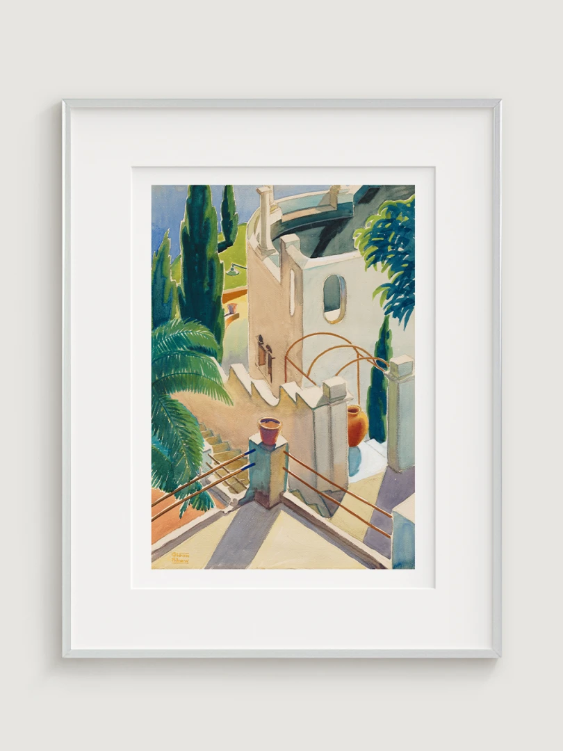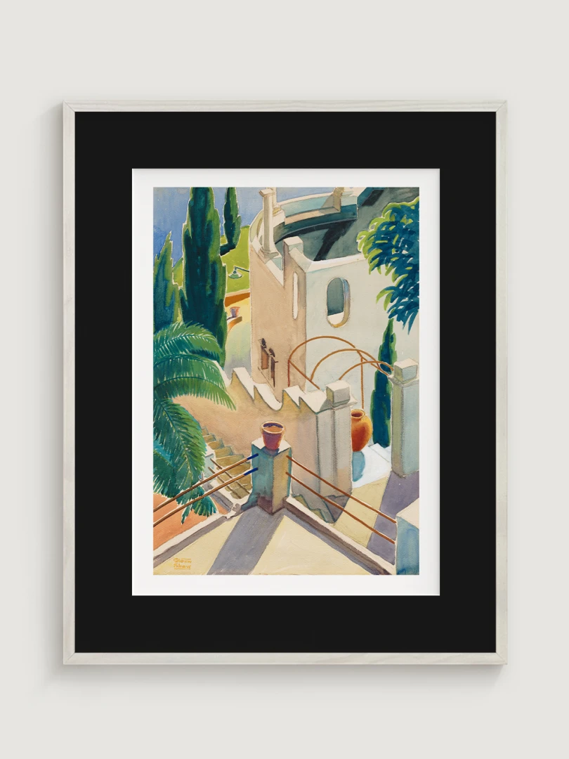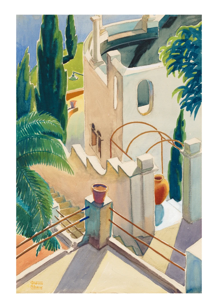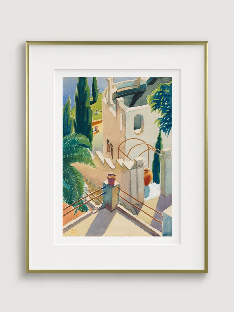 Tento print zachytáva scénu z obrazu Z nášho balkóna (From Our Balcony), ktorý americký umelec Glenn Moore Shaw namaľoval v roku 1928. Dielo pôsobí intímne a zároveň otvorene – cez jemné kovové zábradlie balkóna sa pred nami rozprestiera výhľad na pokojné ulice lemované palmami, ktoré okamžite evokujú južnú, prímorskú atmosféru. V kombinácii s teplým svetlom a tlmenými tónmi pôsobí obraz takmer tropicky – akoby zachytával neskoré popoludnie v tichej, slnkom prehriatej štvrti.