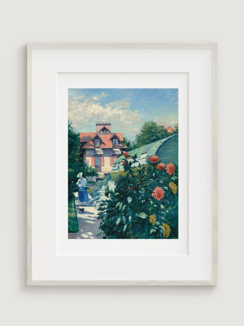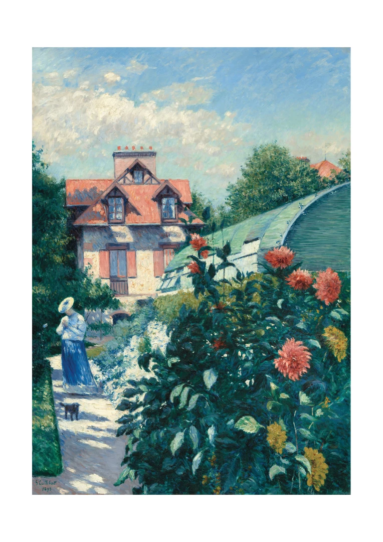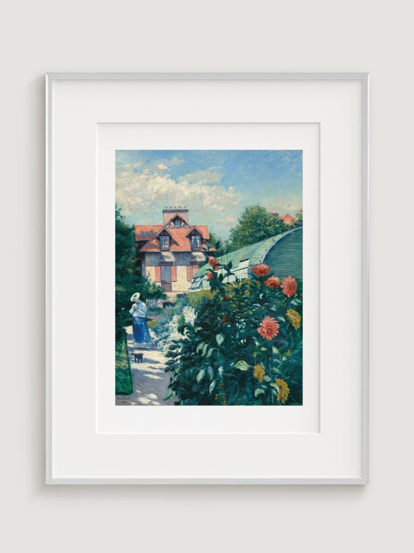 Tento print zobrazuje starostlivo vyobrazenú záhradu s rozkvitnutými kvetmi, skleníkom a domom v pozadí. Caillebotteho majstrovské používanie svetla a tieňa, spolu s bohatou farebnou paletou, vytvára nádhernú atmosféru letného dňa plného pokoja a krásy.