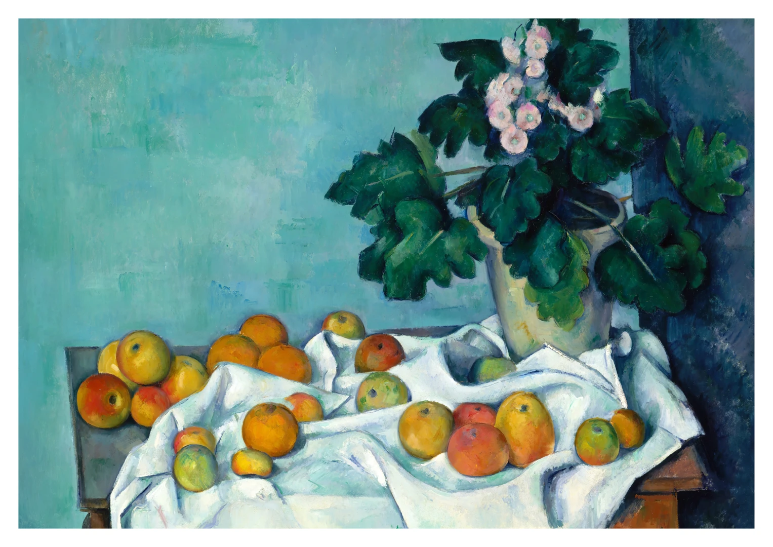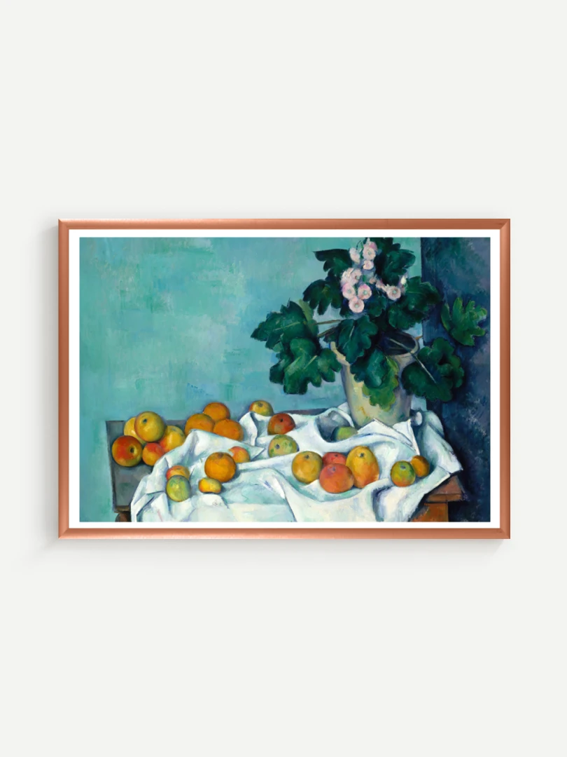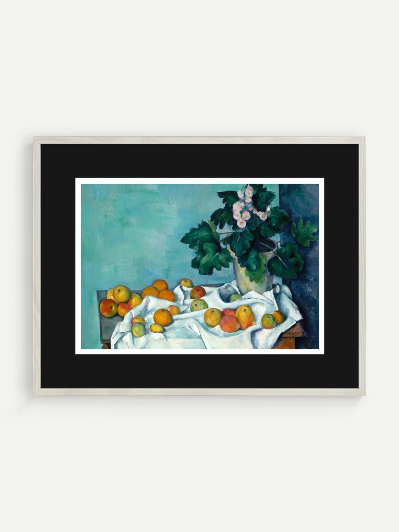 Tento print vychádza z obrazu Zátišie s jablkami a prvosienkou (Still Life with Apples and a Pot of Primroses), ktorý Paul Cézanne namaľoval približne v roku 1890. Na prvý pohľad ide o klasické zátišie: stôl, ovocie, kvetináč, skladaný textil. No v Cézannovom podaní sa bežné objekty premieňajú na kompozíciu hmoty, svetla a priestoru, kde každý predmet má svoju váhu a ticho.
