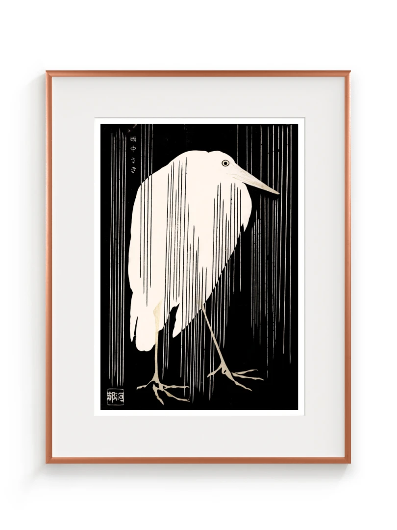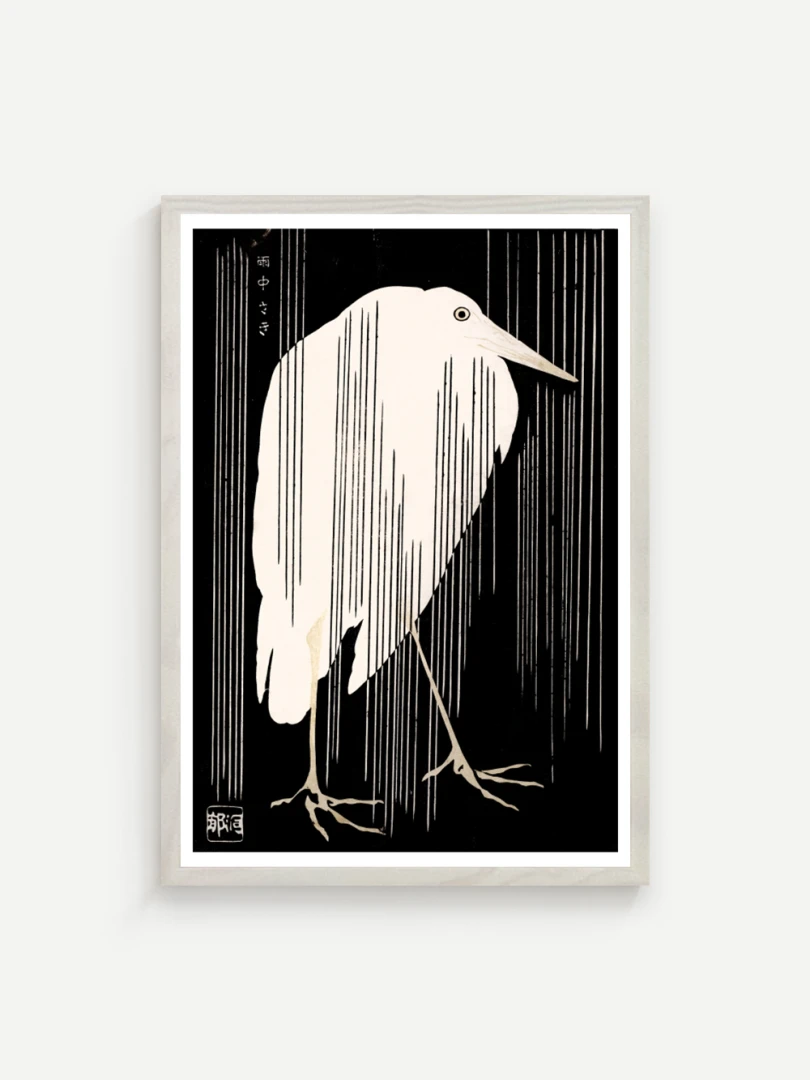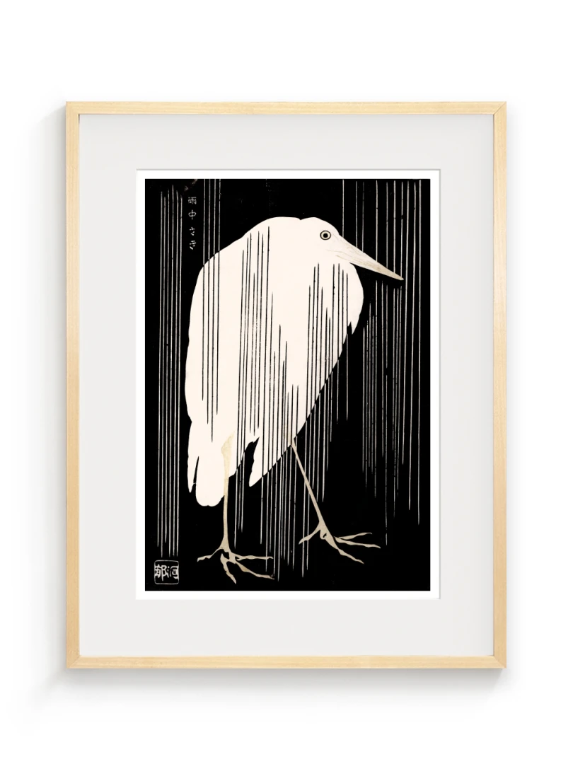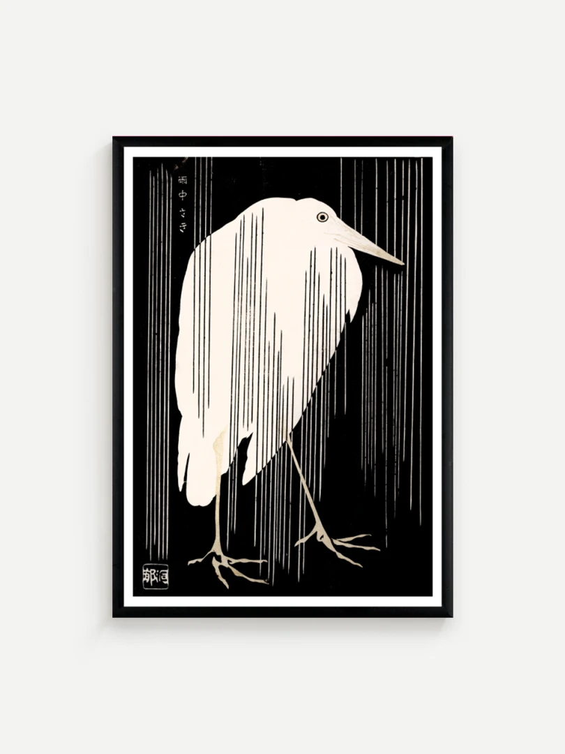 Tento print vychádza z diela Žeriav s padajúcim dažďom (Crane with Falling Rain), ktoré okolo roku 1925 vytvoril japonský majster drevorytu Yoshijirō Urushibara. Zachytáva osamelého žeriava v daždi – scénu, ktorá je výnimočne jednoduchá, no citlivo vyvážená a vizuálne silná. Jemné línie, tlmená farebnosť a pokojná kompozícia vytvárajú meditujúcu náladu, typickú pre najlepšie diela japonskej grafiky.