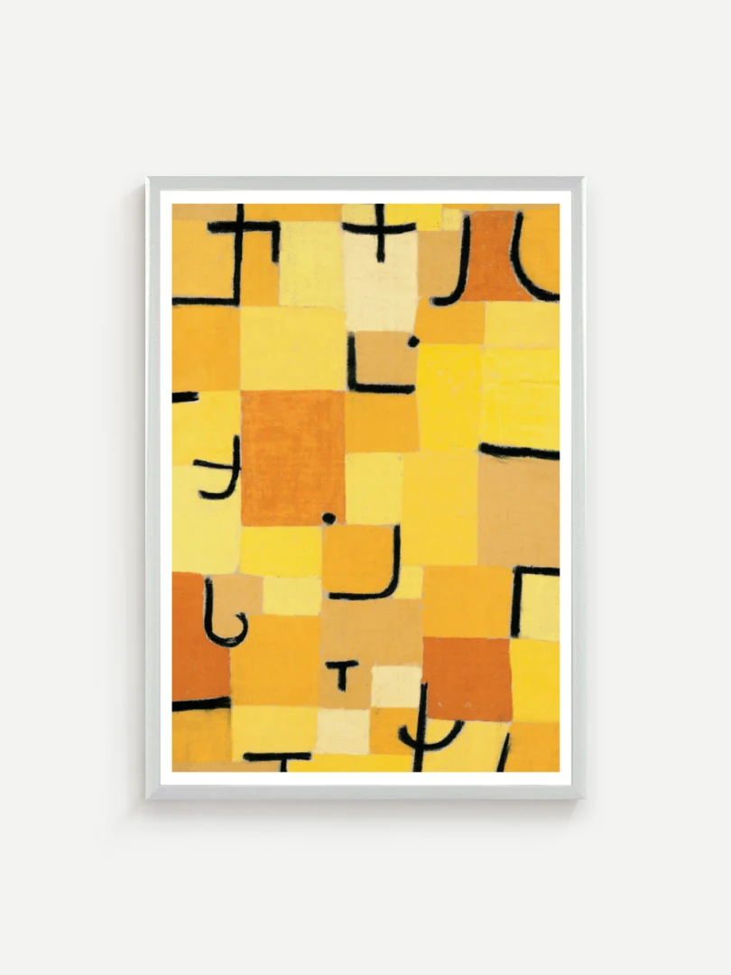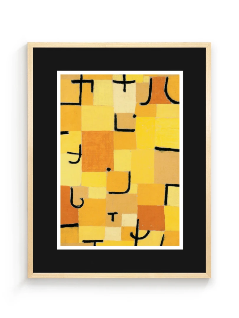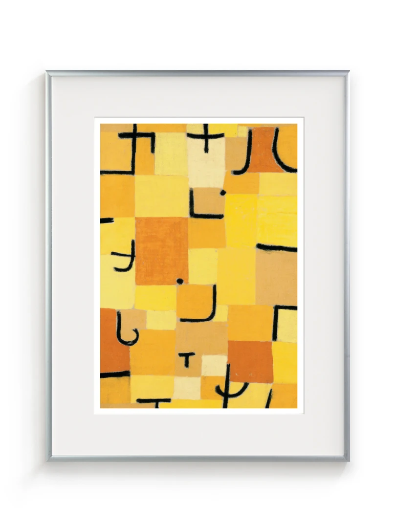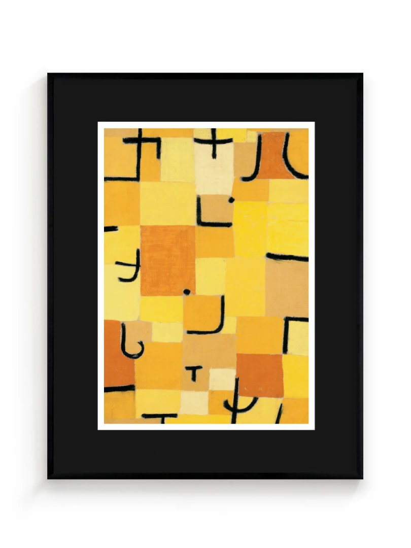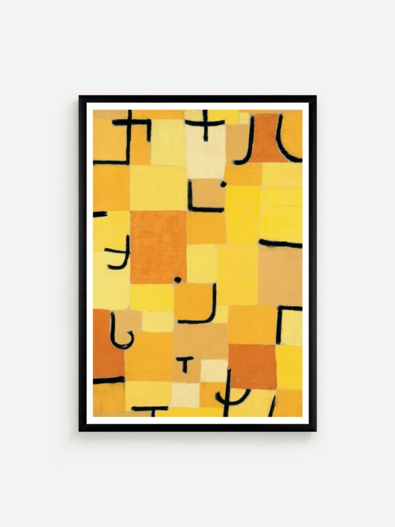 Tento print vychádza z obrazu Znaky v žltej (Zeichen in Gelb), ktorý Paul Klee vytvoril v roku 1937. Dielo je charakteristické svojou abstraktnou kompozíciou, kde sa žlté a oranžové štvorce prelínajú s čiernymi znakmi pripomínajúcimi písmo. Kleeho záujem o kombináciu farby a symbolu vytvára vizuálny jazyk, ktorý je zároveň hravý aj hlboký.