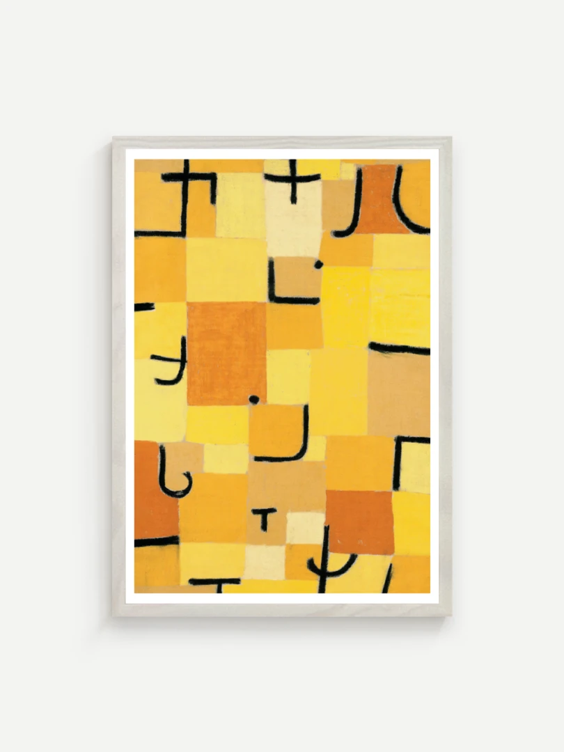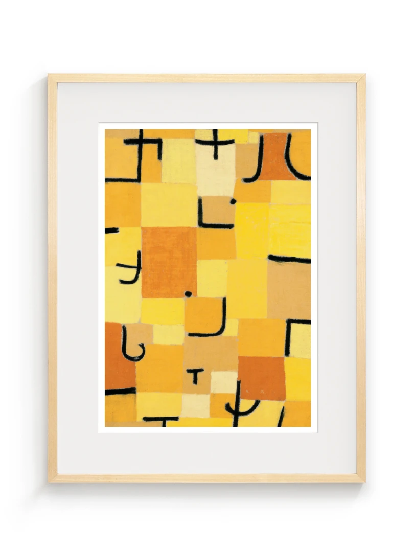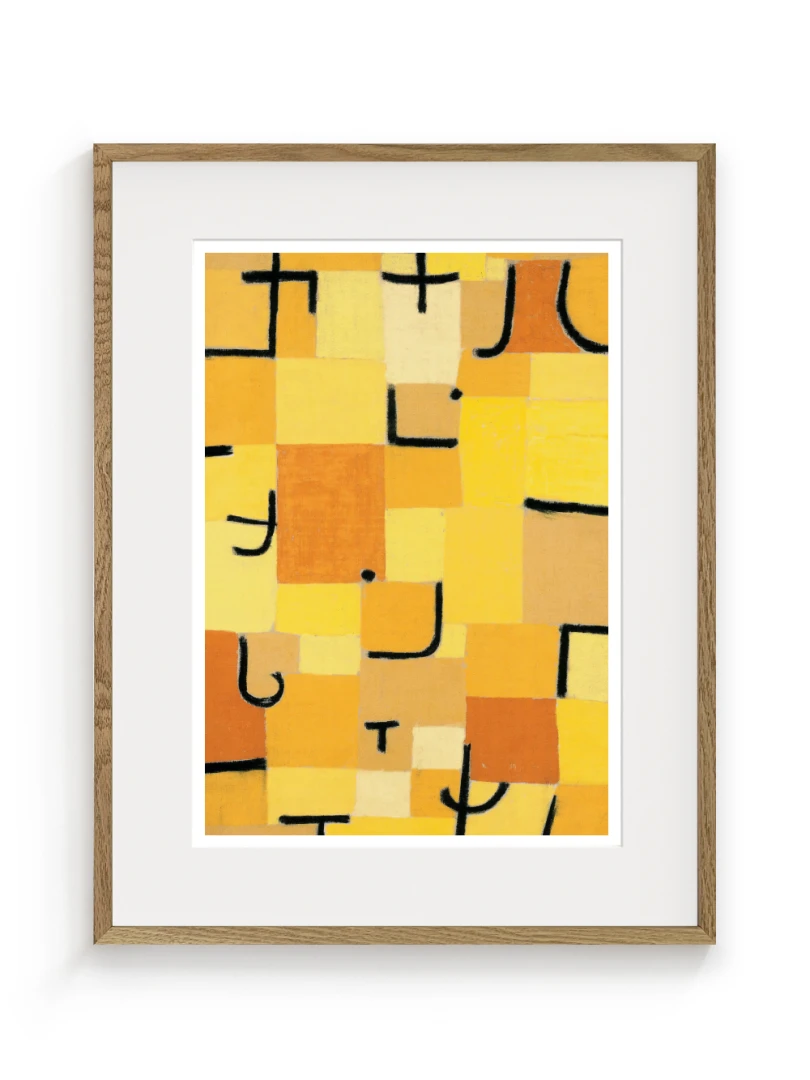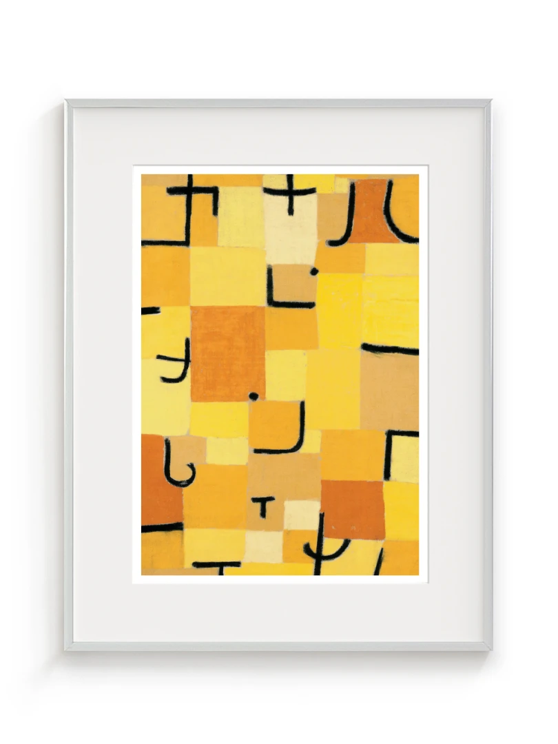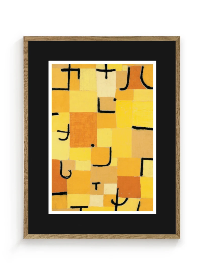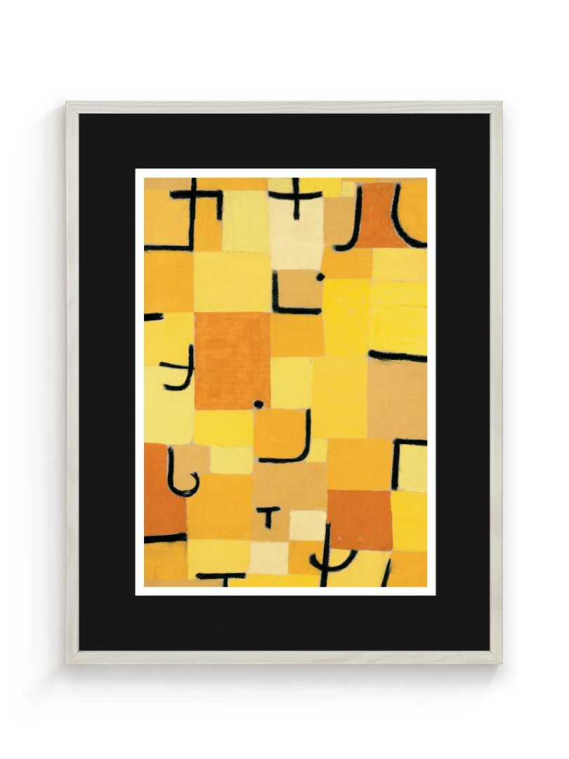 Tento print vychádza z obrazu Znaky v žltej (Zeichen in Gelb), ktorý Paul Klee vytvoril v roku 1937. Dielo je charakteristické svojou abstraktnou kompozíciou, kde sa žlté a oranžové štvorce prelínajú s čiernymi znakmi pripomínajúcimi písmo. Kleeho záujem o kombináciu farby a symbolu vytvára vizuálny jazyk, ktorý je zároveň hravý aj hlboký.