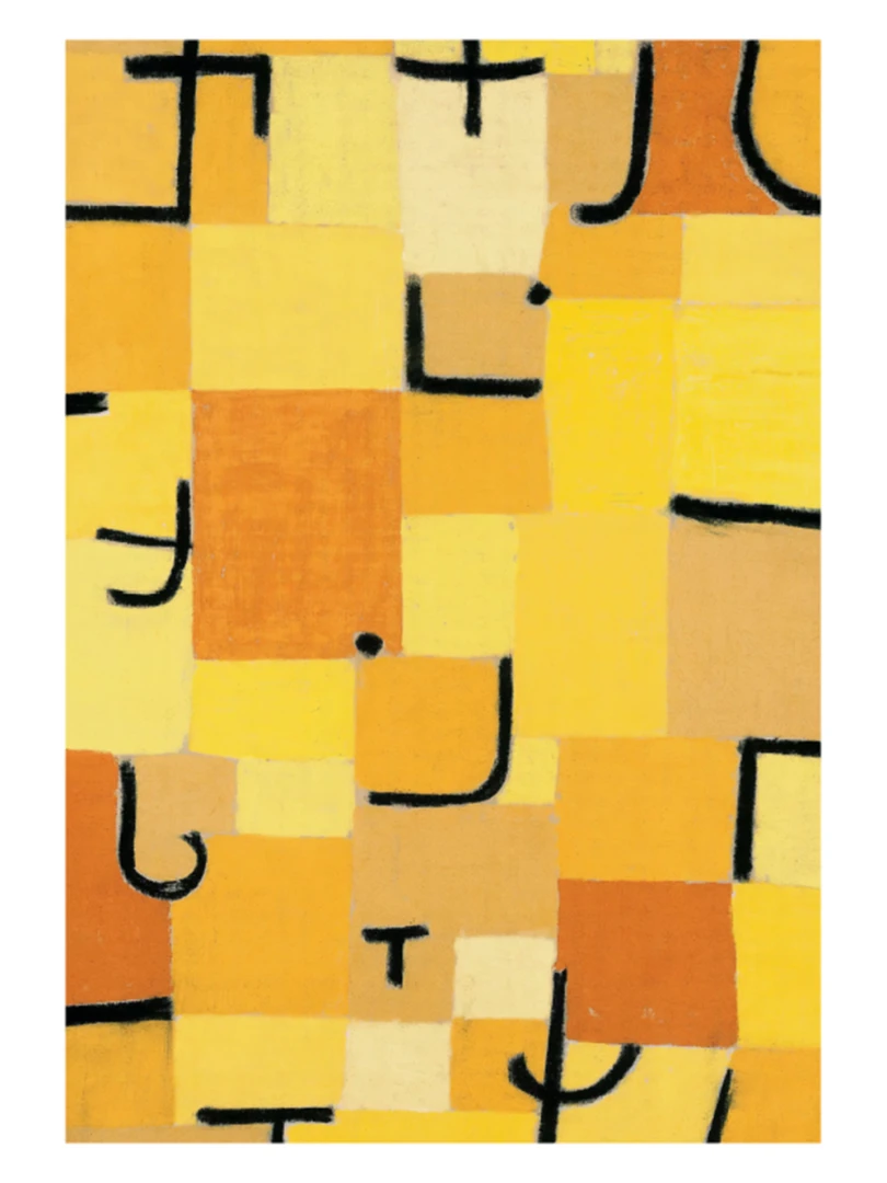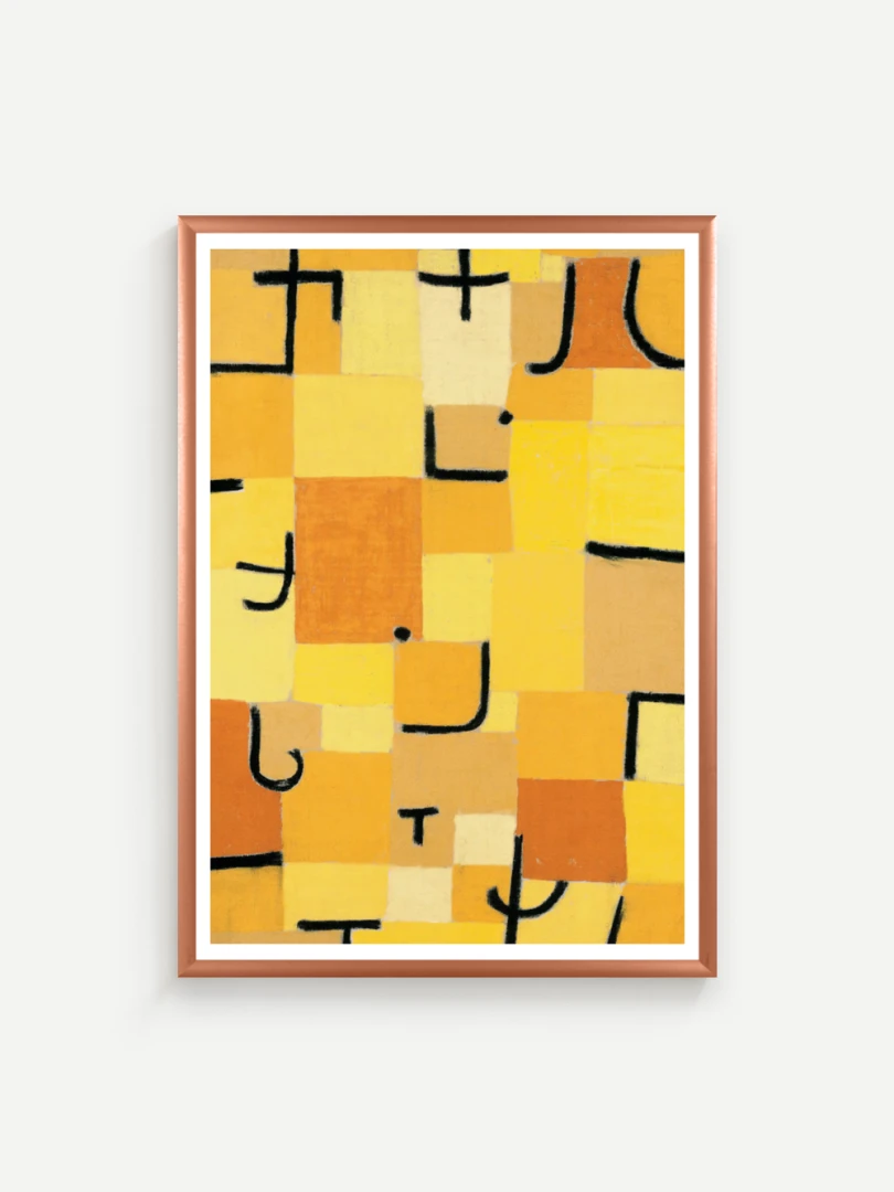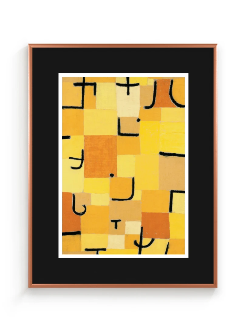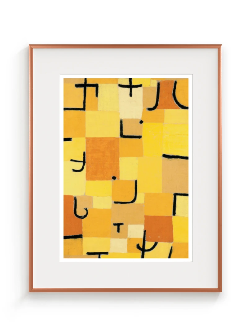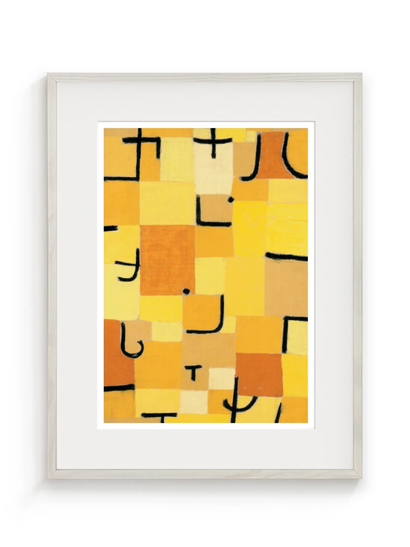 Tento print vychádza z obrazu Znaky v žltej (Zeichen in Gelb), ktorý Paul Klee vytvoril v roku 1937. Dielo je charakteristické svojou abstraktnou kompozíciou, kde sa žlté a oranžové štvorce prelínajú s čiernymi znakmi pripomínajúcimi písmo. Kleeho záujem o kombináciu farby a symbolu vytvára vizuálny jazyk, ktorý je zároveň hravý aj hlboký.